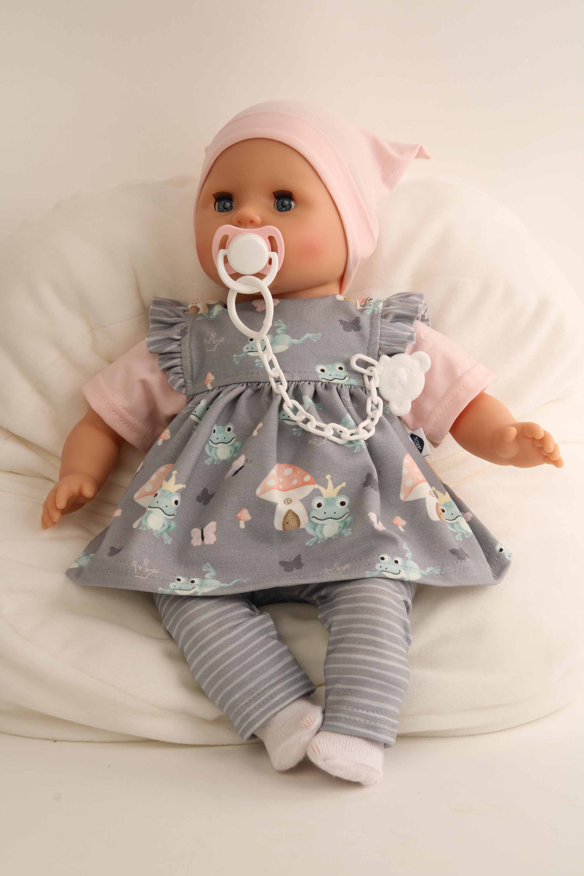 Die Kleidung besteht aus einer grauen Ringelhose, grauen Tunika mit Froschkönig-Print und eingesetzten rosa Ärmeln und einer passenden rose Mütze. Die Schnuller 0001017 und Windeln 0001034 und rosa Strümpfe (0045174 )können extra dazu bestellt werden. Die Kleidung wird komplett in Handarbeit in unserer Puppenmanufaktur in Rauenstein /Thüringen gefertigt. Diese Kleidung kann per Hand bei 30 Grad gewaschen werden. Die Puppe gehört nicht zum Lieferumfang. Achtung: nicht geeignet für Kinder unter 36 Monate, da Kleinteile sich lösen und verschluckt werden können.