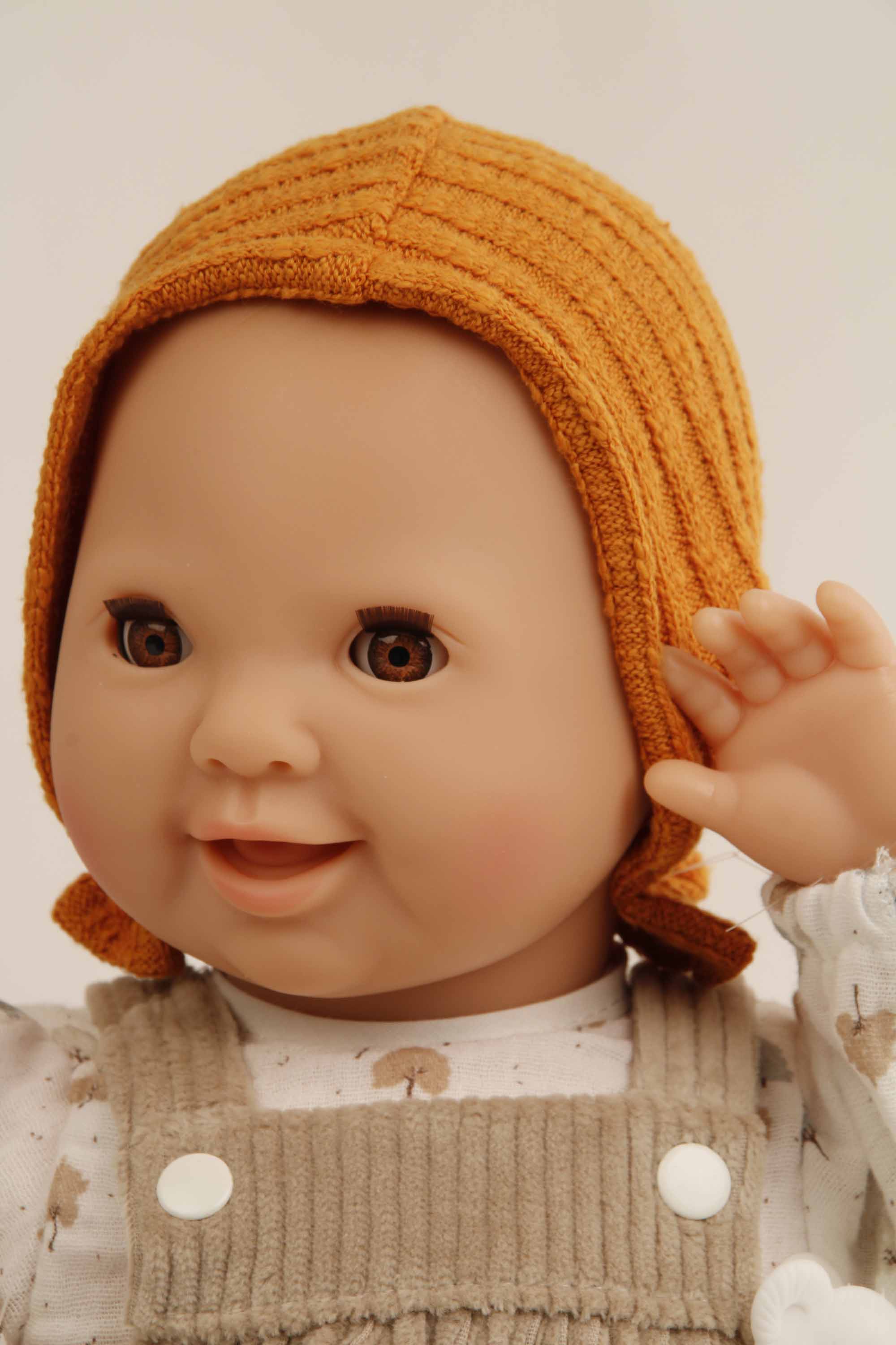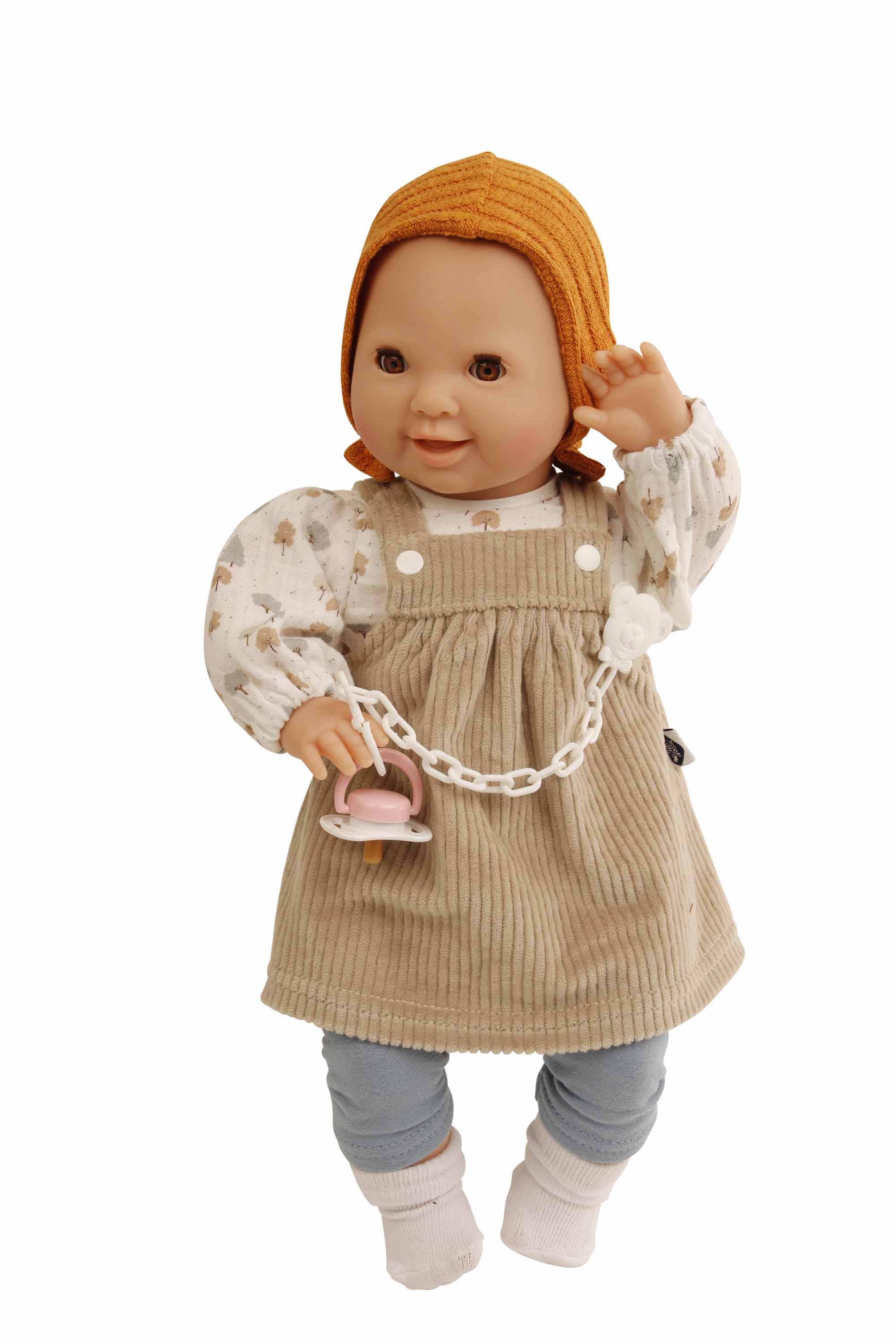 Kleidung betehend aus einer Latzhose mit Bärchendruck, einem rostbraunen Pulli und einer passenden Mütze. Die Kleidung wird komplett in Handarbeit in unserer Puppenmanufaktur in Rauenstein /Thüringen gefertigt.Diese Kleidung kann per Hand bei 30 Grad gewaschen werden. Die Puppe und der Schnuller gehören nicht zum Lieferumfang. Das Schnullerset kann unter 0001018 extra dazu bestellt werden.Die Strümpfe 0041175 müssen extra dazu bestellt werden. Achtung: nicht geeignet für Kinder unter 36 Monate, da Kleinteile sich lösen können und verschluckt werden können.
