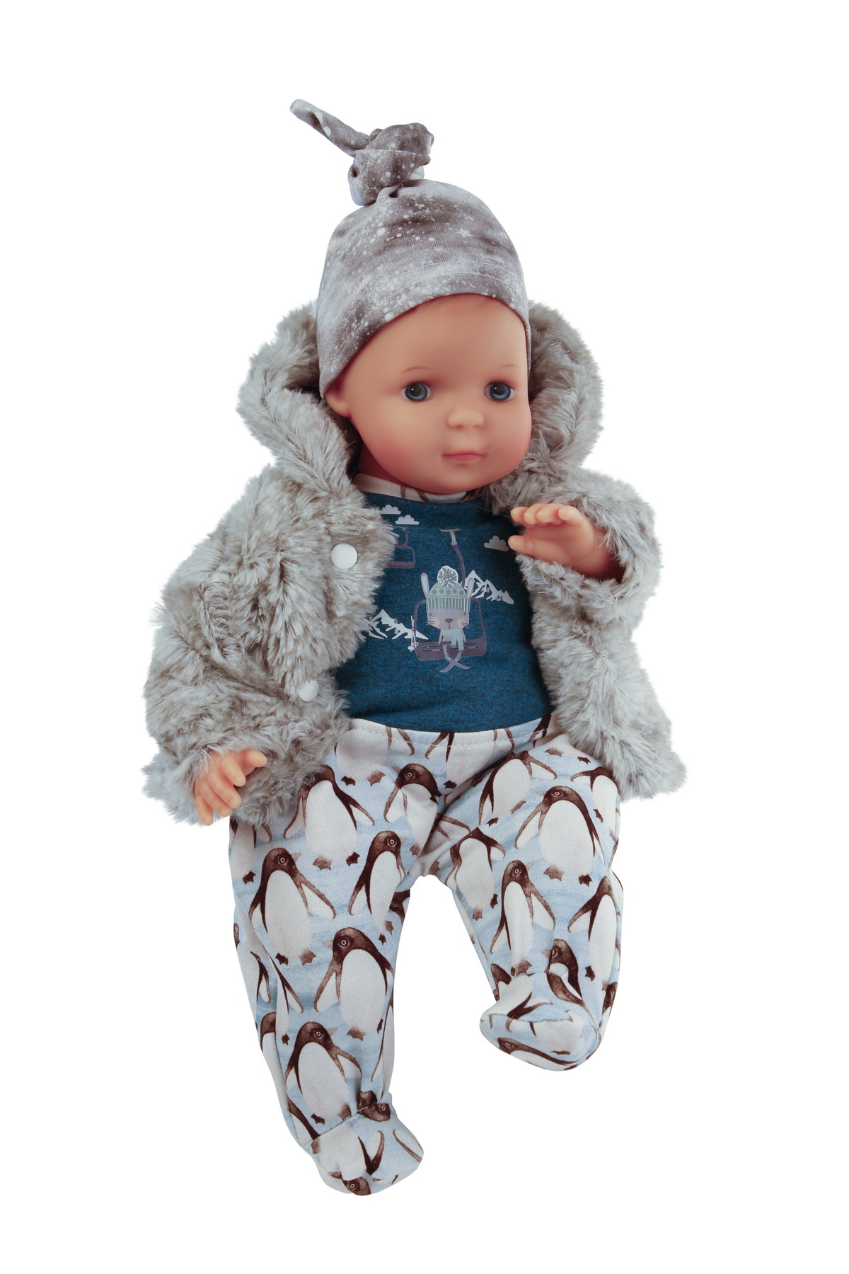 Kleidung bestehend aus einem Overall mit Pinguindruck, einer grau-melierten Mütze und einer Kapuzen-Felljacke grau. Die Kleidung wird komplett in Handarbeit in unserer Puppenmanufaktur in Rauenstein /Thüringen gefertigt.