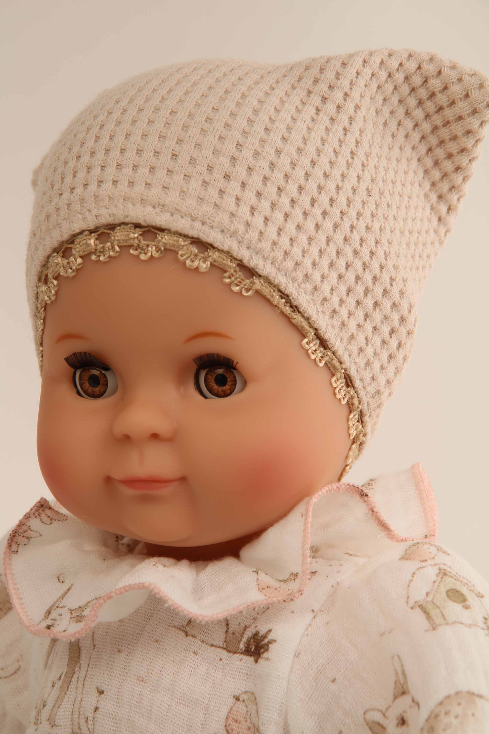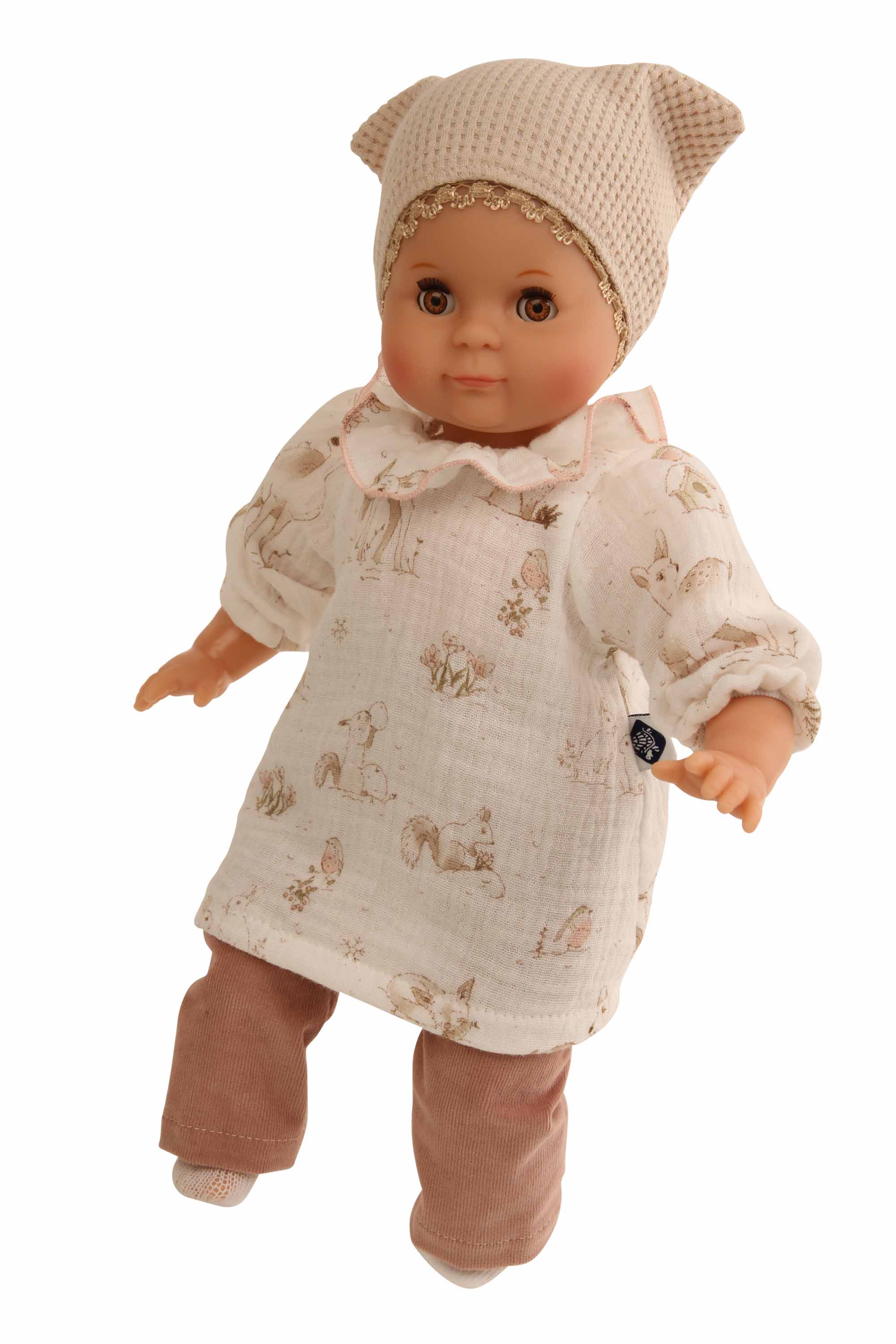 Mein erstes Schlummerle, die beliebteste und bekannteste Puppe, ohne Haare für die Kleinsten. Ein unverwechselbares Gesicht vereint Qualität und Spielwert und begeistert schon seit Generationen unsere Puppenmuttis.Die Puppe wird in unserer eigenen Puppenmanufaktur in Rauenstein/Thüringen hergestellt. Arme, Beine und Kopf sind aus Vinyl, sie hat lustige braune Schlafaugen und gemalte Haare. Das Schlummerle trägt eine rosenholzfarbige Feincordhose, eine beige Tunika mit Waldtieren bedruckt und eine beige Mütze aus Waffelpique. Die Kleidung ist von Hand bei 30 Grad waschbar. STICKEREI: Als besonderen Service bieten wir an, eine individuelle Widmung (z.B. Name und Geburtsdatum der Puppenmutti) mit einem kleinen Aufpreis auf den Puppenbauch zu sticken. Wenn Sie eine ganz persönliche Puppe für Ihr Kind möchten, dann geben Sie Ihre Wunschbestickung oben in die dafür vorgesehenen Felder ein. Achtung: Nicht geeignet für Kinder unter 36 Monaten, da Kleinteile verschluckt werden können.