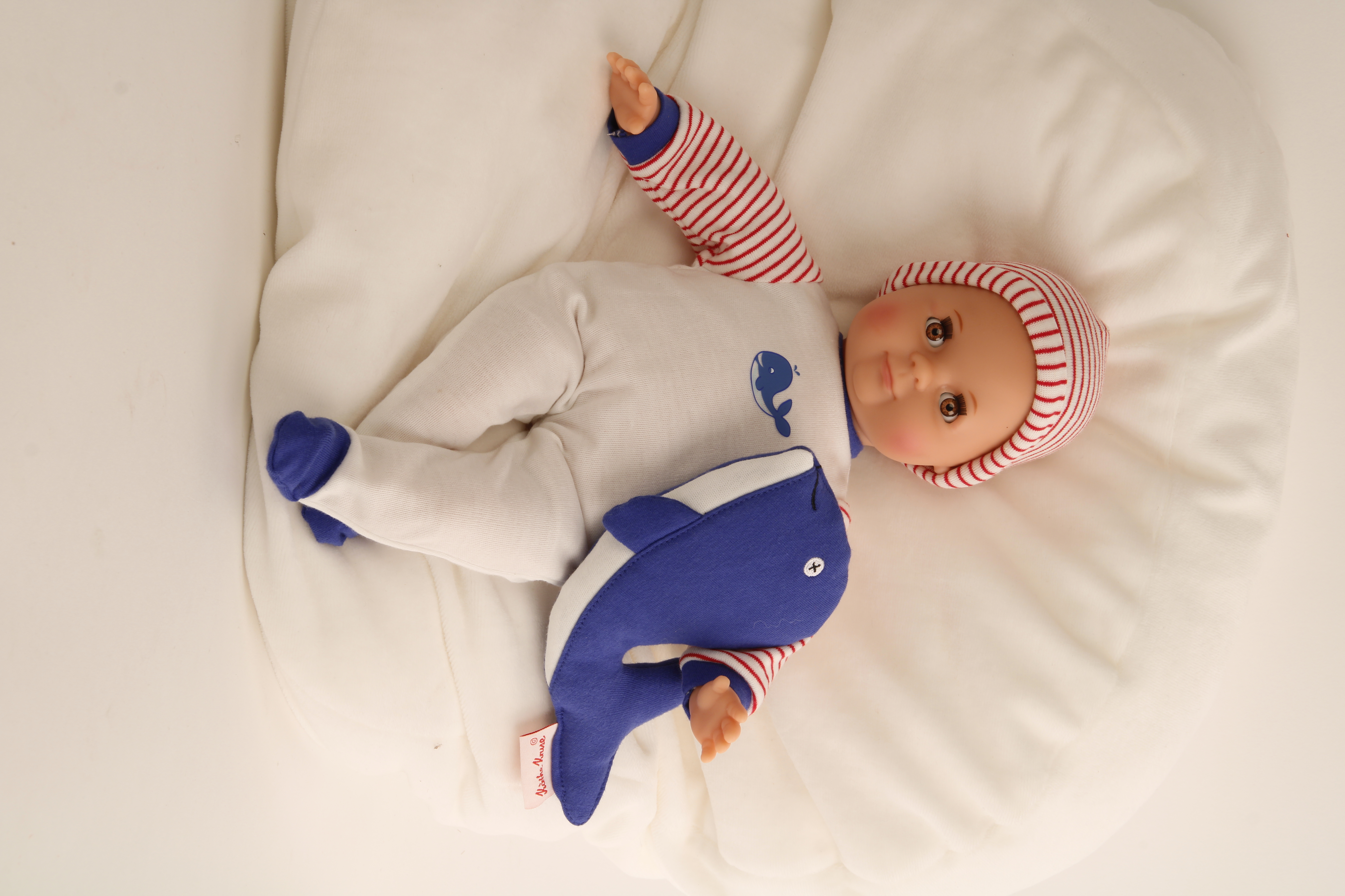 Spielanzug Gr. 32 für Schlummerle bestehend aus Overalll weiss/blau/rot mit Mütze und kleinem Spielwalfisch.