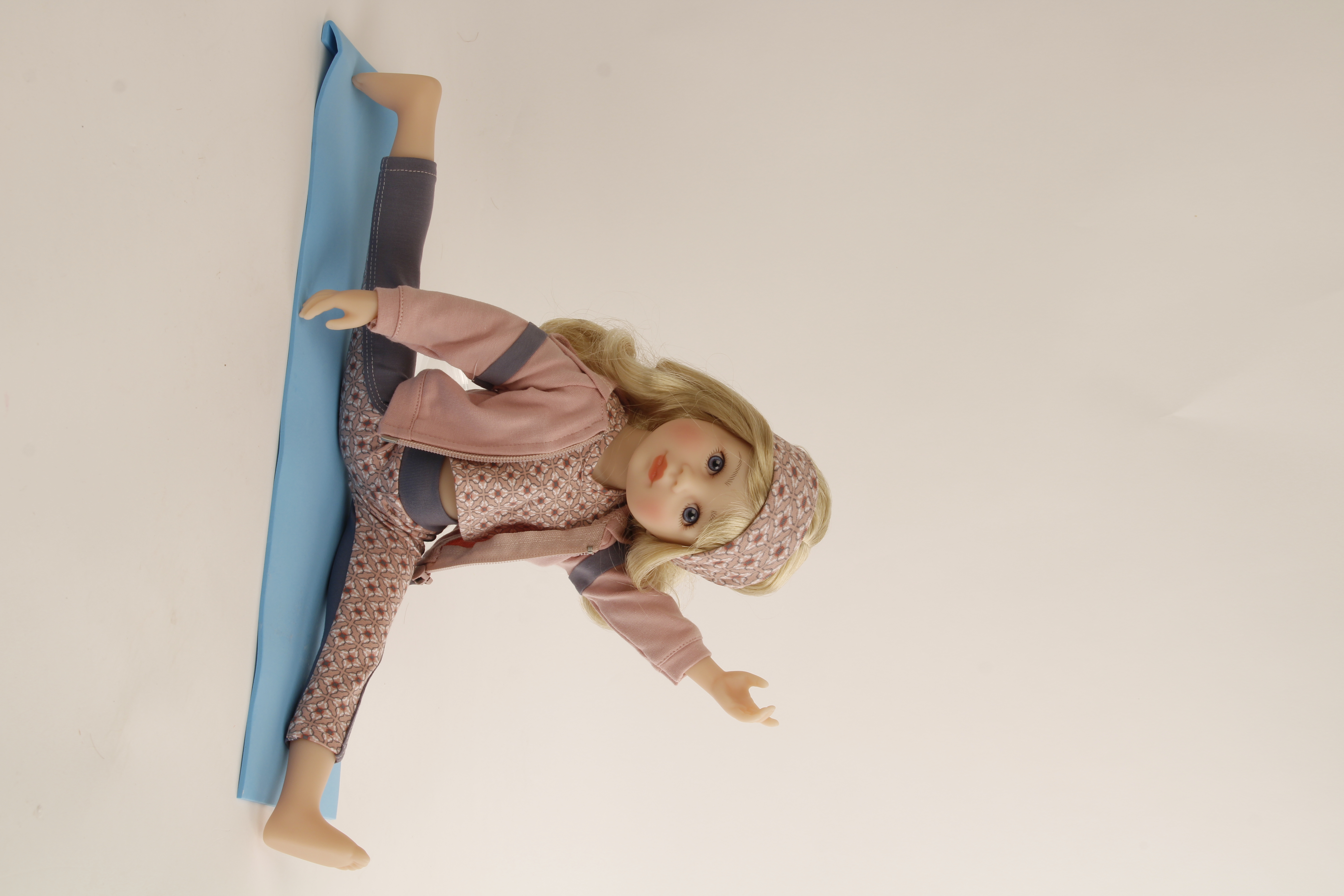 Yoga Kleidung für Stehpuppe Yella bestehend aus einer rose/blauen Hose, kurzem Shirt, Stirnband, Kapuzenjacke und Yogamatte blau.