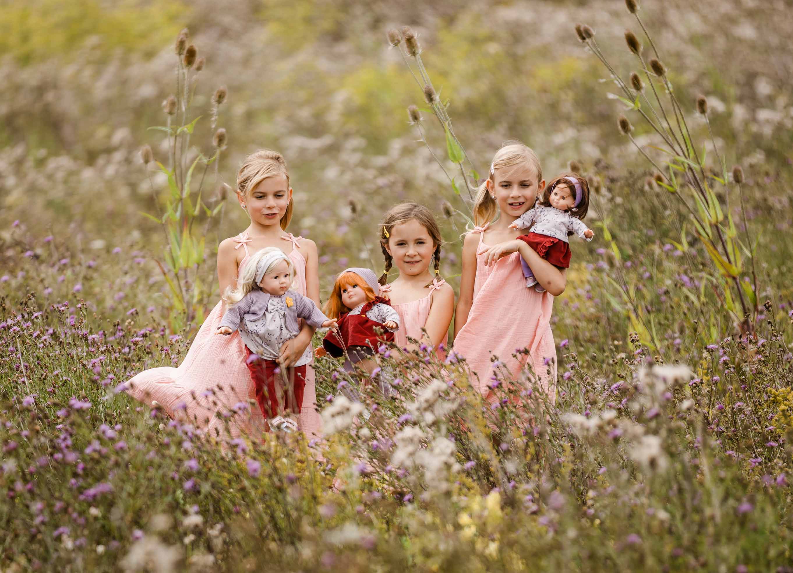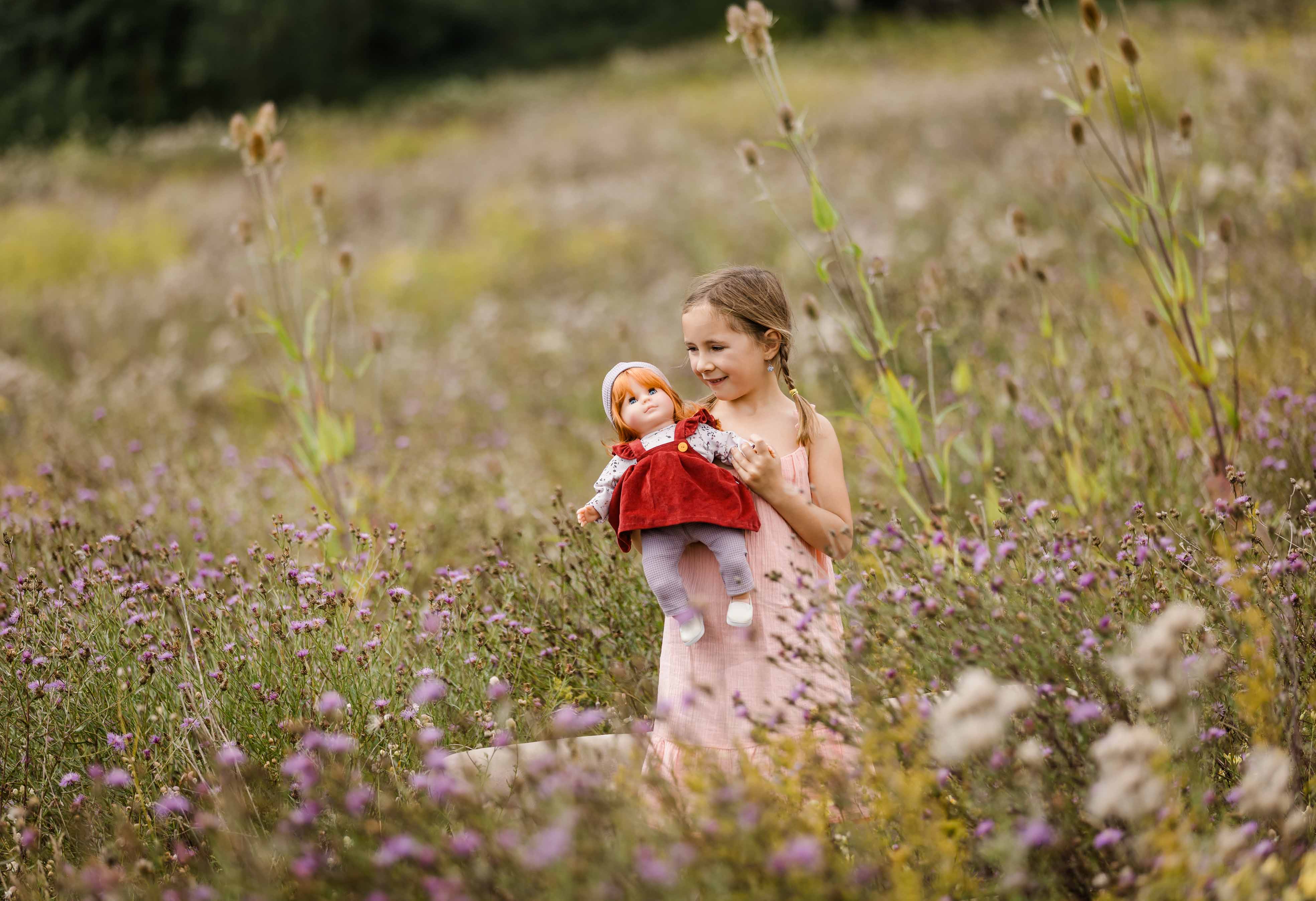 Heb mich hoch und nimm mich in deine Arme! Hanni, mit einer Größe von 45 cm, ist das perfekte Puppenkind zum Liebhaben für Kinder ab 36 Monaten. Ihr weicher Stoffkörper, die funkelnden Schlafaugen und der bunte Mix an Stoffen sorgen dafür, dass sie immer bereit ist für jede Menge Abenteuer! Die Arme, Beine und der Kopf von Hanni sind aus hochwertigem Vinyl gefertigt, während ihr kuschelweicher, samtiger Körper mit einem Granulatsäckchen im Po sie zu einem wahren Schatz zum Knuddeln und Verwöhnen macht. Das eingesteppte, kämmbare rote Haar lädt dazu ein, kreativ zu werden und Hanni nach Herzenslust zu frisieren. Ihre funkelnden blauen Schlafaugen sorgen dafür, dass sie auch wie ihre Puppenmutti am Abend schön einschlafen kann. Hanni trägt eine moderne Spielkleidung mit Cordrock und Blumennshirt und passender lila Mütze. Die Kleidung ist leicht an- und auszuziehen und kann bei 30 Grad gewaschen werden kann – für unbeschwerten Spielspaß! Jede Puppe wird mit viel Liebe und Sorgfalt in unserer eigenen Puppenmanufaktur in Rauenstein, Thüringen, hergestellt.