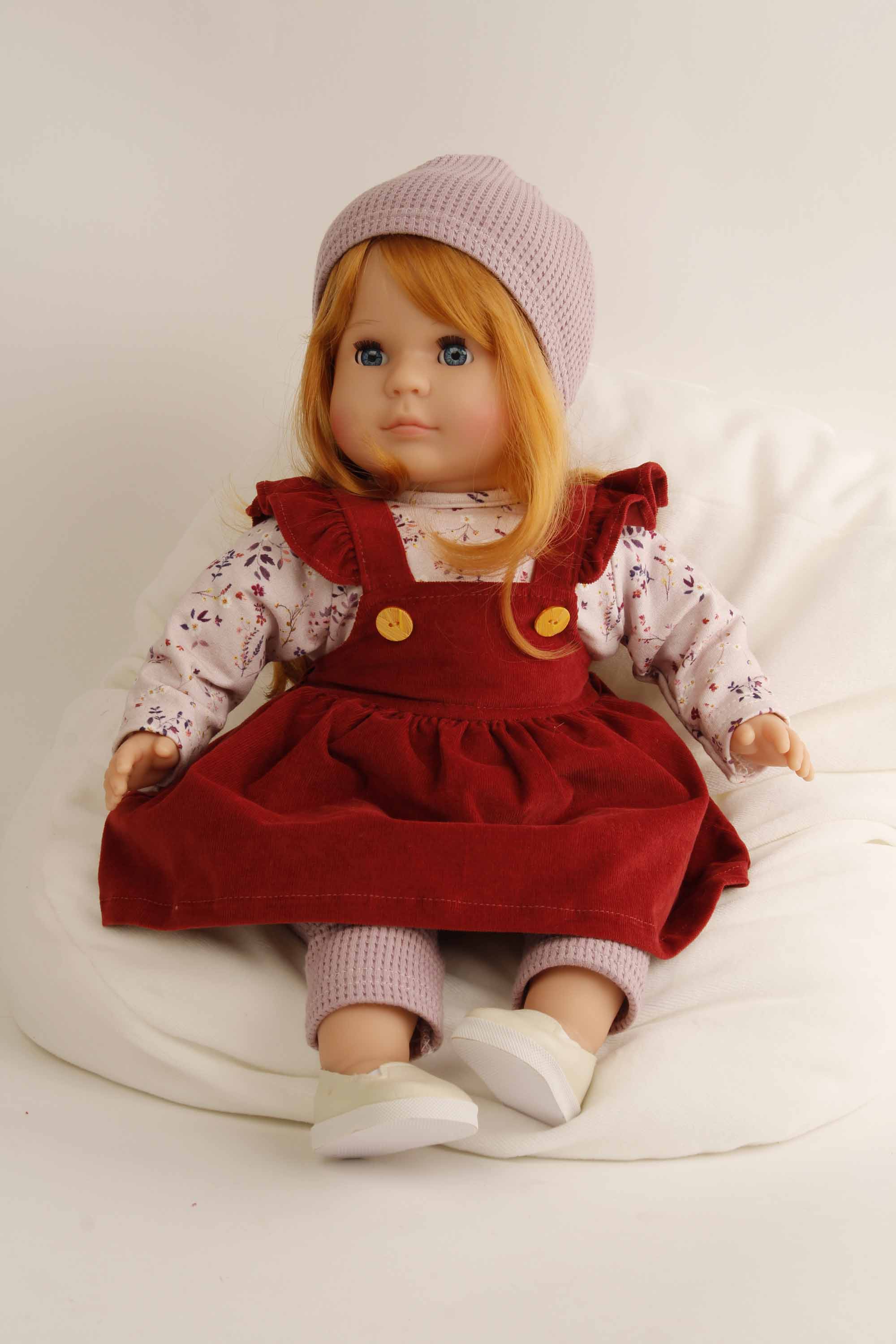 Die Kleidung besteht aus einer lila Hose in Waffeloptik, einem Blumenpullover, einem weinroten Trägerrock aus Feincord und einer passenden lila Mütze. Die Schuhe 0045092 müssen separat dazu bestellt werden Die Kleidung wird komplett in Handarbeit in unserer Puppenmanufaktur in Rauenstein /Thüringen gefertigt. Diese Kleidung kann per Hand bei 30 Grad gewaschen werden. Die Puppe gehört nicht zum Lieferumfang. Achtung: nicht geeignet für Kinder unter 36 Monate, da Kleinteile sich lösen und verschluckt werden können.