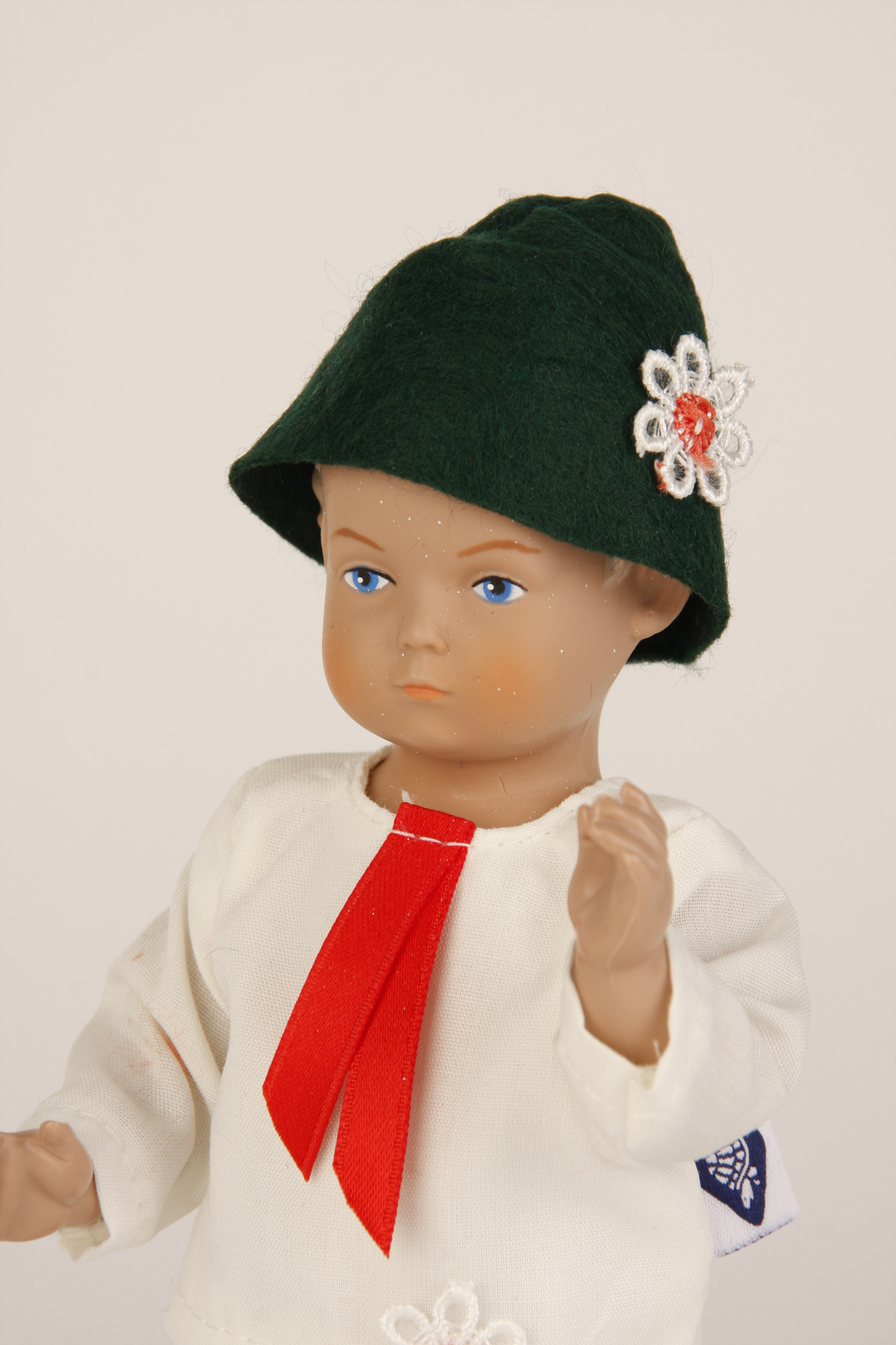 Dieser kleine Hans, der natürlich gegenüber seinem ganz großen Bruder zierlich daherkommt sieht besonders liebreizend aus. Aber auch er spielt natürlich eine ganz große Rolle als Puppenstubenpuppe und wurde auch als diese sehr bespielt. Er passt auch ganz lieb zu seinen kleinen Geschwistern Inge, Ursel und Bärbel. Der kleine Hans ist auch als kleine Puppe für die Großen zum Spielen geeignet. Er ist gekleidet in eine sommerliche Kleidung im bayrischen Stil. Diese Größe ist ein Kopf-Rumpf-Modell (der Kopf ist fest mit dem Rumpf verbunden) mit blauen Malaugen. Die Puppe ist in unserer Puppenmanuafaktur in Rauenstein hergestellt.