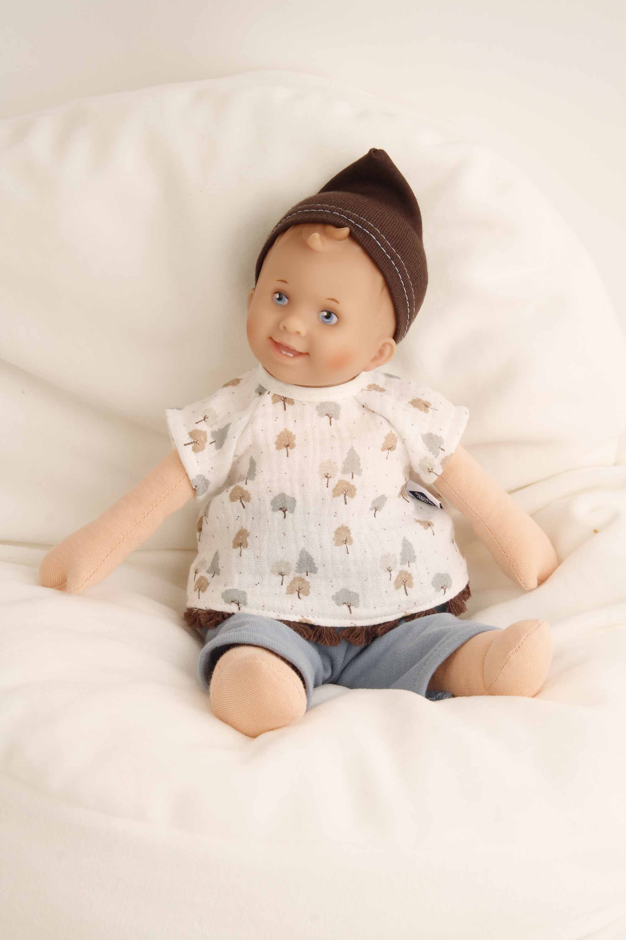Kleidung bestehend aus einer langen blauen Hose, einem Shirt mit Bäumen bedruckt und einer passenden braunen Mütze. Die Kleidung ist bei 30 Grad per Hand waschbar. Diese Kleidung paßt auch unserer Puppe Mein 1. Baby Gr. 28. und dem Löckchen Gr. 30 Diese Kleidung wurde komplett in Handarbeit in unserer Puppenmanufaktur in Rauenstein/Thüringen gefertigt.Die Puppe gehört nicht zum Lieferumfang.