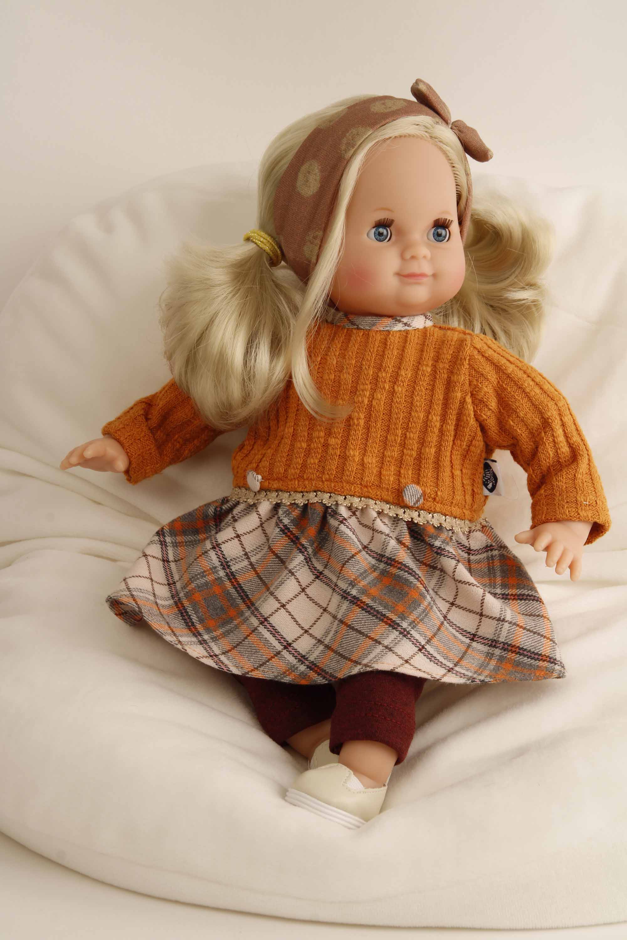 Die Puppe wird in unserer eigenen Puppenmanufaktur in Rauenstein/Thüringen hergestellt. Arme, Beine und Kopf sind aus Vinyl, sie hat lustige blaue Schlafaugen, sowie strapazierfähige, kämmbare, eingesteppte blonde Haare. Die Puppe trägt eine moderne Spielkleidung in den Trendfarben orange/weinrot/braun, dieser ist leicht an- und ausziehbar und bei 30 Grad per Hand waschbar.