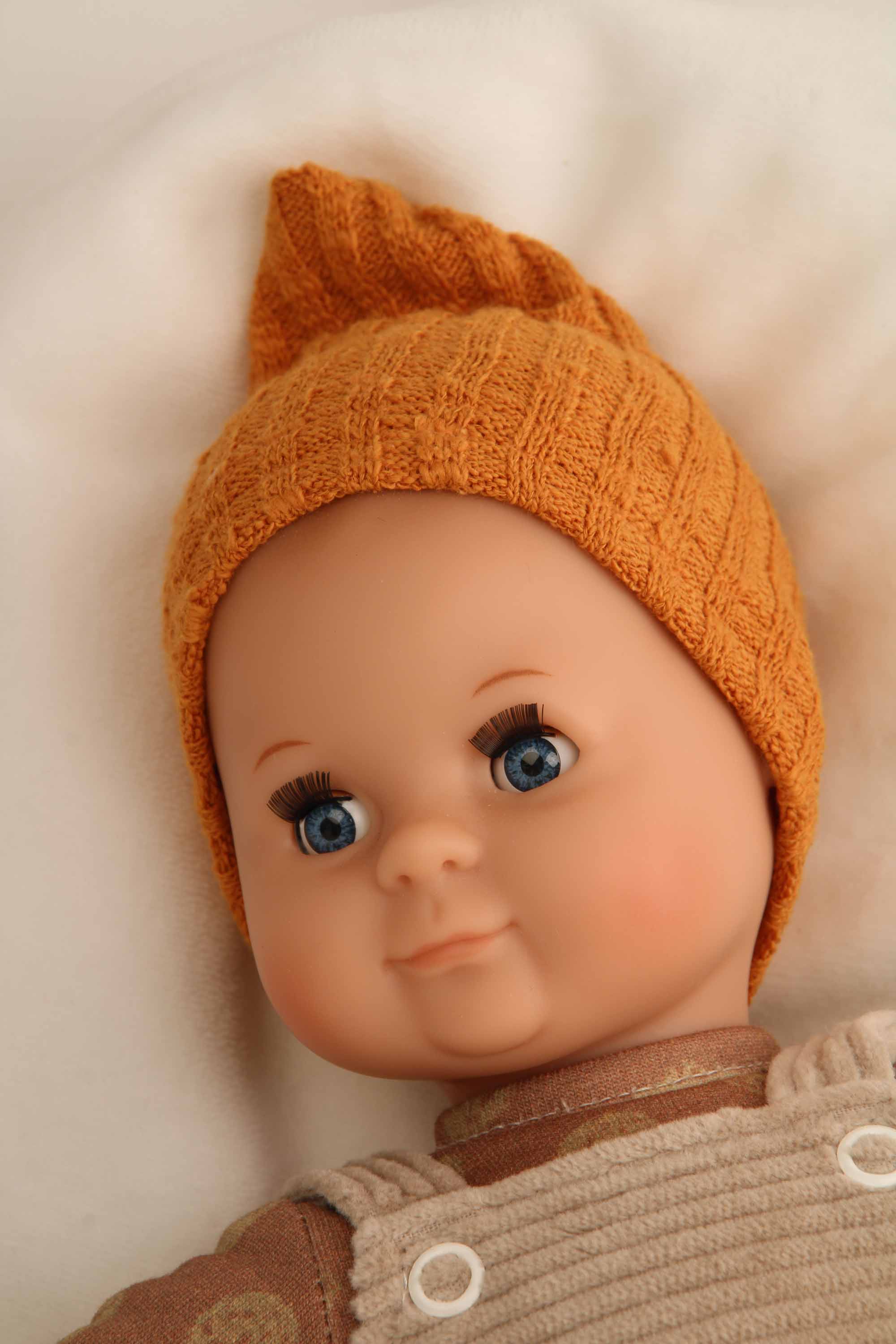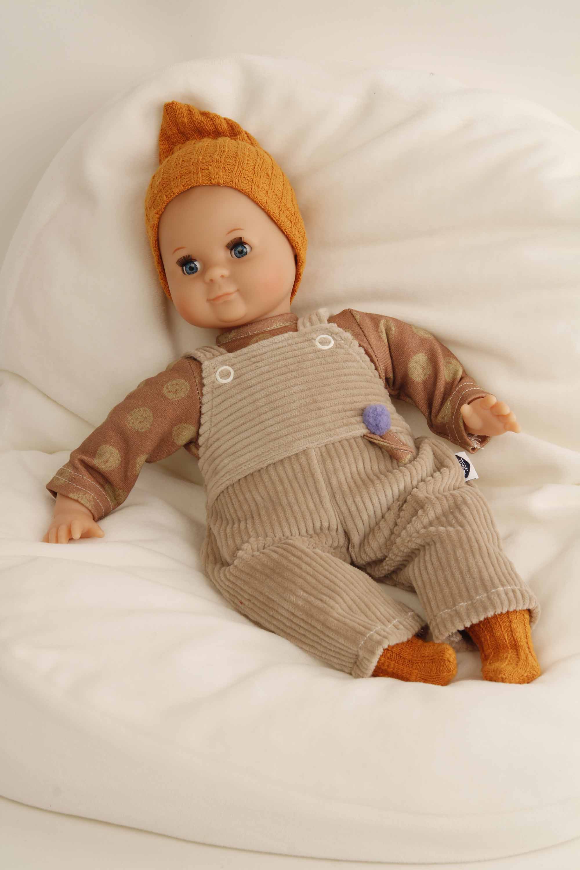Puppe Schlummerle 32 cm mit Malhaar und blauen Schlafaugen, Kleidung braun/orange