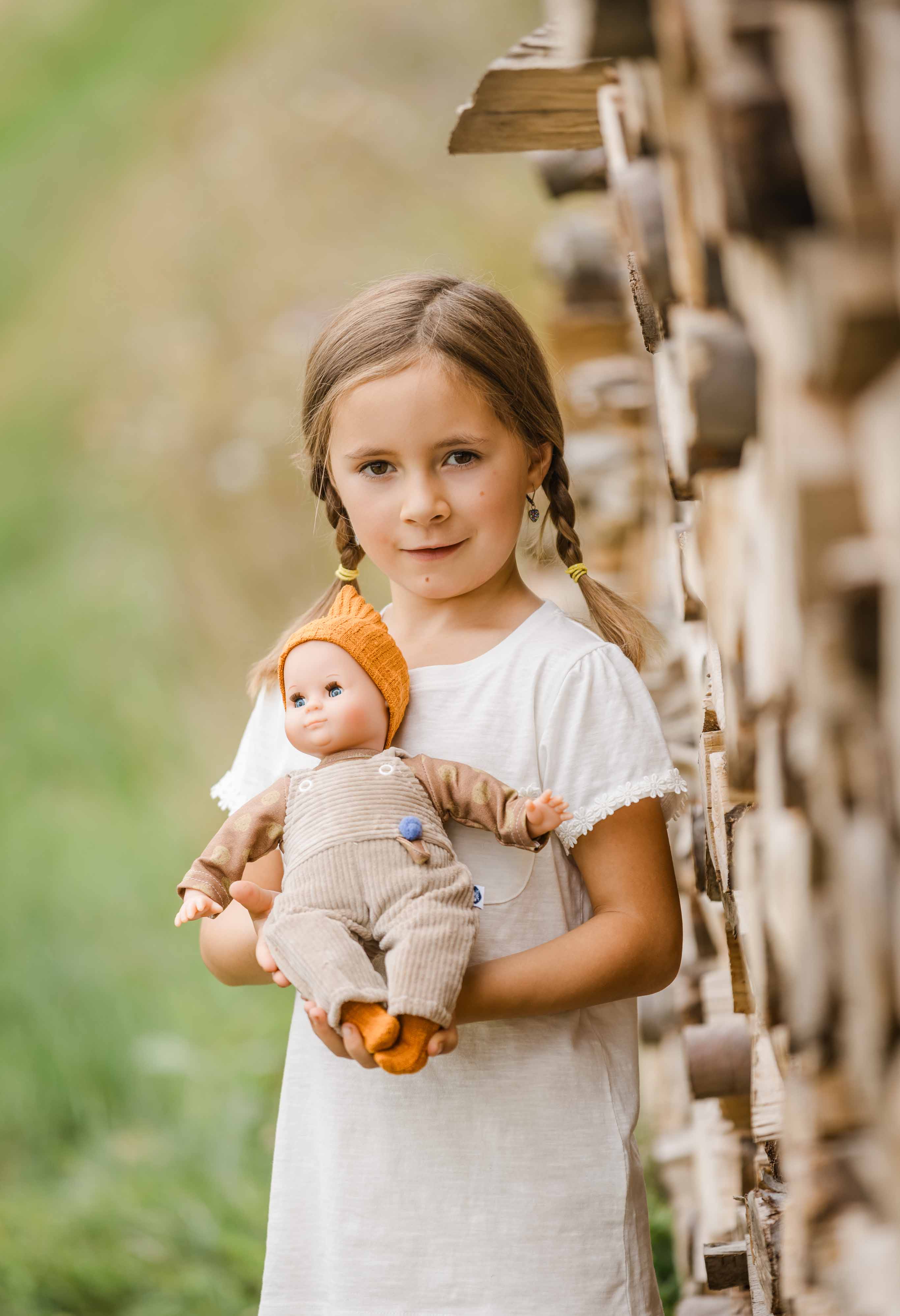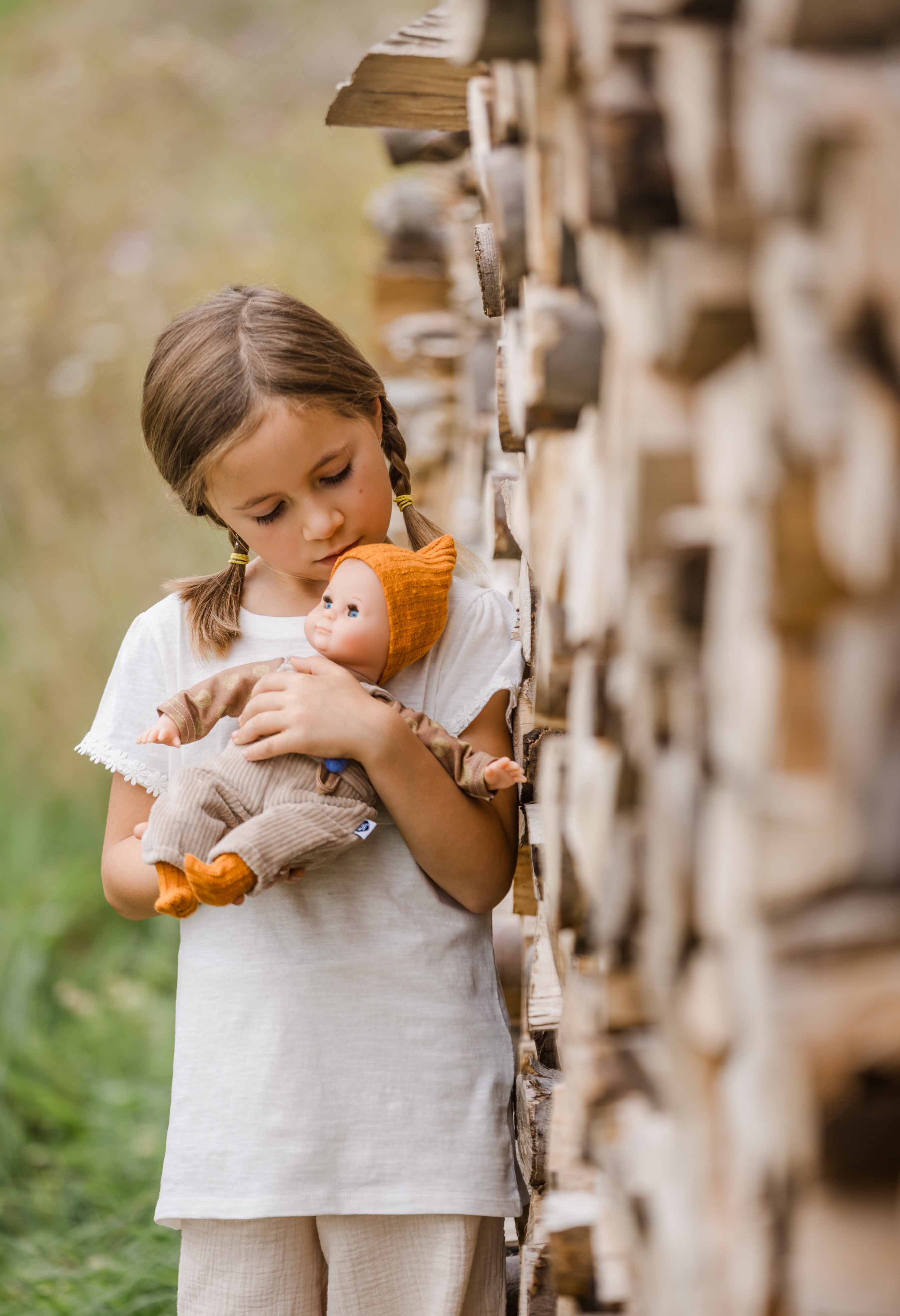 Kleidung bestehend aus rosenholzfarbiger Feincordhose, langer Tunika mit Waldtieren bedruckt und Mütze aus Waffelpiquet. Die Strümpfe 0034175 müssen extra dazu bestellt werden. Die Kleidung wird komplett in Handarbeit in unserer Puppenmanufaktur in Rauenstein /Thüringen gefertigt. Diese Kleidung kann per Hand bei 30 Grad gewaschen werden. Die Puppe gehört nicht zum Lieferumfang. Achtung: nicht geeignet für Kinder unter 36 Monate, da Kleinteile sich lösen können und verschluckt werden können.
