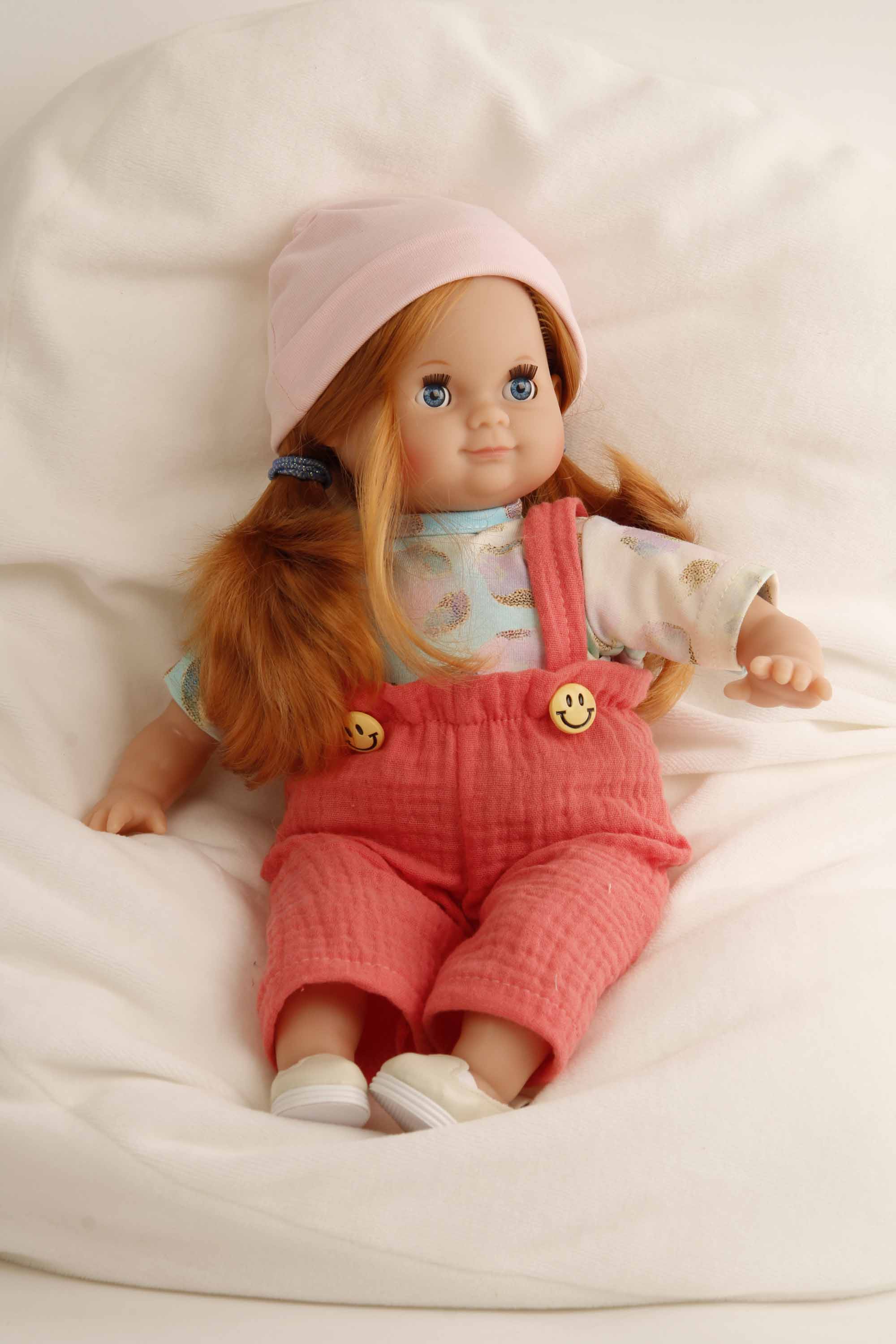 Die Puppe wird in unserer eigenen Puppenmanufaktur in Rauenstein/Thüringen hergestellt. Arme, Beine und Kopf sind aus Vinyl, sie hat lustige blaue Schlafaugen, sowie strapazierfähige, kämmbare, eingesteppte rote Haare. Es trägt eine moderne Spielkleidung in einem bunten Farbmix, diese ist leicht an- und ausziehbar und bei 30 Grad per Hand waschbar.