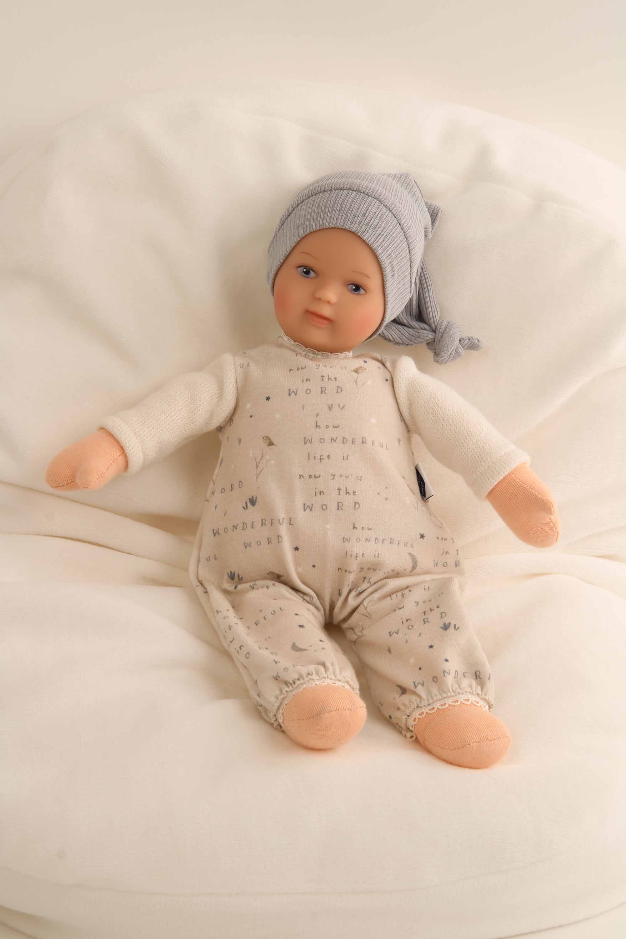 Puppe Schmuserle 30 cm Malhaar, blaue Malaugen, Kleidung blau/beige