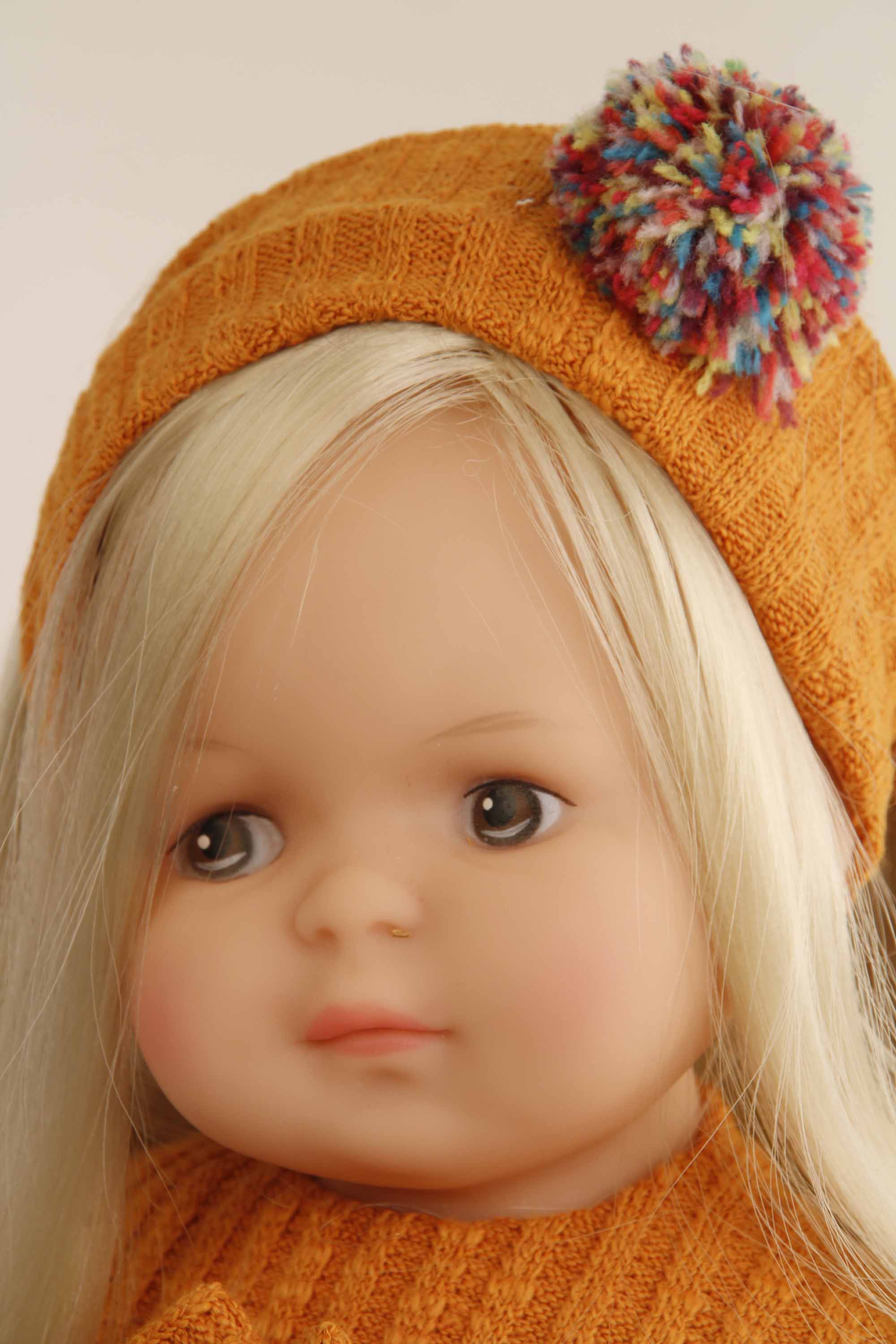 Produktinformationen "Puppe Strampelchen 37 braune Haare, braune Malaugen, Winterkleidung weinrot/braun/orange"