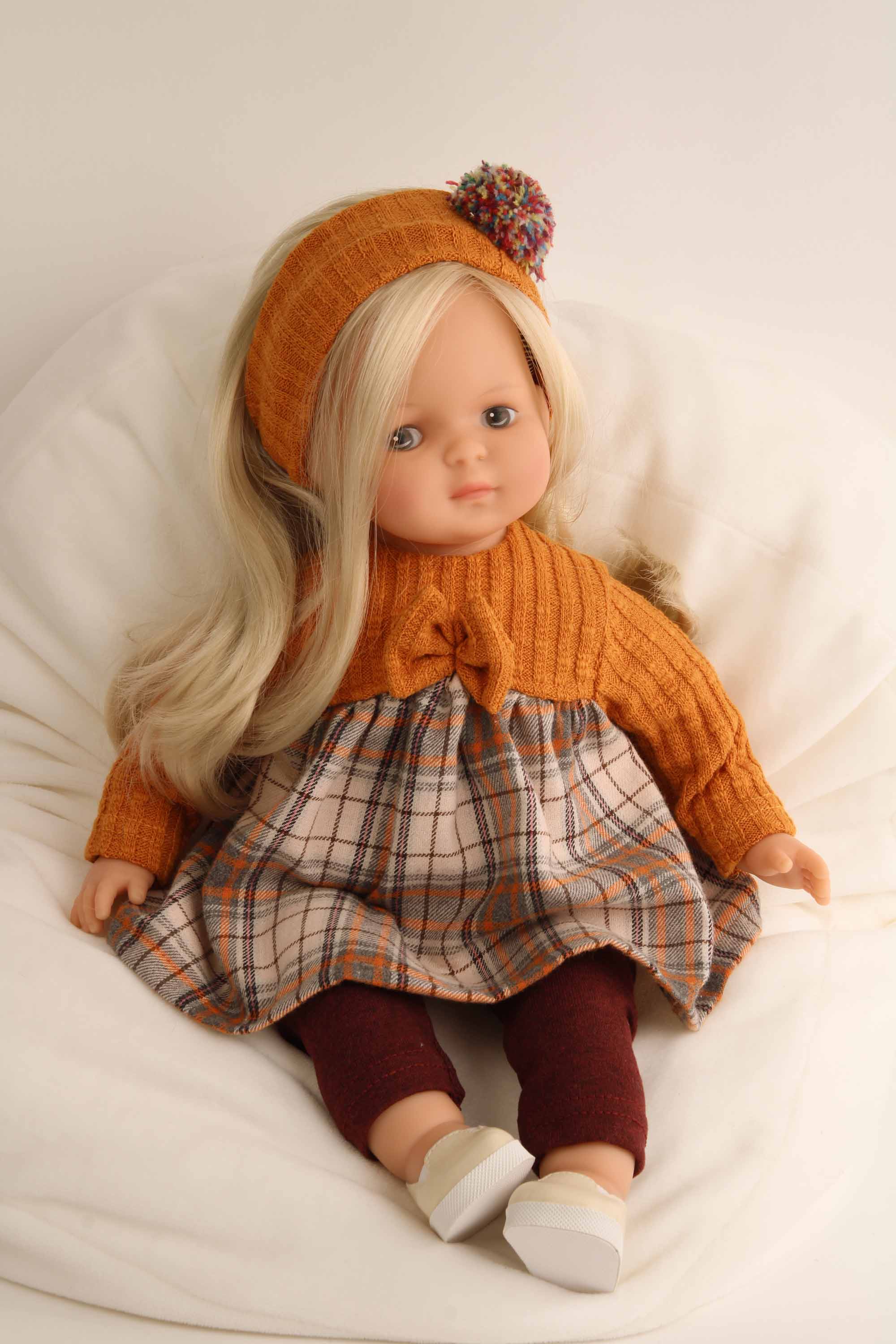 Kleidung bestehend aus Hose weinrot, Karokleid mit organgem Strickoberteil und passendem Haarband. Die Steckschuhe 0037092 können extra dazu bestellt werden. Die Kleidung wird komplett in Handarbeit in unserer Puppenmanufaktur in Rauenstein /Thüringen gefertigt. Diese Kleidung kann per Hand bei 30 Grad gewaschen werden.Die Puppe gehört nicht zum Lieferumfang. Achtung: nicht geeignet für Kinder unter 36 Monate, da Kleinteile sich lösen können und verschluckt werden können.