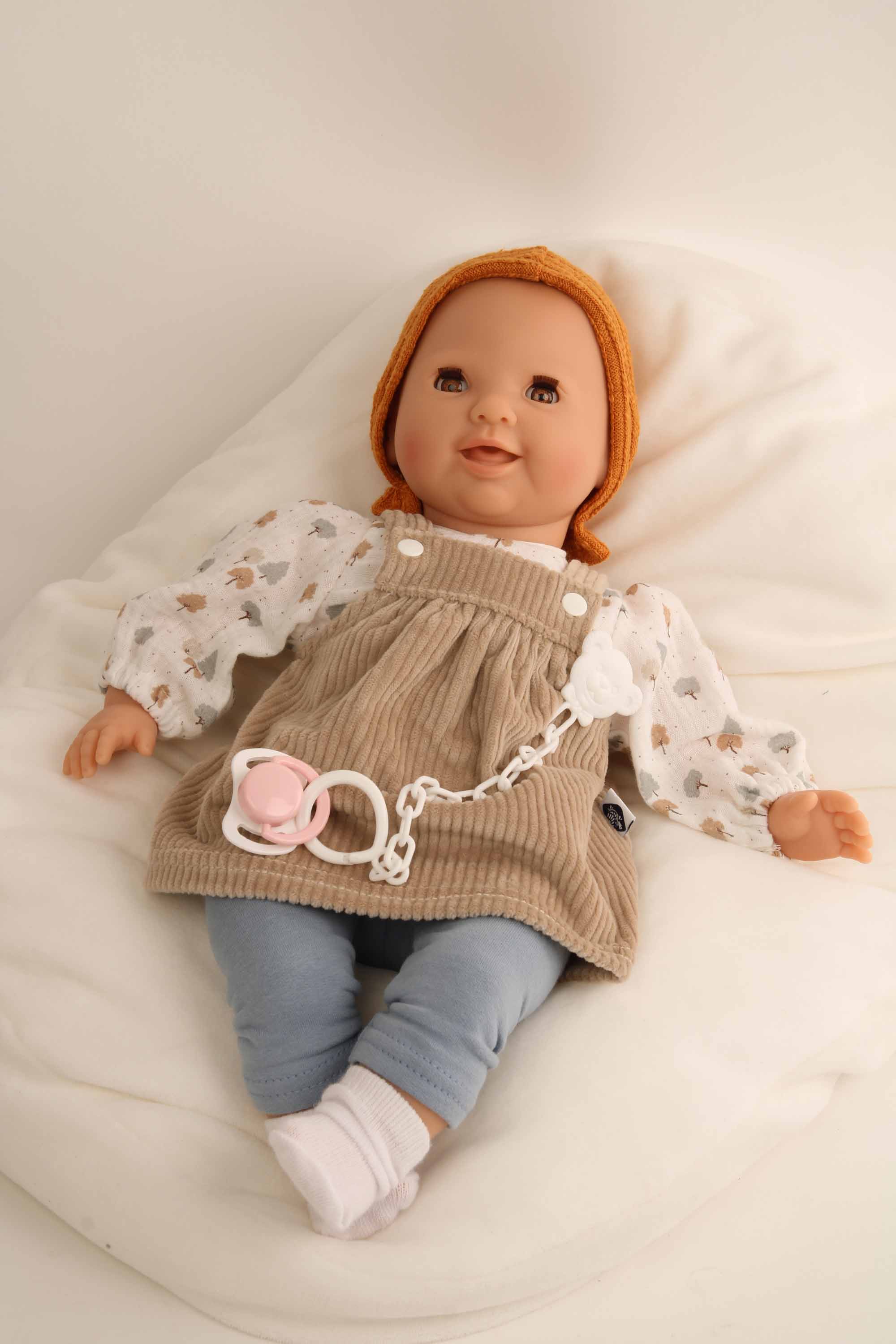 Schnullerbaby Lenchen 37 cm, Malhaar, braune Schlafaugen, Kleidung braun/orange/blau/weiss