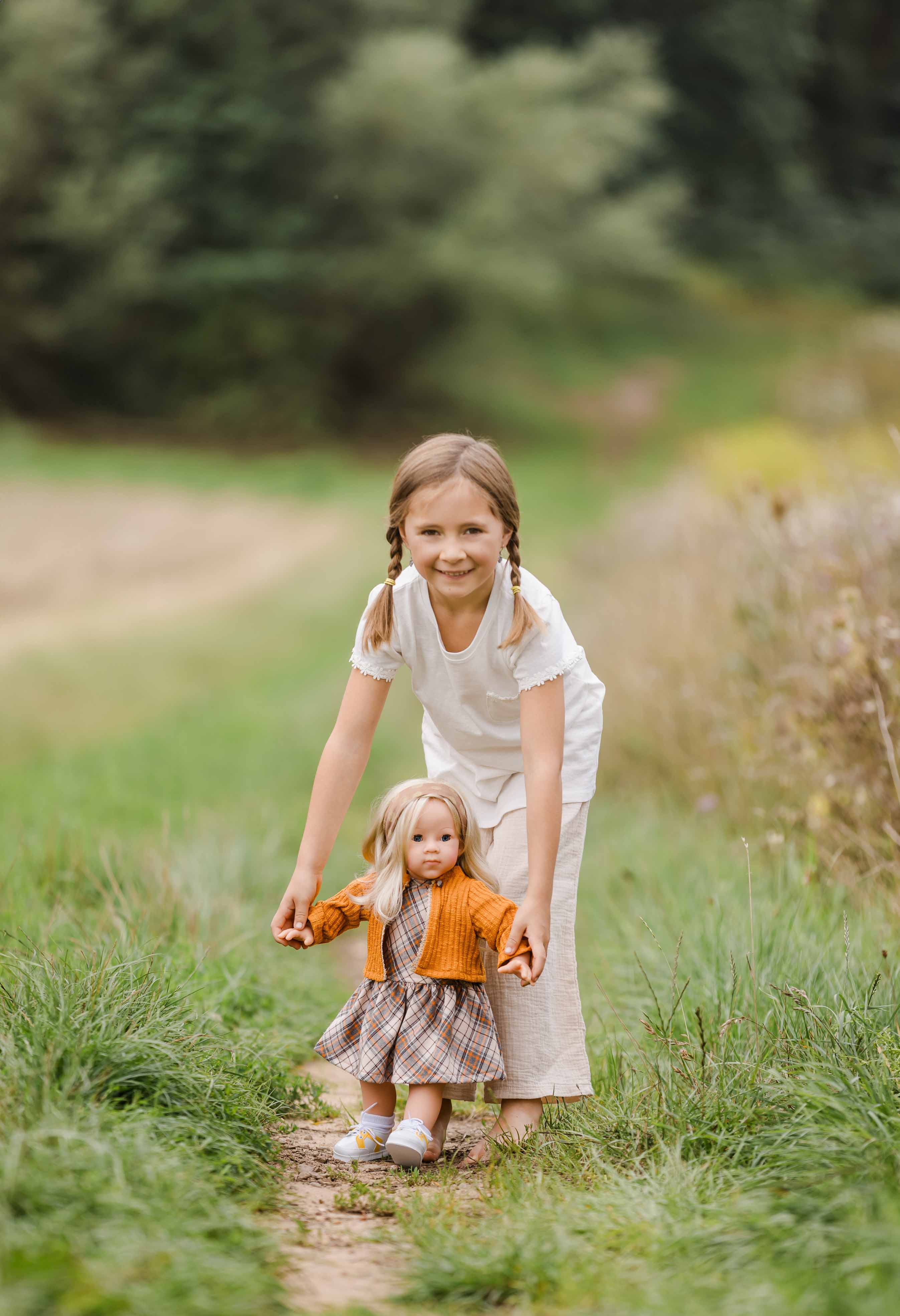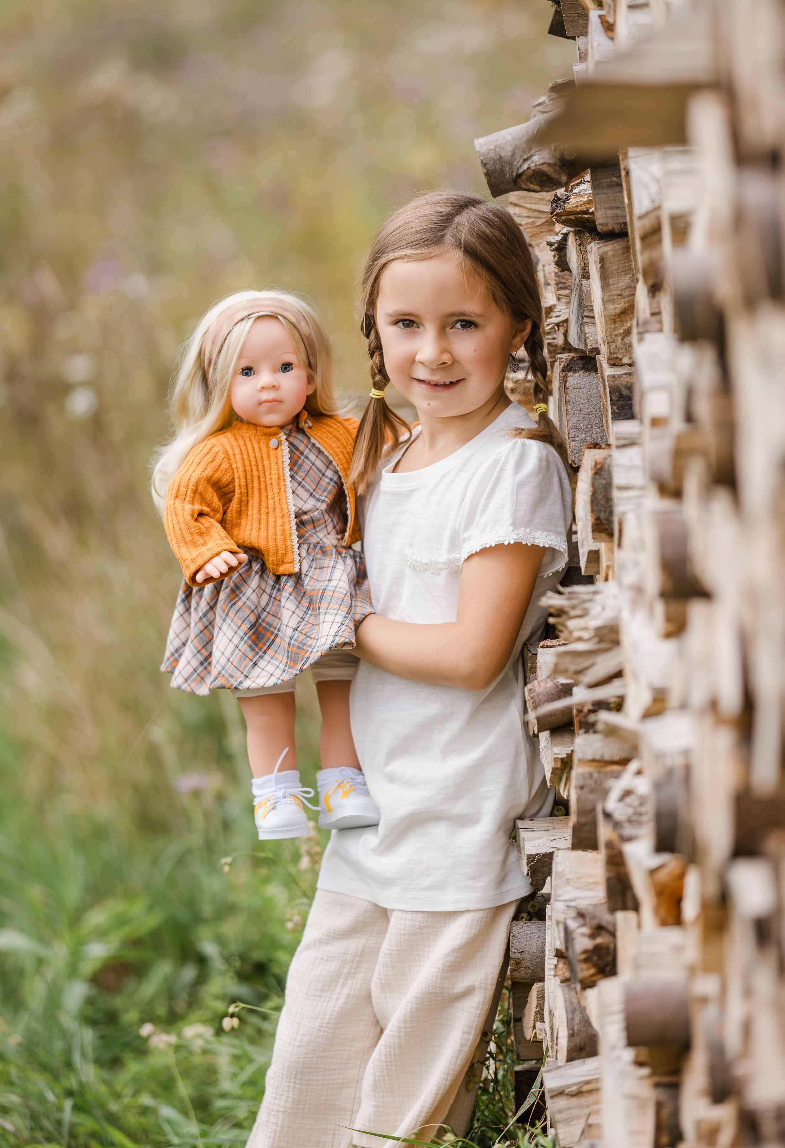 Heute macht Elli ganz schick oder zeigt sich im angesagten Urban Style – perfekt für jeden Anlass! Unsere Stehpuppe „Elli“ in Größe 52 von Elisabeth Lindner begeistert mit funkelnden Schlafaugen und kämmbarem, eingesteppten blonden Haaren. Der Kopf, die Arme und die Beine sind aus hochwertigem Vinyl gefertigt, während der weiche Stoffkörper mit einem eingebauten Drahtgestell für hohe Beweglichkeit sorgt. So kann Elli ganz selbstständig stehen und ist bereit für alle Abenteuer! Elli wurde gestaltet von der bekannten Puppenkünstlerin Elisabeth Lindner und sie sind die idealen Begleiter für Kinder von heute – man muss sie einfach liebhaben! Elli trägt ein Karokleid mit oranger Jacke und Stirnband. Diese kann bei 30 Grad gewaschen werden. Hergestellt in unserer Puppenmanufaktur in Rauenstein, ist Elli die perfekte Freundin für kreative Spielstunden und unvergessliche Momente!