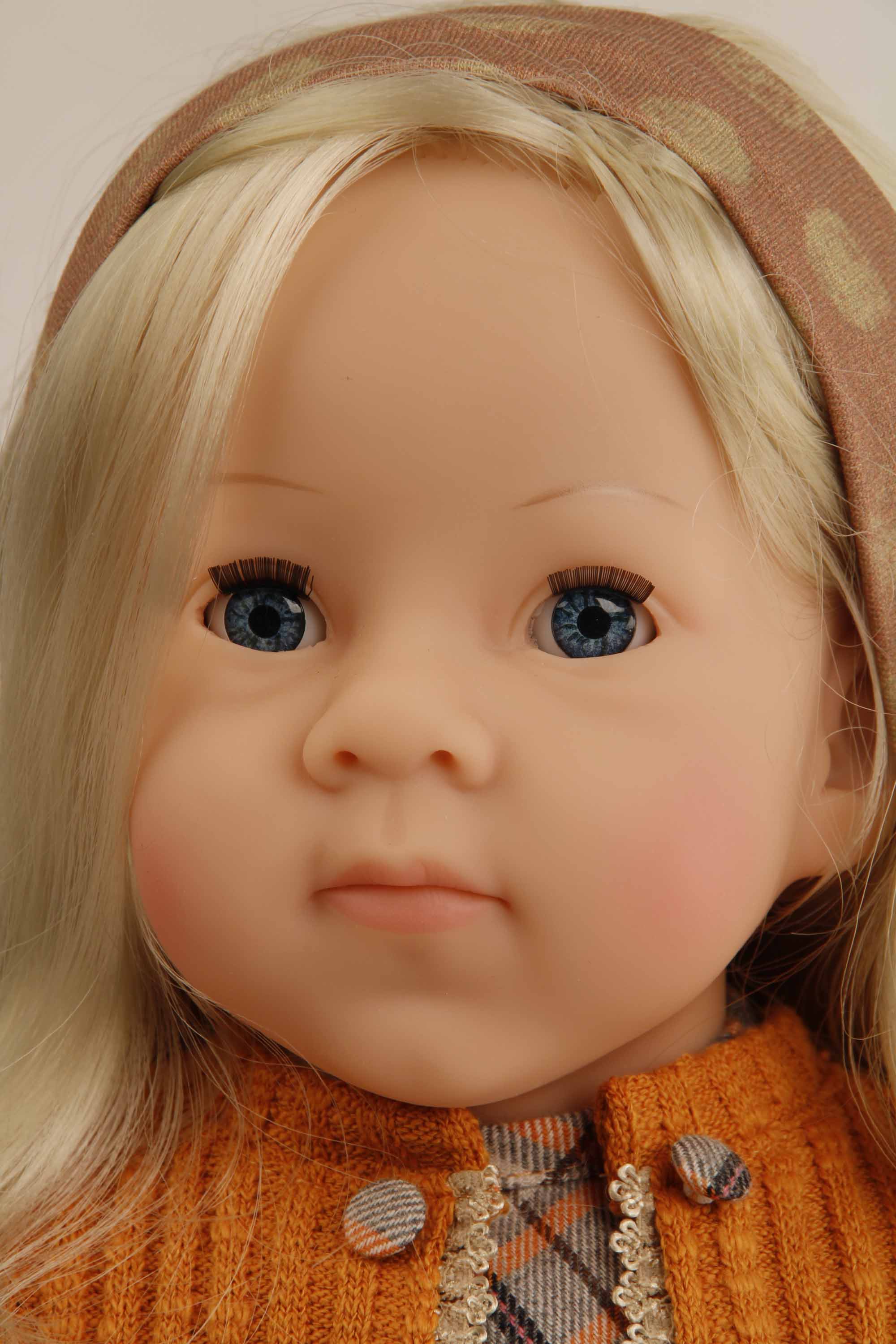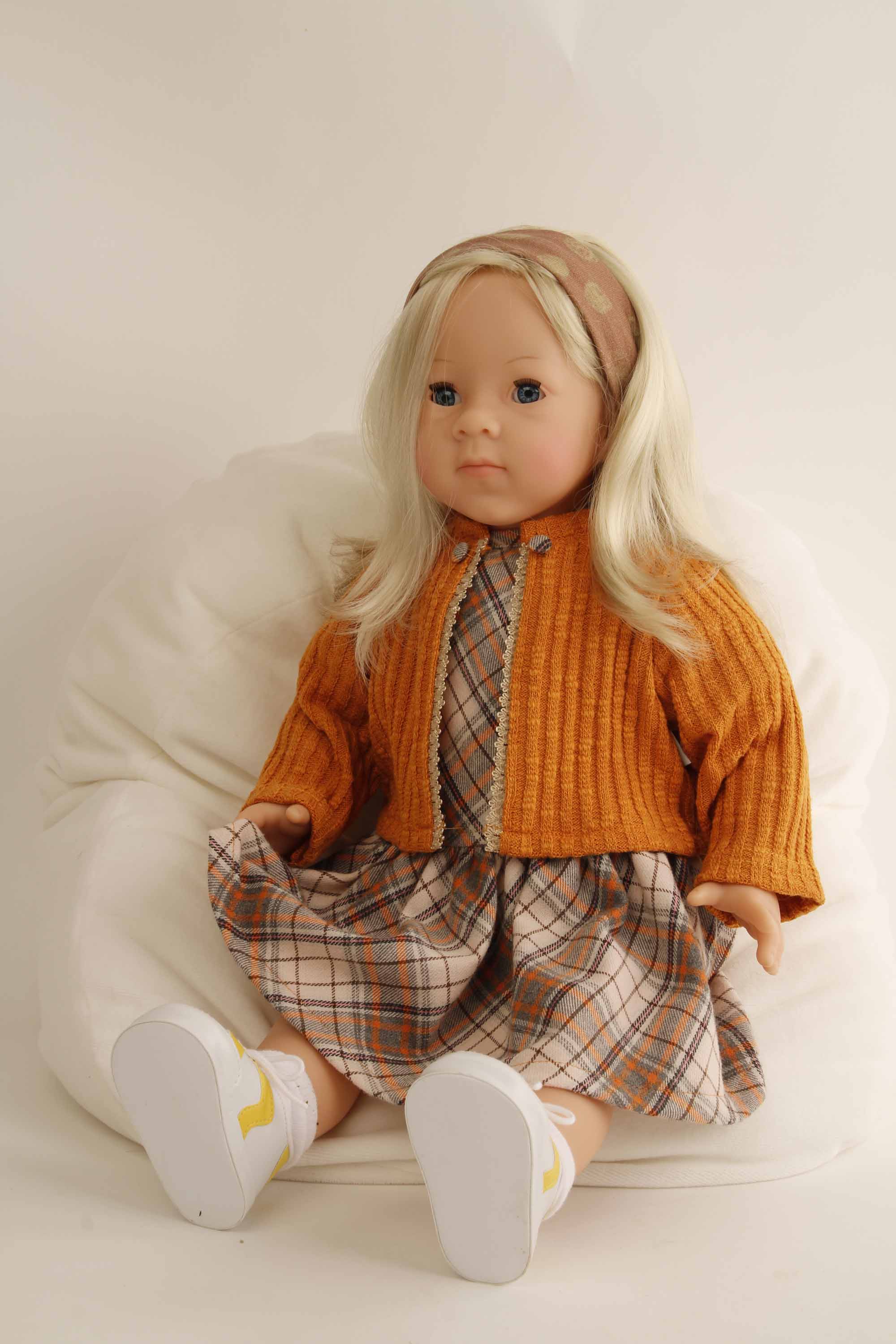 Stehpuppe Elli 52 cm blonde Haare, blaue Schlafaugen, Karokleid mit Jacke braun/orange