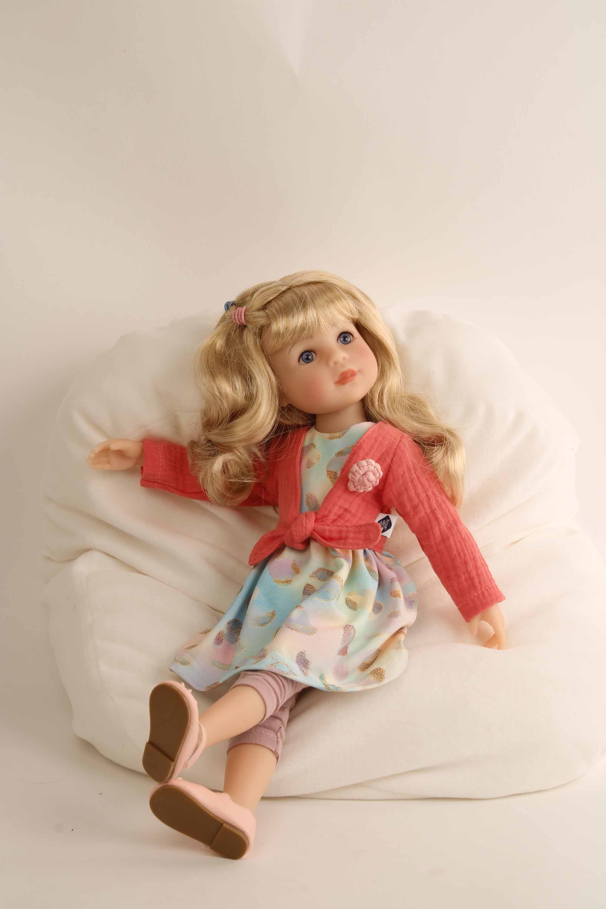 Kleidung für Stehpuppe Yella bestehend aus einem rose getupftem, langärmlichen Kleid, einer Bouclejacke, einem Stirnband und Schlüpfer. Die Kleidung wird komplett in Handarbeit in unserer Puppenmanufaktur in Rauenstein /Thüringen gefertigt. . Die Ballerinas können extra unter 0046180 bestellt werden.Es passen hier die Strümpfe 0034175 oder 0034173 rose. Diese Kleidung kann per Hand bei 30 Grad gewaschen werden. Die Puppe gehört nicht zum Lieferumfang. Achtung: nicht für Kinder unter 36 Monate geeignet, da Kleinteile verschluckt werden können.