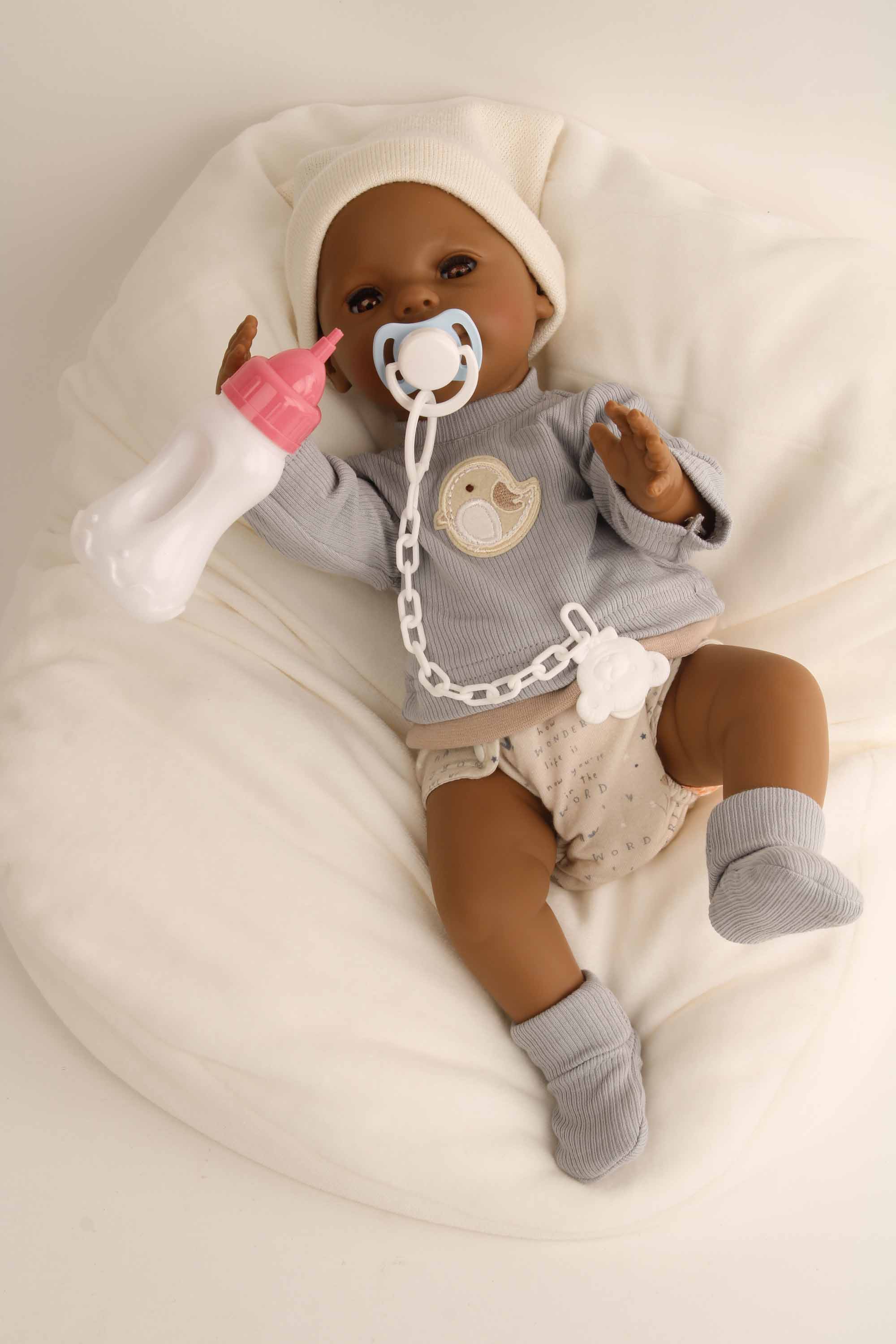 Produktinformationen "Trink + Näßbaby "Finn" 40 cm dunkel mit Malhaar und braunen Schlafaugen, Kleidung hellblau/beige"