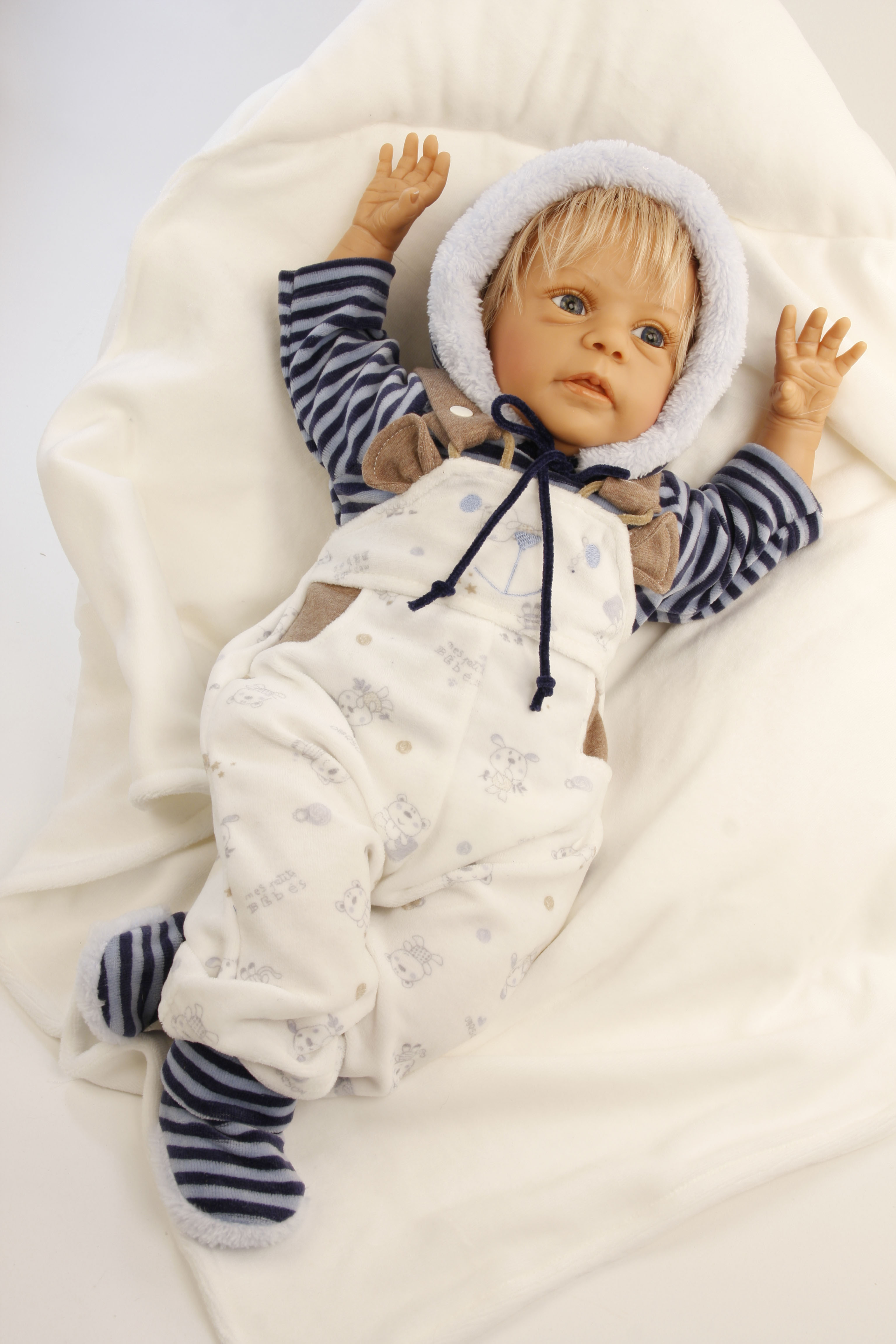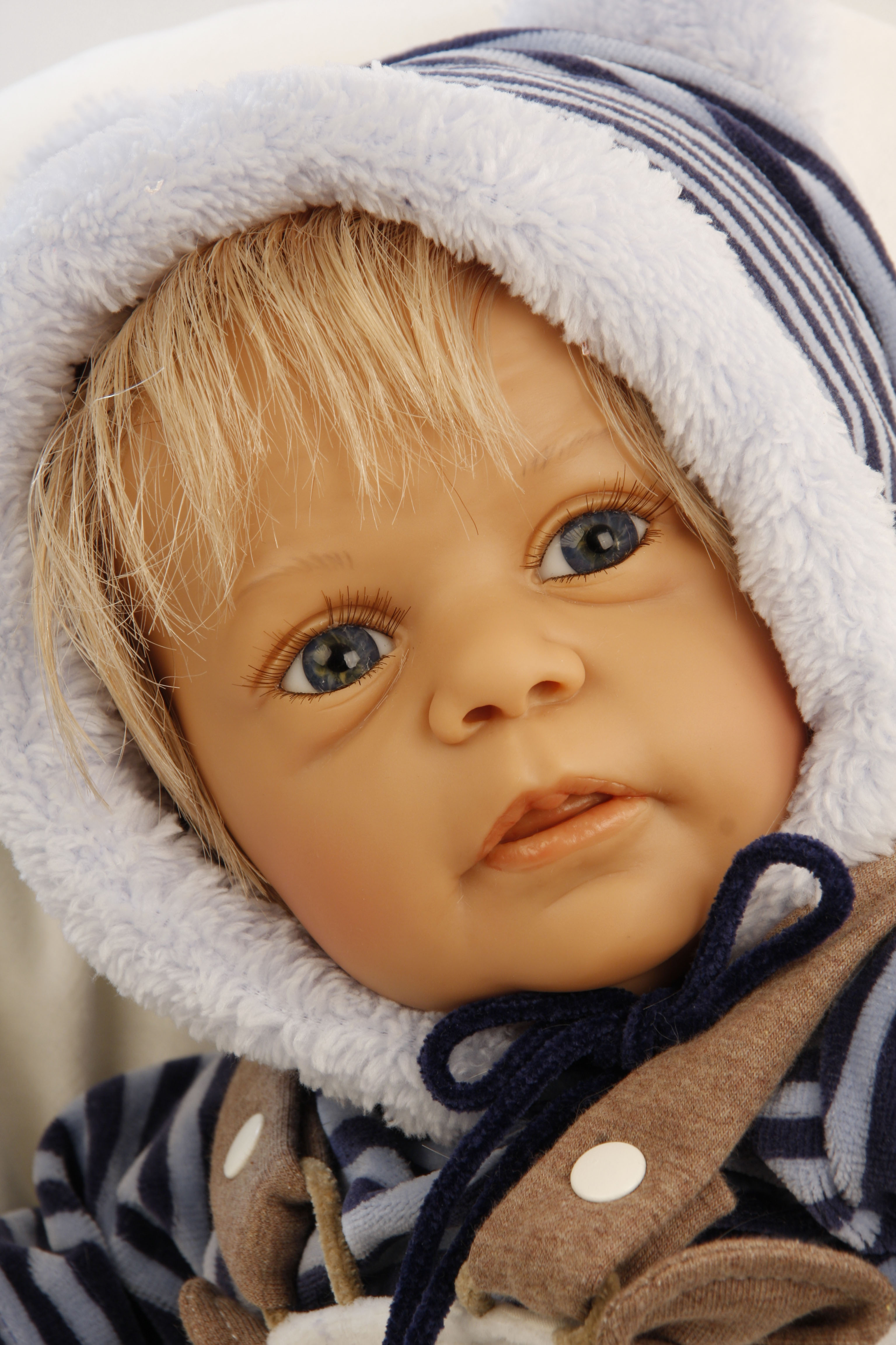 Leon ist ein süßes Puppenkind so richtig zum Liebhaben. Er hat ein ausgefallenes, wunderschönes modelliertes Gesichtchen. Er hat ein Sitzgestell und man kann Kopf, Beine und Arme sehr gut bewegen. Er hat eine blonde handgeknüpfte Echthaarperücke, das Haar wirkt wie aus dem Kopf gewachsen. Die funkelnden Glasaugen, in Lauscha mundgeblasen, sind blau. Leon ist modern bekleidet und liegt n seinem Schlafsack. Die Puppe ist nicht limitiert.