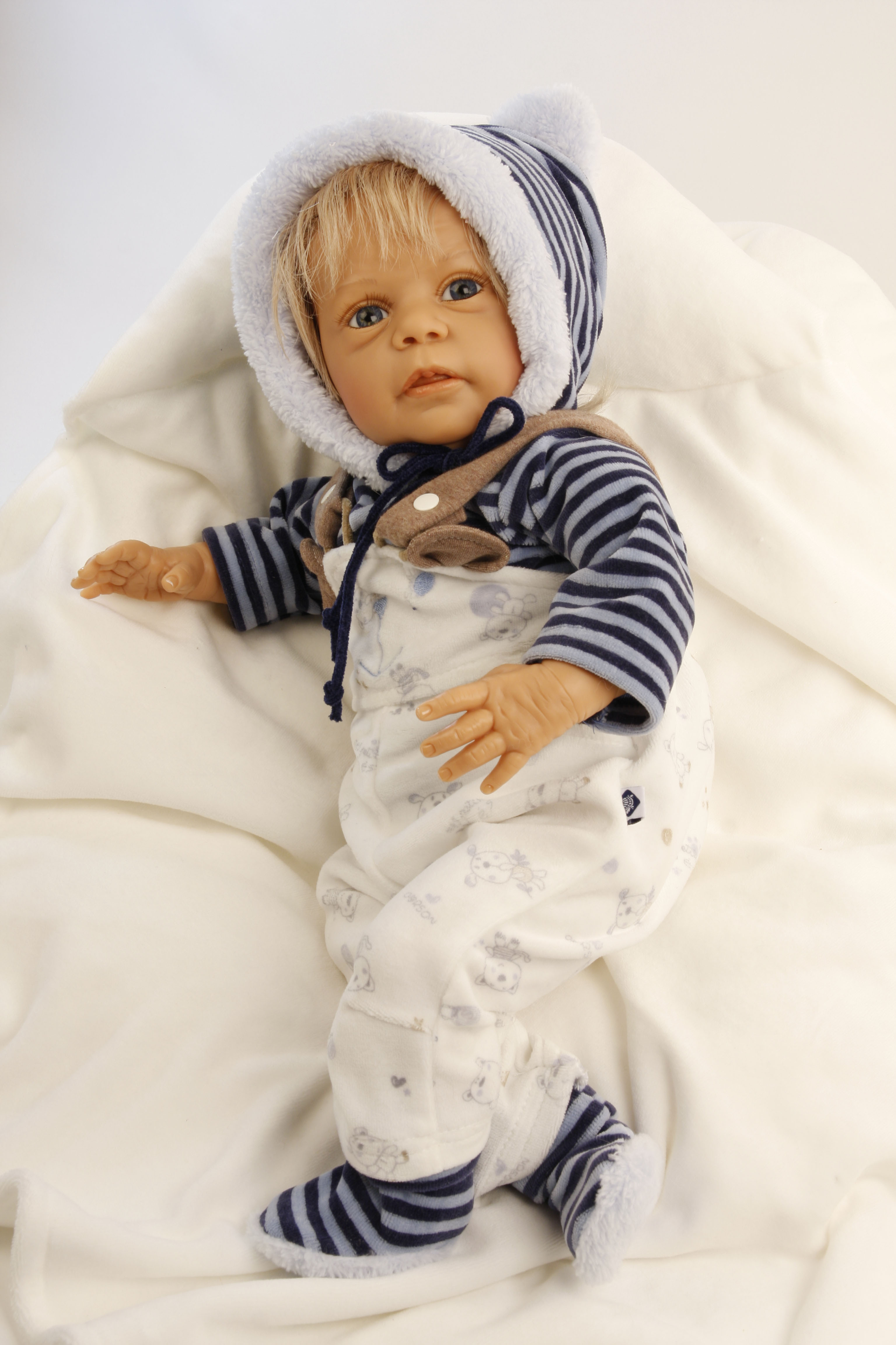 Puppe Leon 50 cm von Gudrun Legler blonde Haare, Kleidung blau/weiss