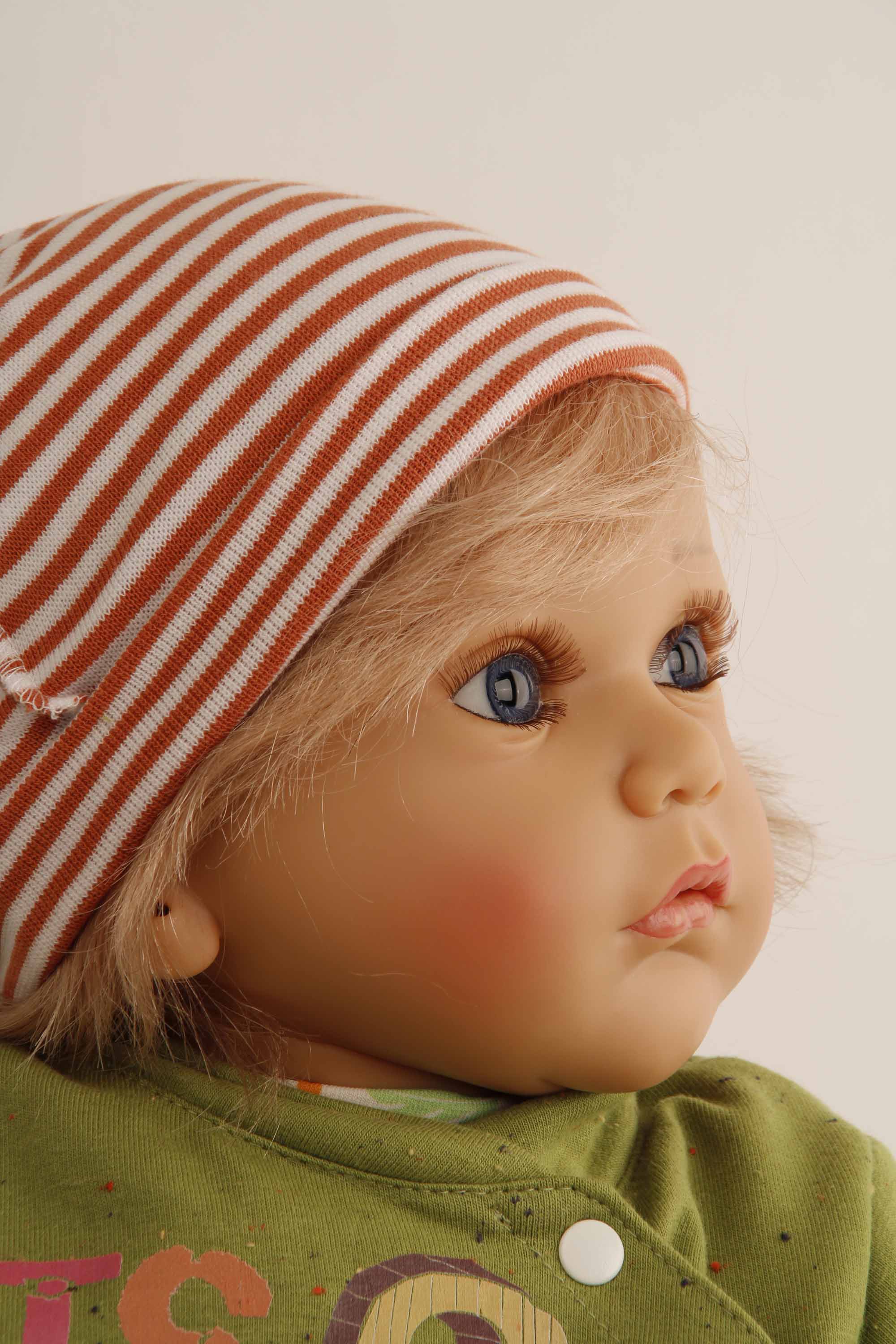 Aaron ist ein Puppenkind so richtig zum Liebhaben. Er hat ein ausgefallenes wunderschönes modellierts Gesichtchen. Er hat ein Sitzgestell und man kann die Beine und Arme sehr gut bewegen. Der Kurbelkopf auf der Brustplatte ist voll beweglich. Er hat eine blonde handgeknüpfte Echthaarperücke. Die funkelnden Glasaugen, in Lauscha mundgeblasen, sind blau. Aaron ist modern im Dschungel-Look bekleidet und hat sein Spieläffchen dabei. Die Puppe ist nicht limitiert.