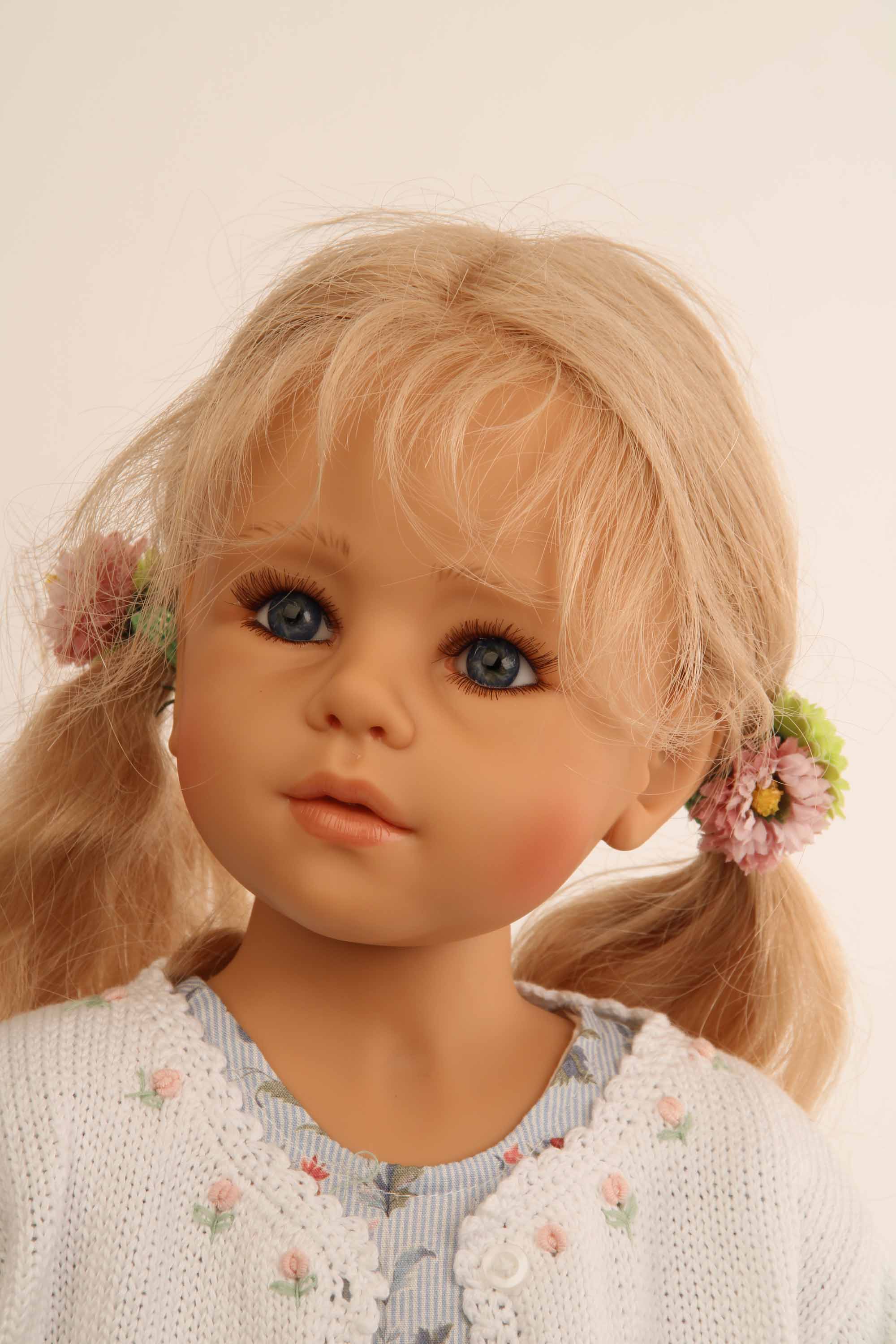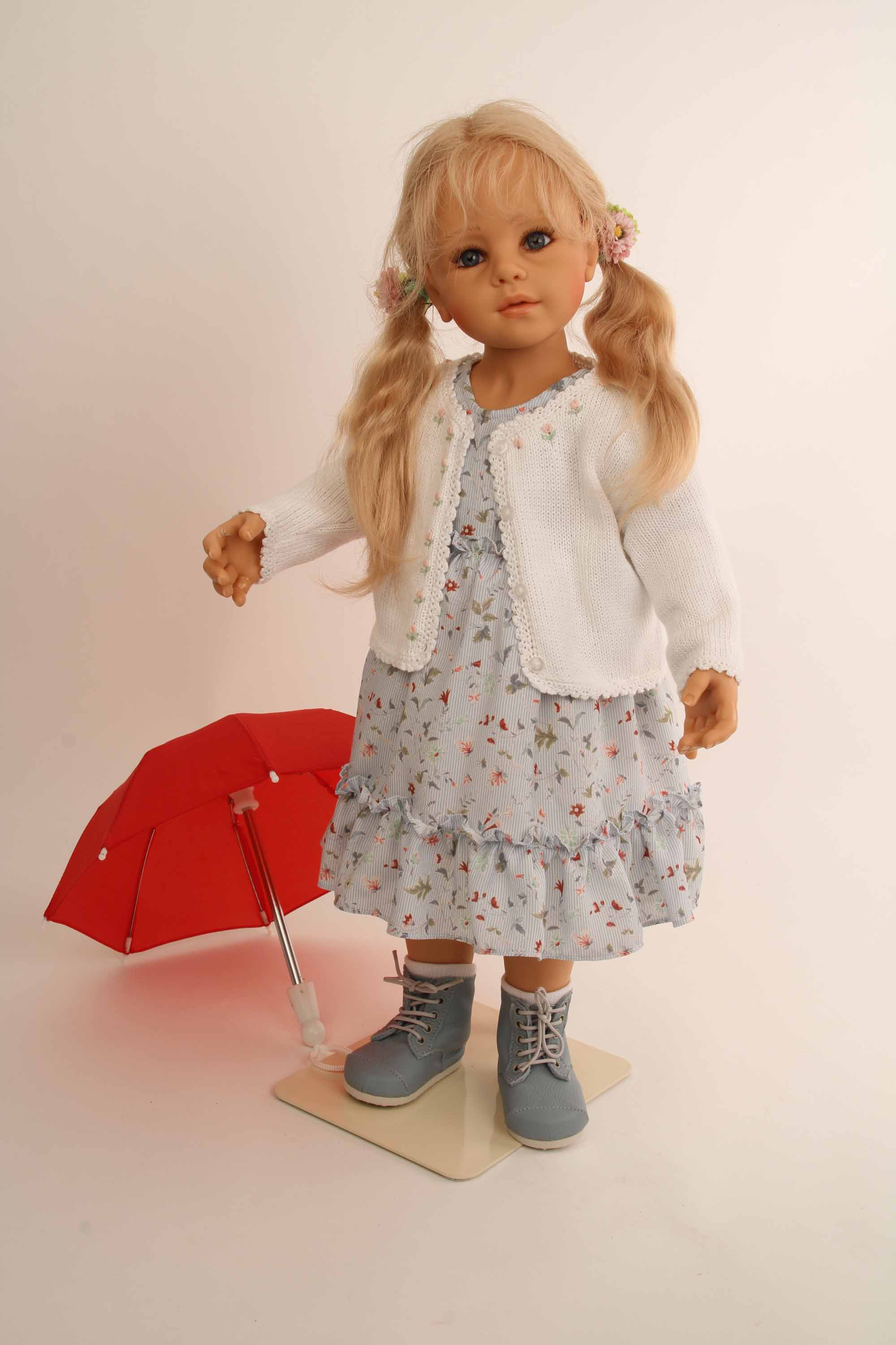 Moni ist ein süßes Puppenkind von Sieglinde Frieske, mit einer außergewöhnlichen Ausstrahlung. Sie hat ein bewegliches Stehgestell. Der Kurbelkopf auf der Brustplatte lässt sich in verschiedene Richtungen / Stellungen bewegen. Sie hat eine blonde, handgeknüpfte Echthaarperücke und mundgeblasene, blaue Glasaugen aus Lauscha. Sie trägt ein hübsches blaues Cordkleid mit Blumendruck und hat eine weiße Strickjacke an. Sie trägt sogar echte Lederschuhen und hat einen rotes Regenschirm dabei. Sie wird hergestellt in unserer Puppenmanufaktur in Rauenstein/Thüringen und ist "Made in Germany".