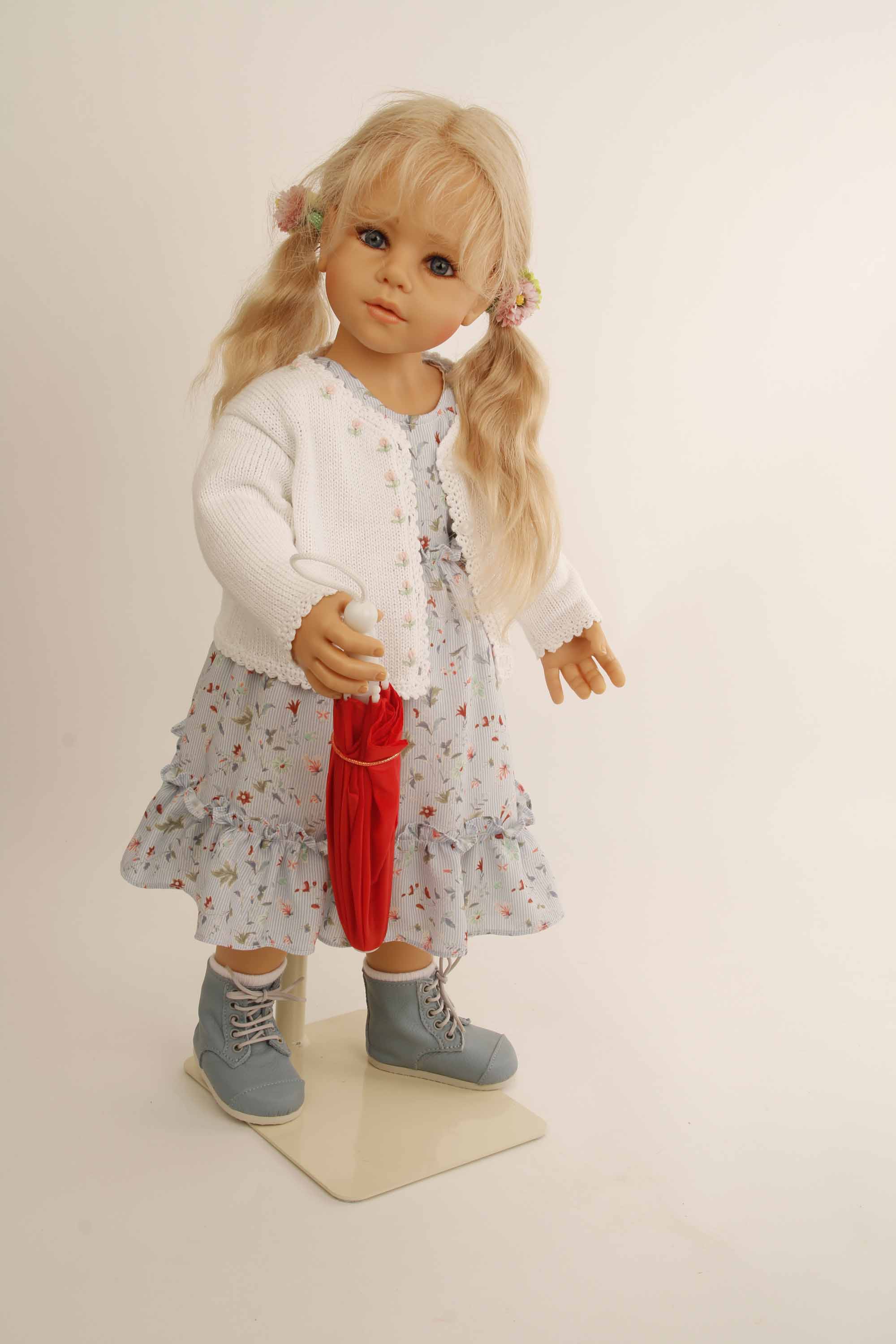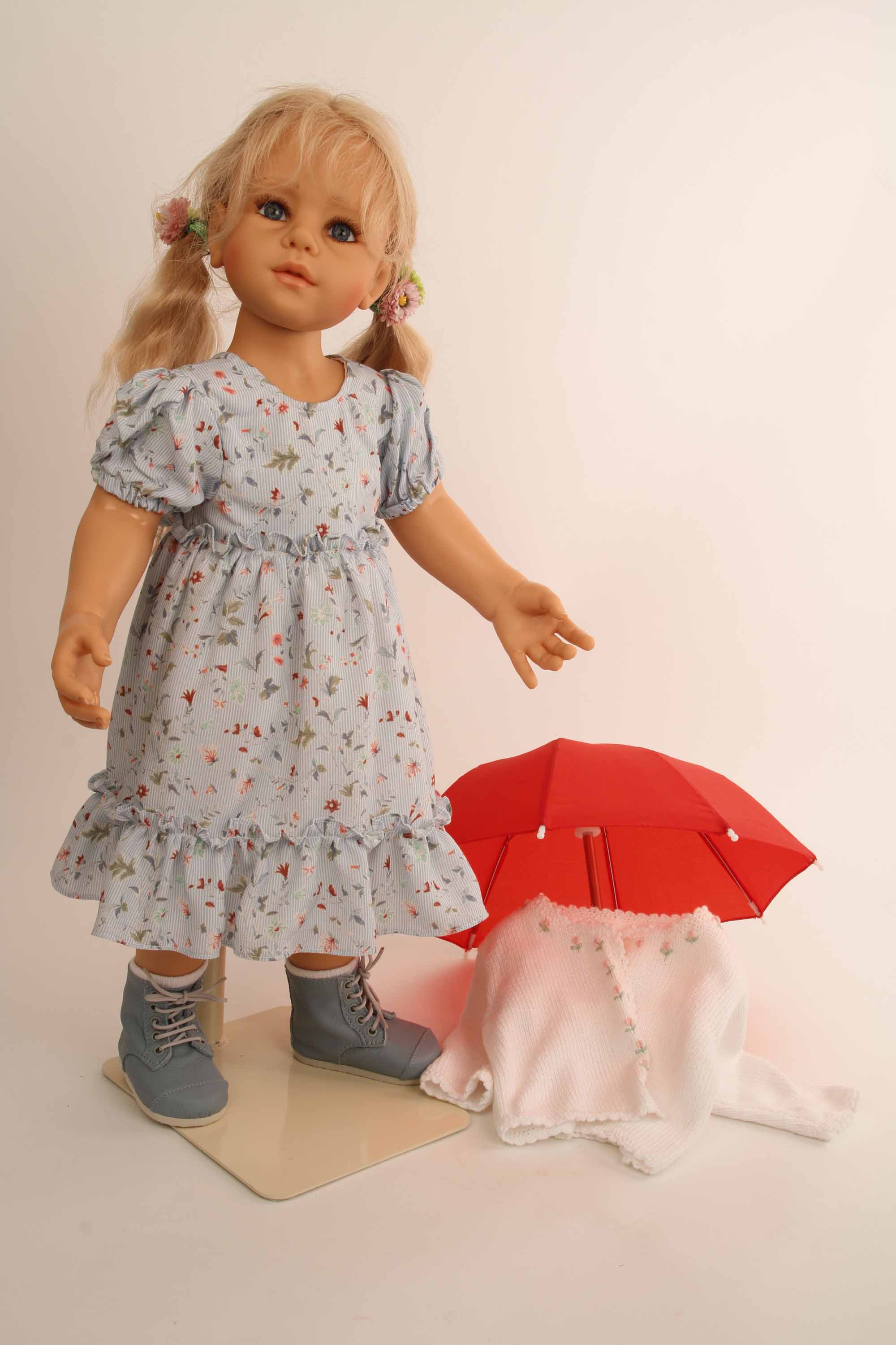 Puppe Moni stehend 64 cm von Sieglinde Frieske, Cordkleid blau mit Strickjacke