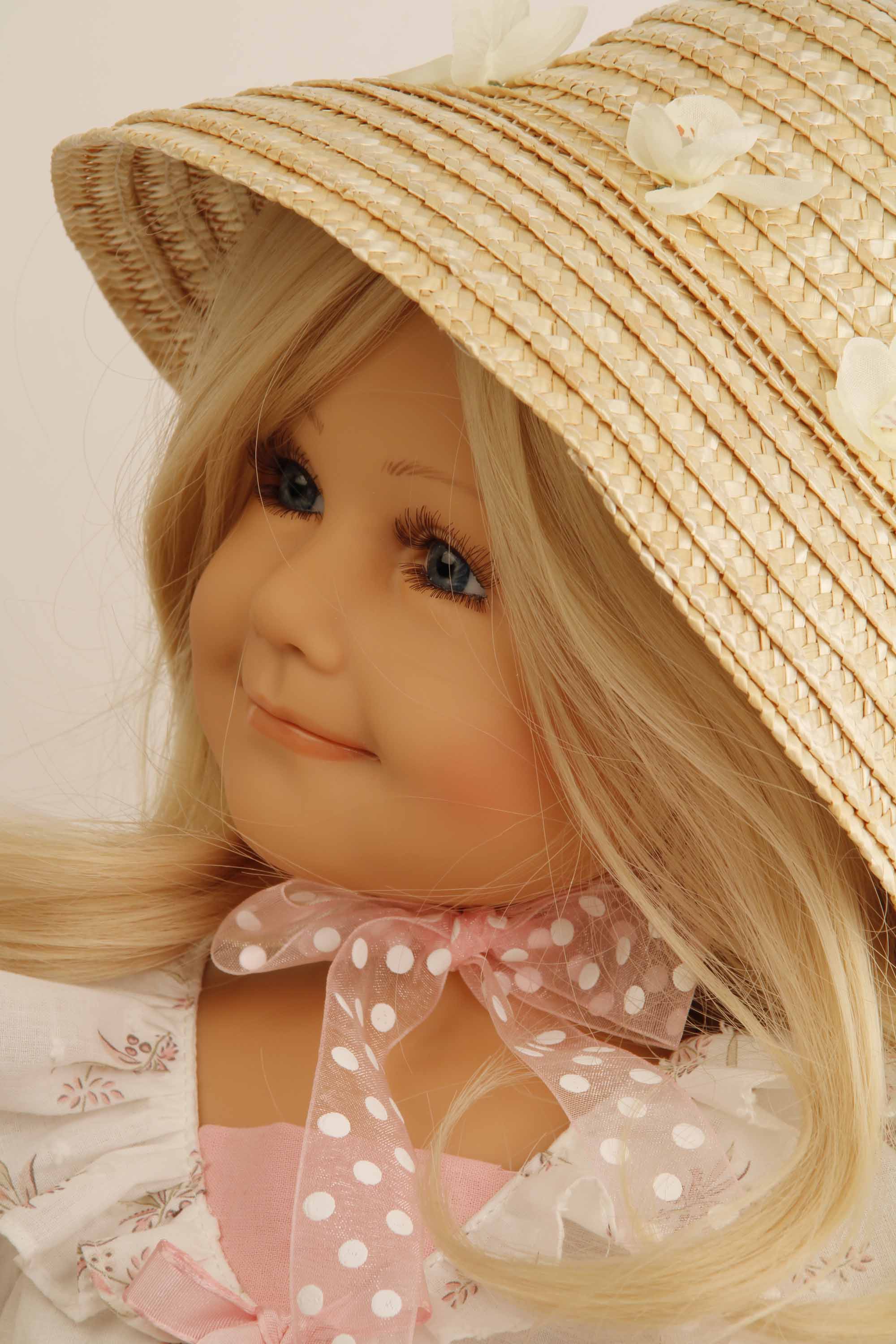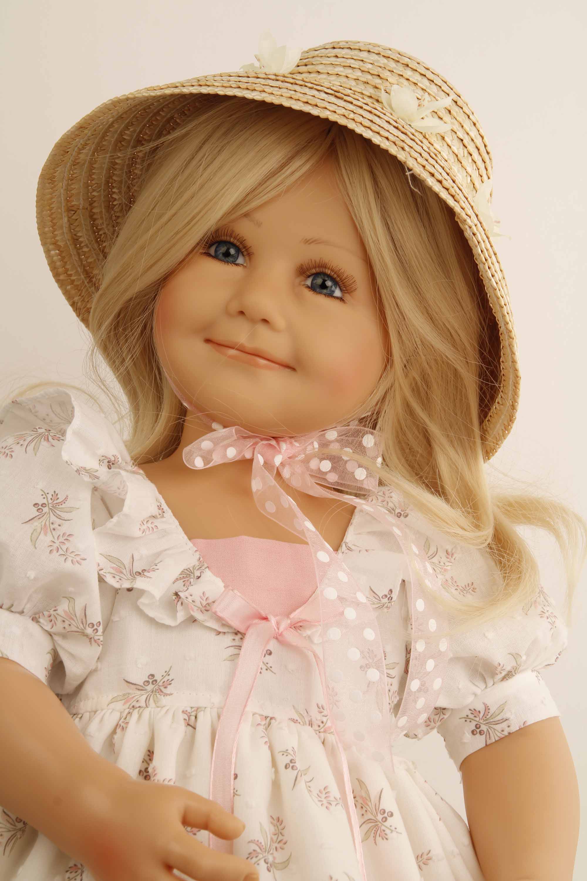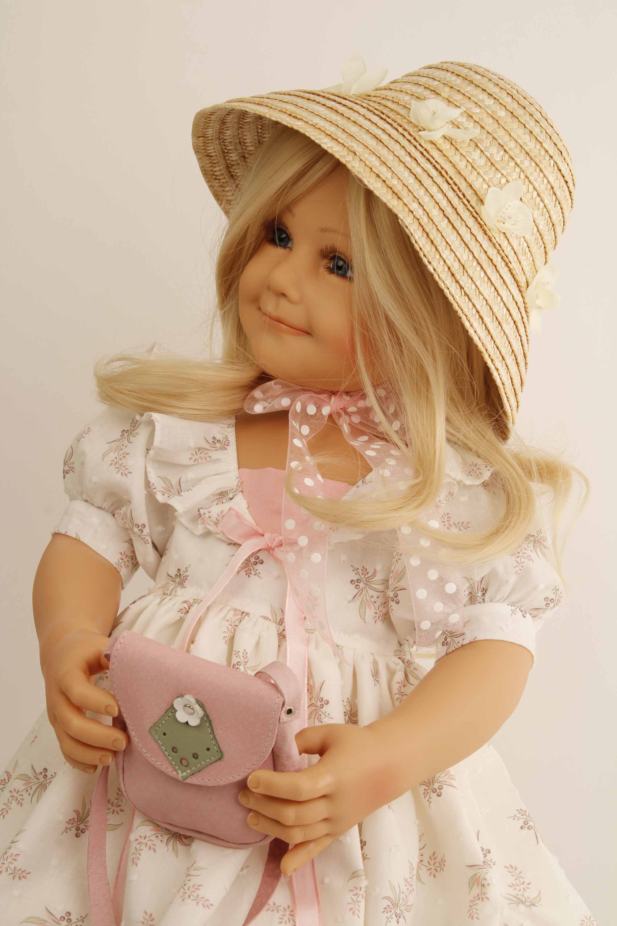 Puppe Jenny sitzend 65 cm von Sieglinde Frieske blonde Haare, Kleidung weiss/rose