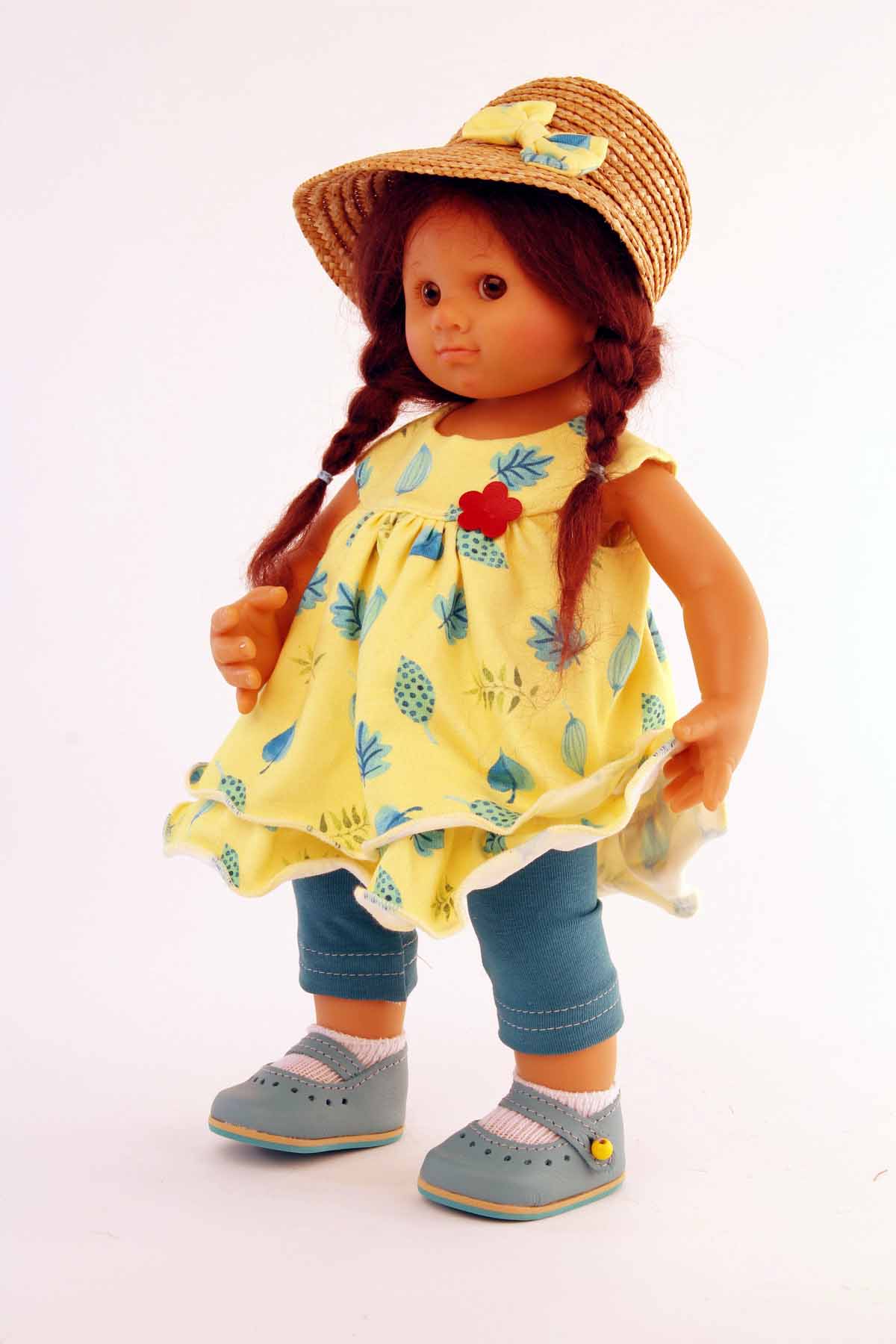 Puppe Müller-Wichtel Pia 30 cm braune Haare, Kleidung gelb/grün