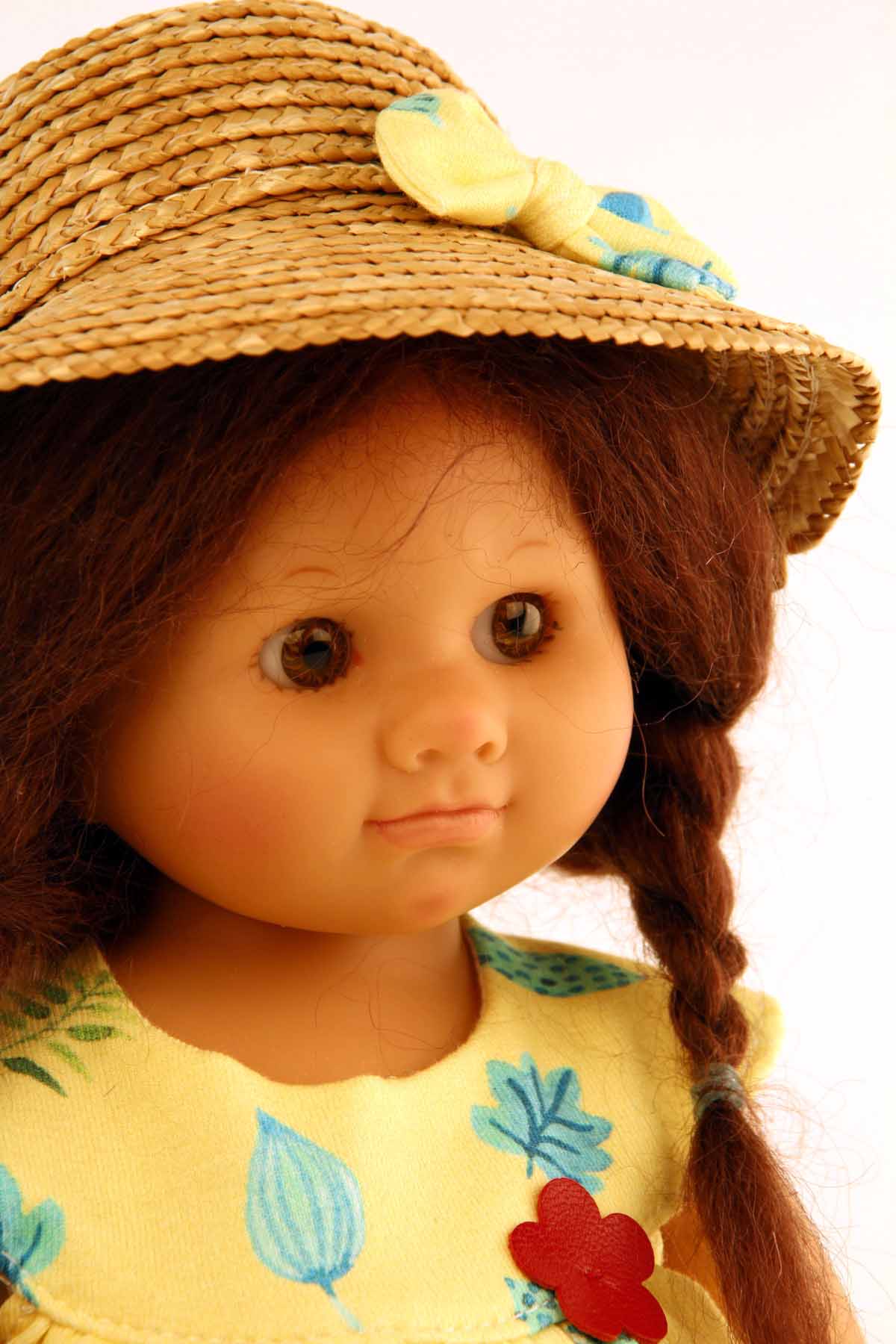 Künstlerpuppe der bekannten deutschen Künstlerin Rosemarie Müller, Ihre Wichtel bezeichnet sie als "Balsam für die Seele". Die Müller-Wichtel sind alle "Made in Germany" und werden in Rauenstein/Thür. gefertigt. Sie sind komplett aus Hartvinyl gefertigt, haben handgeknüpfte Echthaarperücken, mundgeblasene Glasaugen aus Lauscha und sind liebevoll von Hand bemalt. Durch die 5 Gelenke ist sie voll beweglich. Das Modell Pia trägt eine lustige Spielkleidung mit Strohhut. Sie hat eine braune Echthaarperücke zu Zöpfen frisiert und hasel Augen.Die Augen der Puppe schauen hier zur Seite, dies ergibt einen schelmischen Blick.