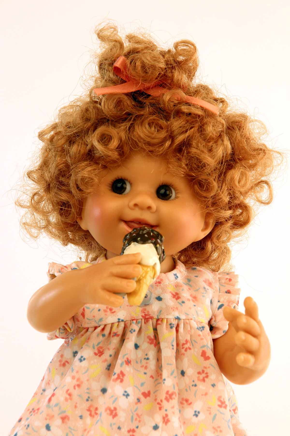 Künstlerpuppe der bekannten deutschen Künstlerin Rosemarie Müller, Ihre Wichtel bezeichnet sie als "Balsam für die Seele". Die Müller-Wichtel sind alle "Made in Germany" und werden in Rauenstein/Thür. gefertigt. Sie sind komplett aus Hartvinyl gefertigt, haben handgeknüpfte Echthaarperücken, mundgeblasene Glasaugen aus Lauscha und sind liebevoll von Hand bemalt. Durch die 5 Gelenke ist sie voll beweglich. Dieses Modell ist 25 cm groß. Das Modell Ida trägt eine rosa Sommerkleidung und schleckt ein Eis. Sie hat eine rote Echthaarperücke mit Locken und haselbraune Augen.Die Augen der Puppe schauen hier zur Seite, dies ergibt einen schelmischen Blick.