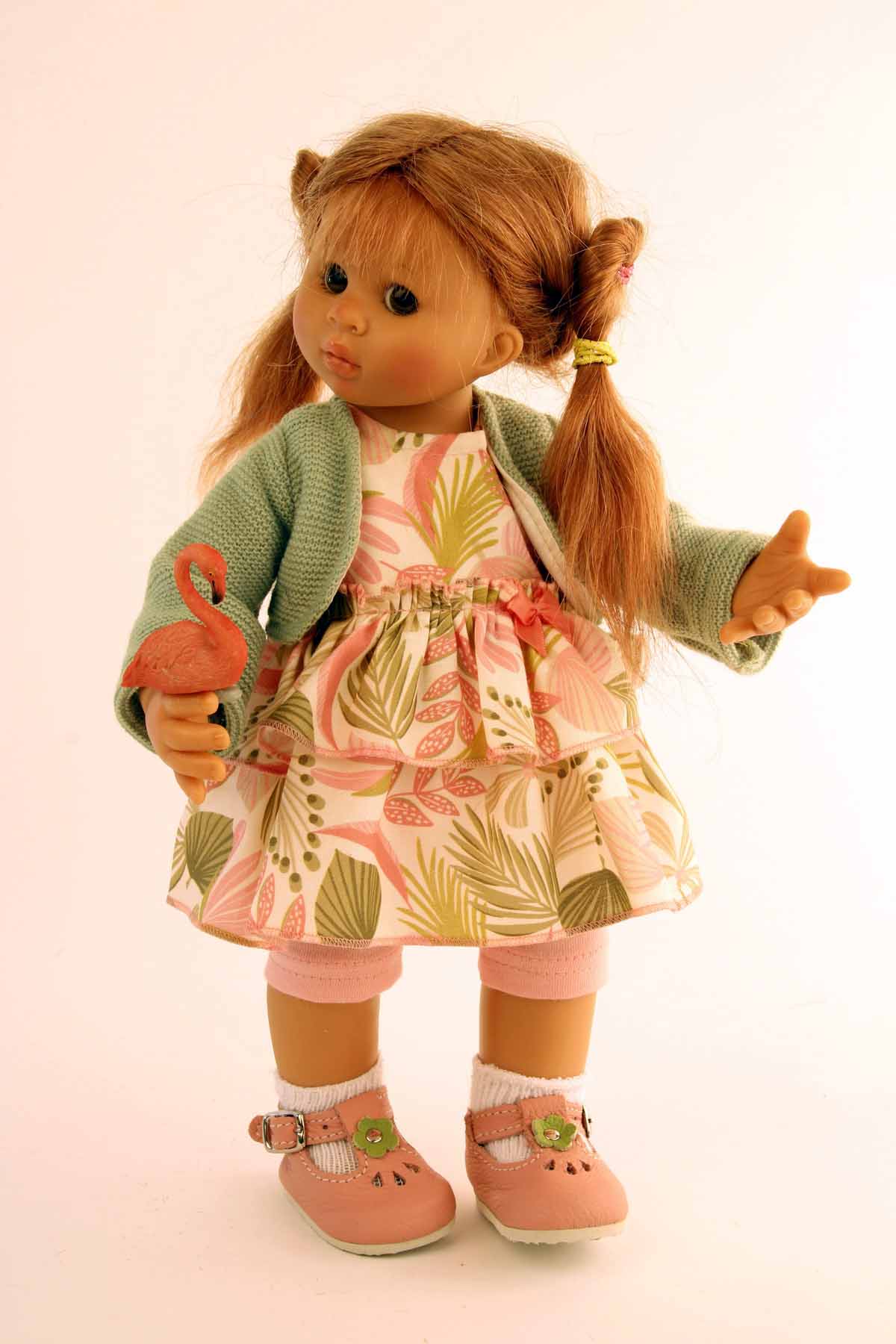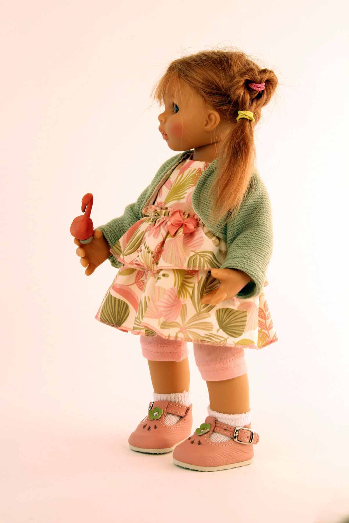 Künstlerpuppe der bekannten deutschen Künstlerin Rosemarie Müller, Ihre Wichtel bezeichnet sie als "Balsam für die Seele". Die Müller-Wichtel sind alle "Made in Germany" und werden in Rauenstein/Thür. gefertigt. Sie sind komplett aus Hartvinyl gefertigt, haben handgeknüpfte Echthaarperücken, mundgeblasene Glasaugen aus Lauscha und sind liebevoll von Hand bemalt. Durch die 5 Gelenke ist sie voll beweglich. Das Modell Lotta trägt ein rose/weisses Sommerkleid mit Blättern bedruckt, eine grüne Strickjacke und rose Leggings. Sie hat einen kleinen Flamingo dabei. Sie hat eine rote Echthaarperücke und hellbraune Augen.Die Augen der Puppe schauen hier zur Seite, dies ergibt einen schelmischen Blick.