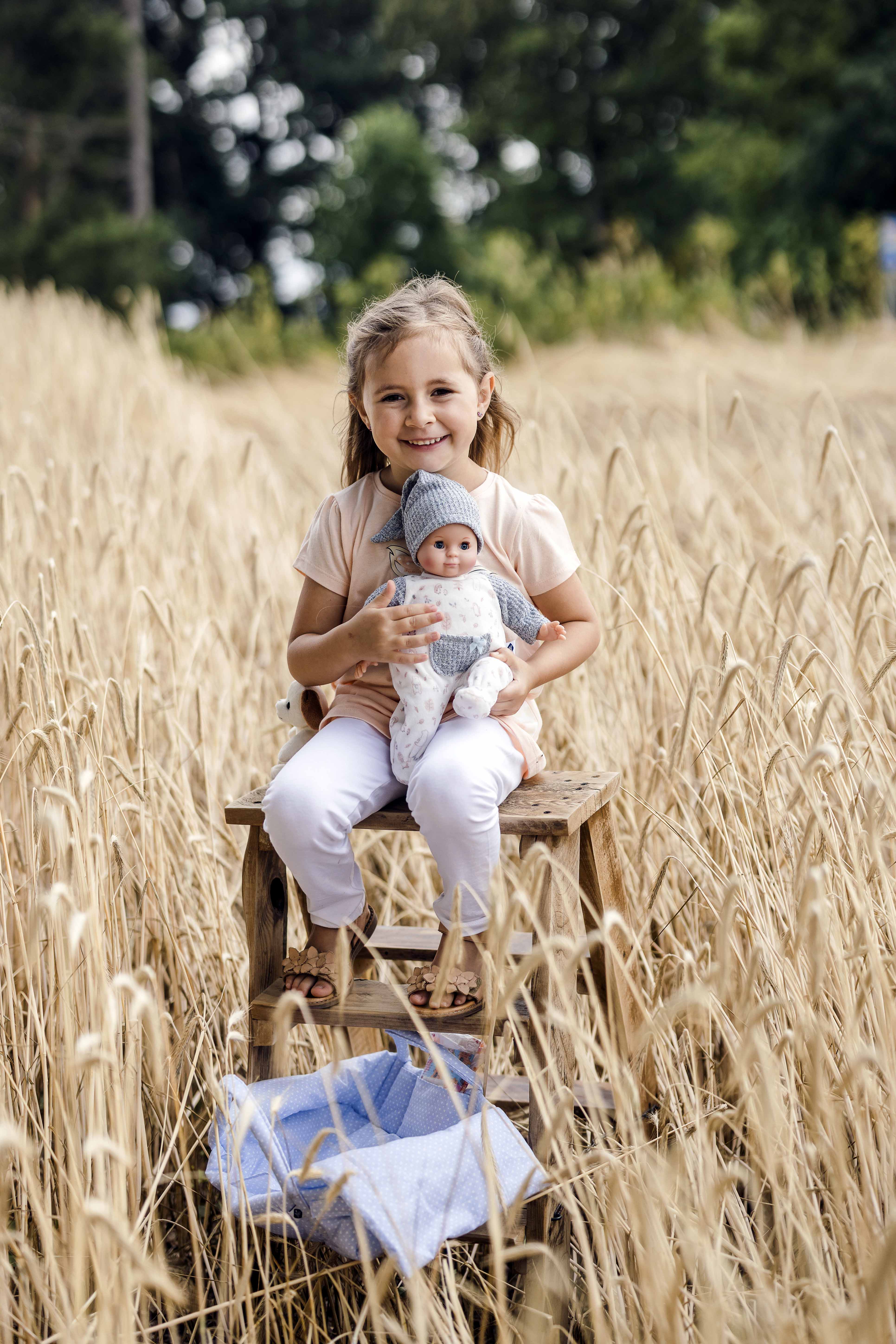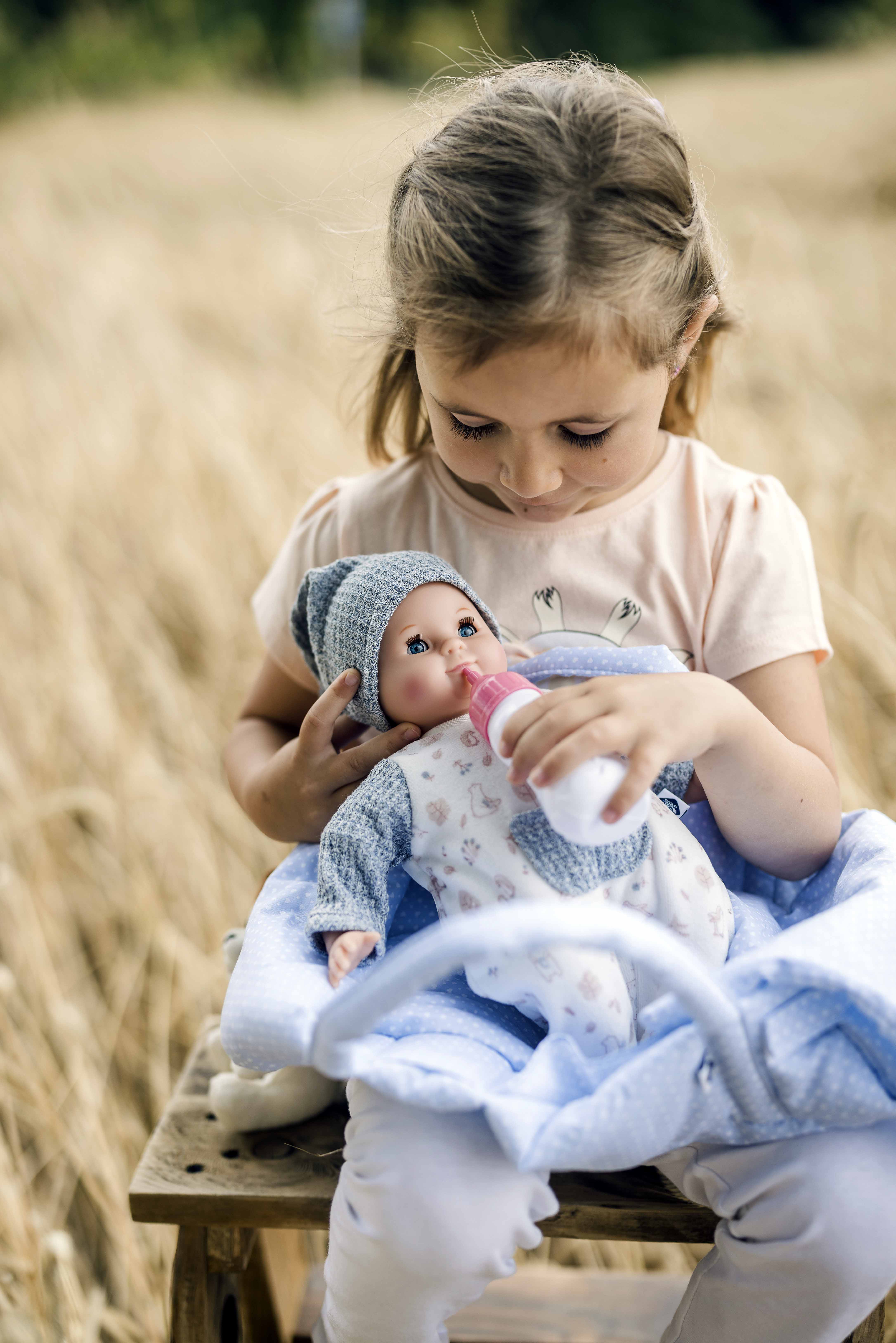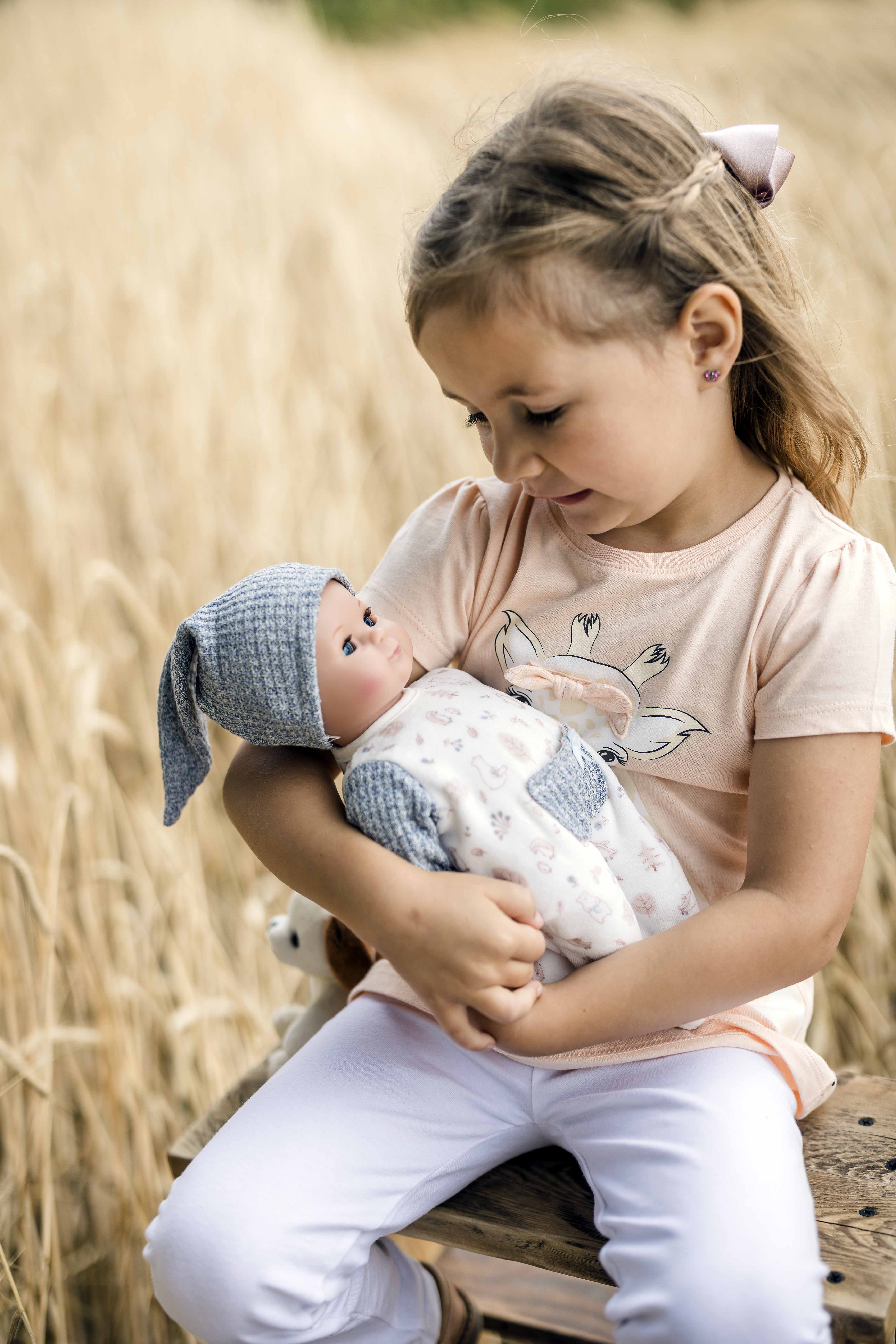 Mein erstes Schlummerle, die beliebteste und bekannteste Puppe, ohne Haare für die Kleinsten. Ein unverwechselbares Gesicht vereint Qualität und Spielwert und begeistert schon seit Generationen unsere Puppenmuttis.Die Puppe wird in unserer eigenen Puppenmanufaktur in Rauenstein/Thüringen hergestellt. Arme, Beine und Kopf sind aus Vinyl, sie hat lustige braune Schlafaugen und gemalte Haare. Es trägt einen rose Strickoverall mit angenähtem Blumenkleid und eine Strickmütze. Die Kleidung ist leicht an- und ausziehbar und bei 30 Grad per Hand waschbar. STICKEREI: Als besonderen Service bieten wir an, eine individuelle Widmung (z.B. Name und Geburtsdatum der Puppenmutti) mit einem kleinen Aufpreis auf den Puppenbauch zu sticken. Wenn Sie eine ganz persönliche Puppe für Ihr Kind möchten, dann geben Sie Ihre Wunschbestickung oben in die dafür vorgesehenen Felder ein. Achtung: Nicht geeignet für Kinder unter 36 Monaten, da Kleinteile verschluckt werden können.