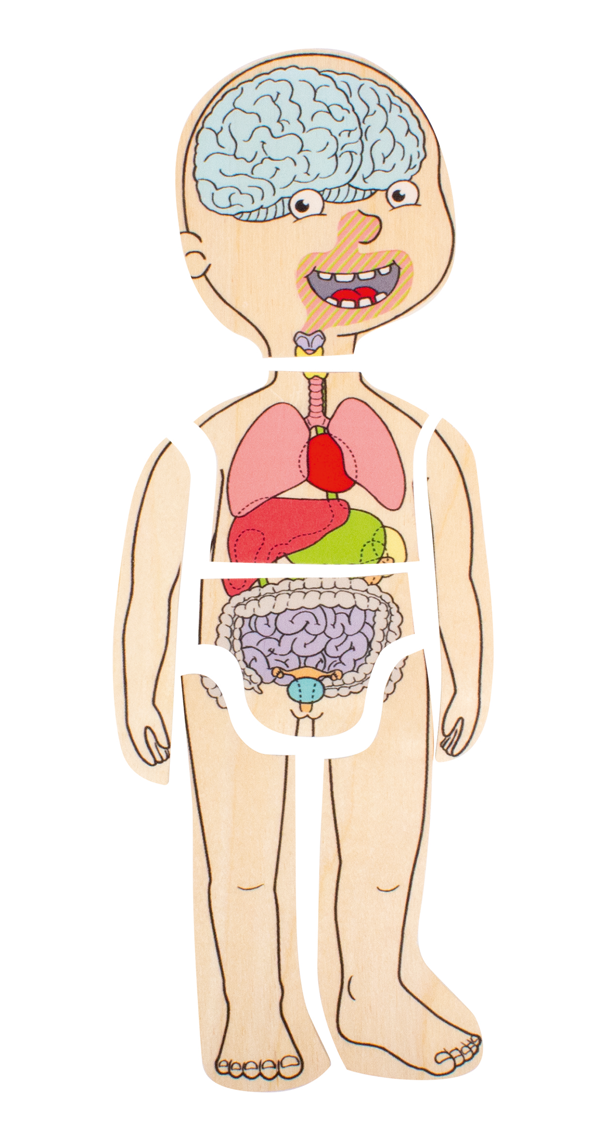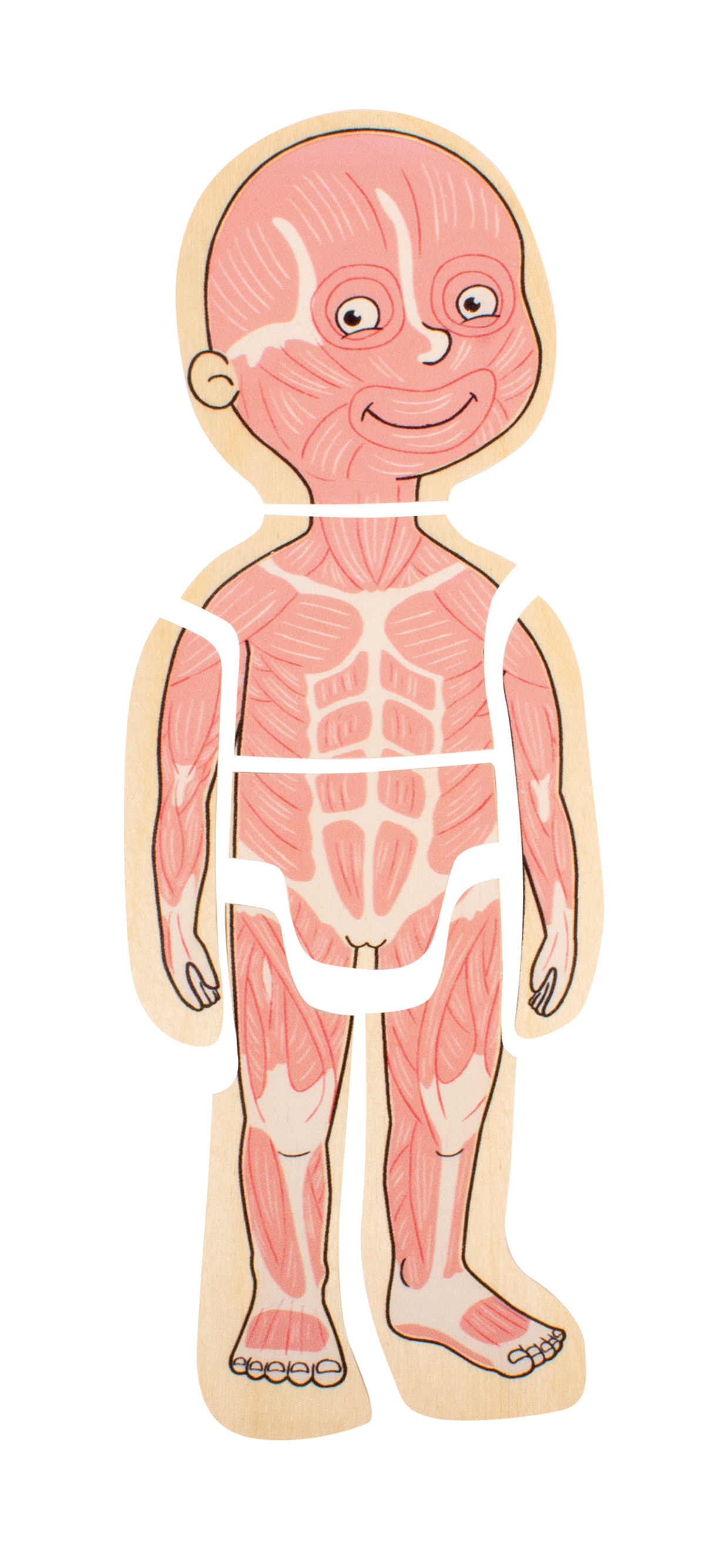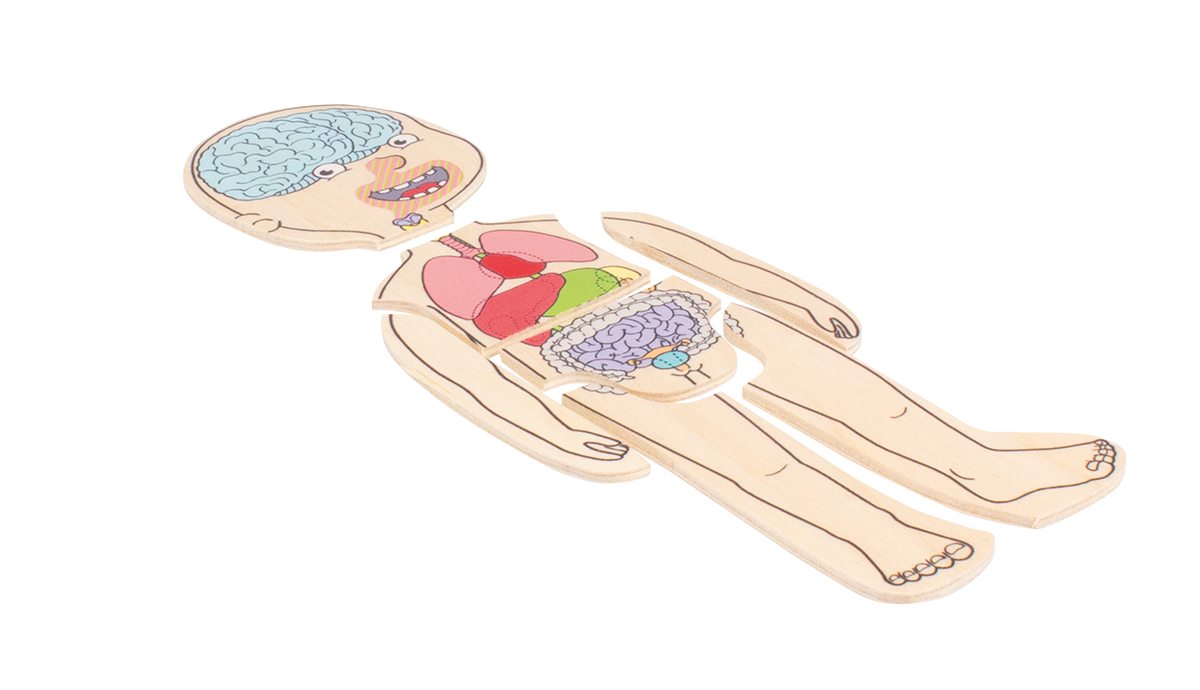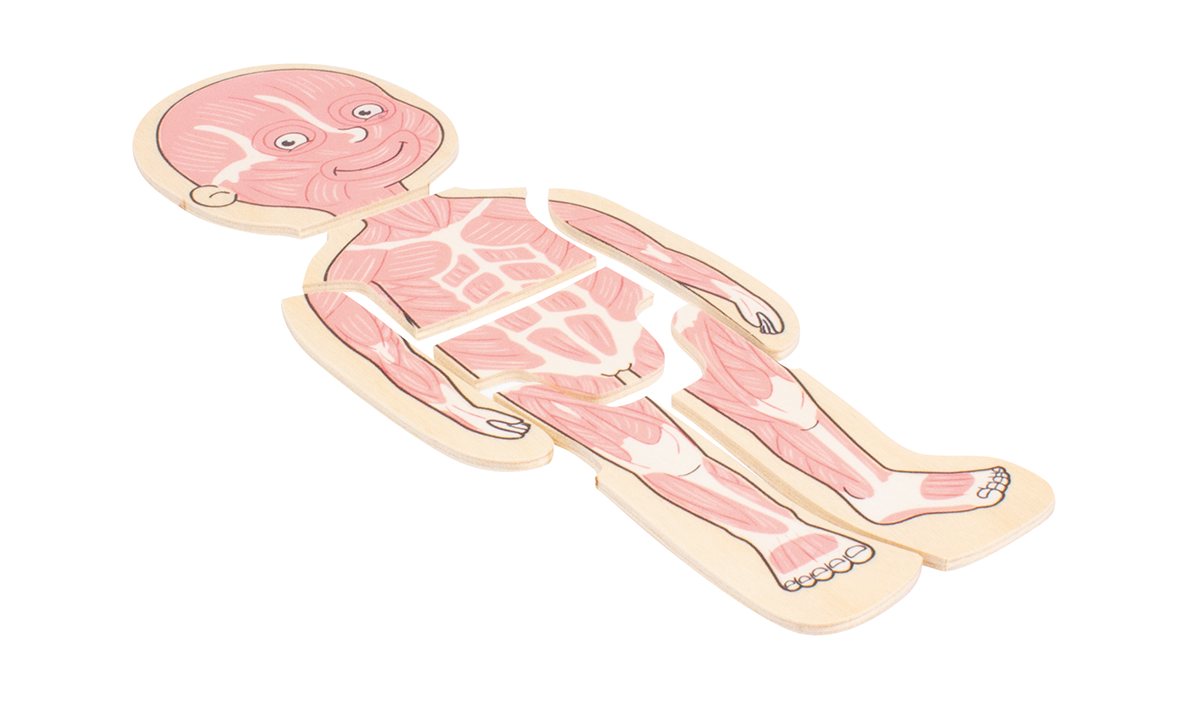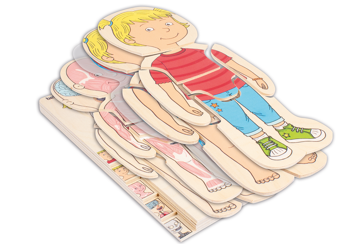 Das Puzzle zeigt in anschaulicher und kindgerechter Weise den Aufbau des menschlichen Körpers vom Skelett zu den Organen, über die Muskeln,