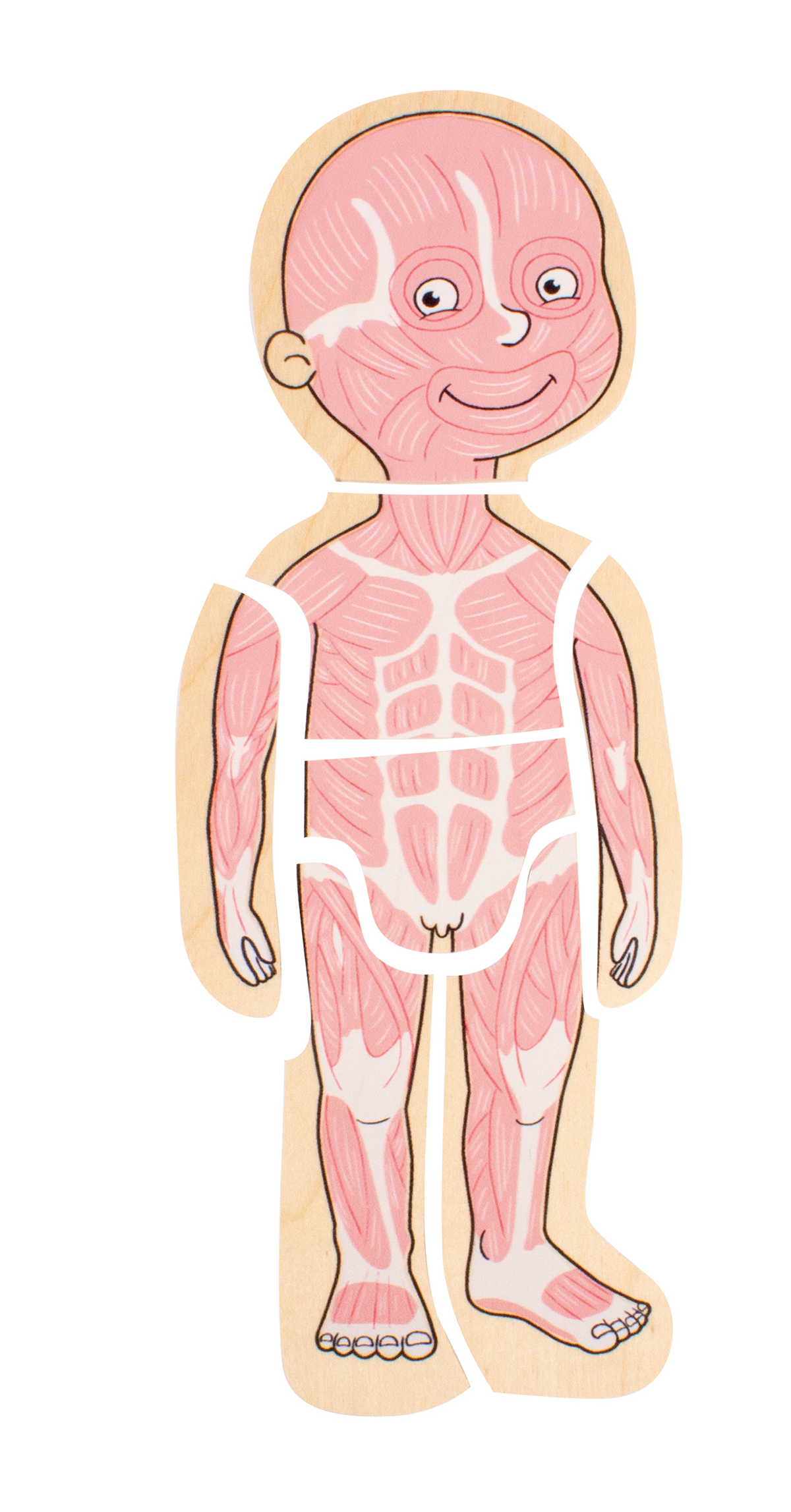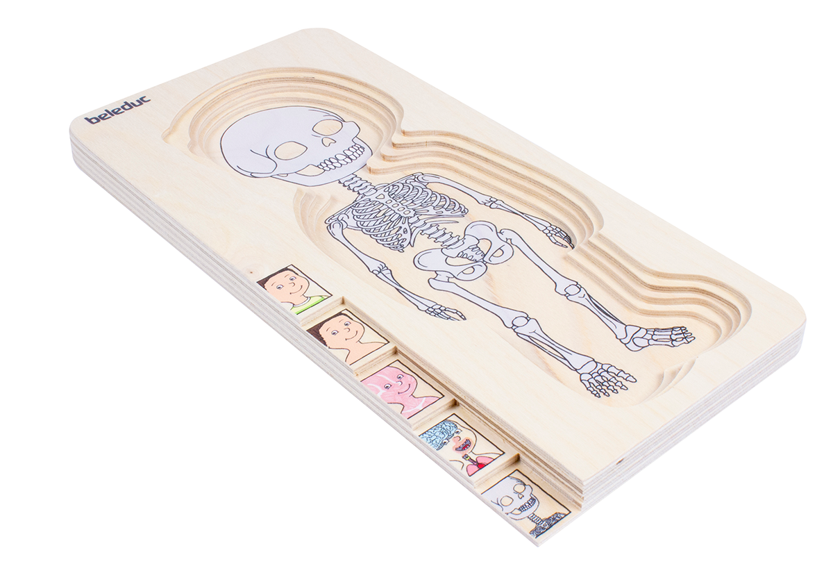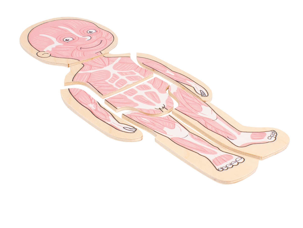 Das Puzzle zeigt in anschaulicher und kindgerechter Weise den Aufbau des menschlichen Körpers vom Skelett zu den Organen, über die Muskeln,