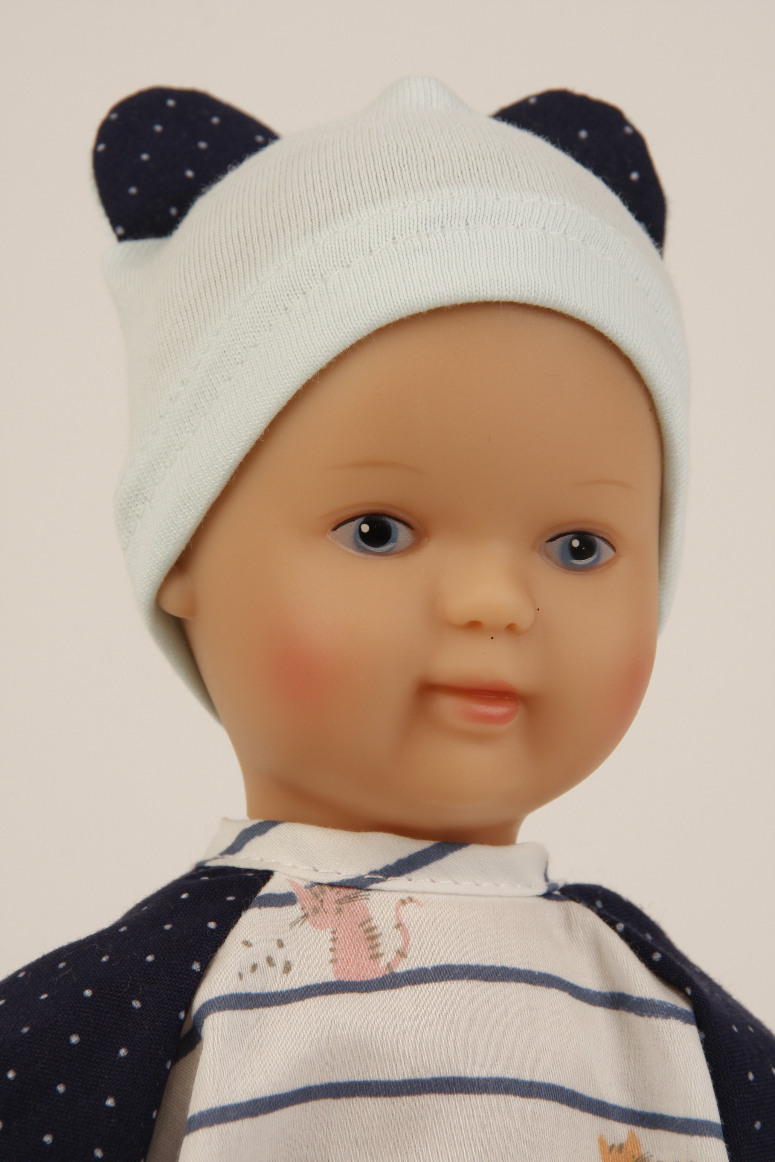 Kleidung bestehend aus einem kurzen Overall blau/weiß mit Katzenmotiv und einer passenden Mütze mit Öhrchen. Die Kleidung ist bei 30 Grad per Hand waschbar. Diese Kleidung paßt auch unserer Puppe Mein 1. Baby Gr. 28. Die Puppe gehört nicht zum Lieferumfang. Diese Kleidung wurde komplett in Handarbeit in unserer Puppenmanufaktur in Rauenstein/Thüringen gefertigt.