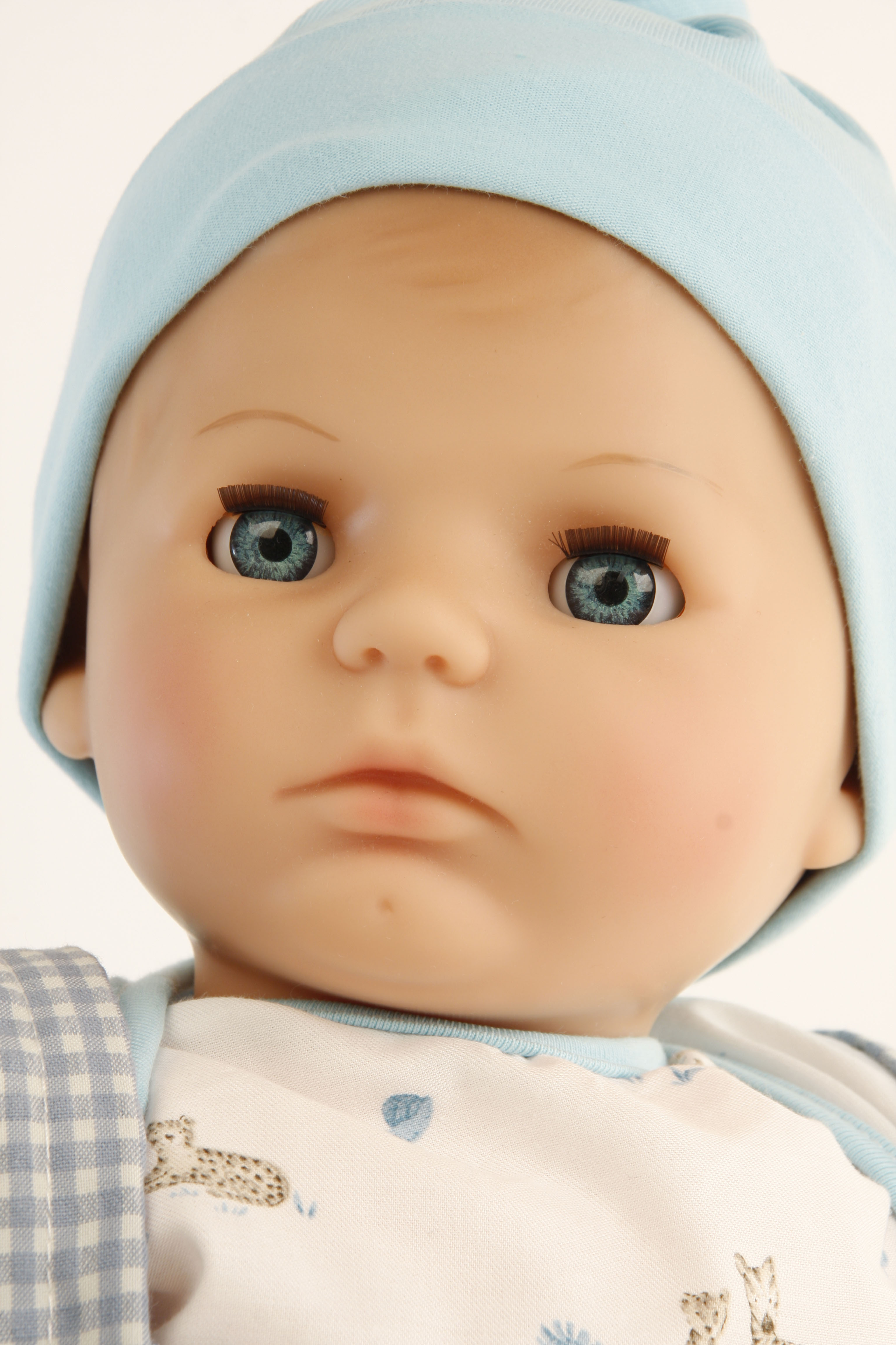 Produktinformationen "Puppe Peterle 52 cm mit Malhaar, blauen Schlafaugen, Kleidung grau/mint/weiss"