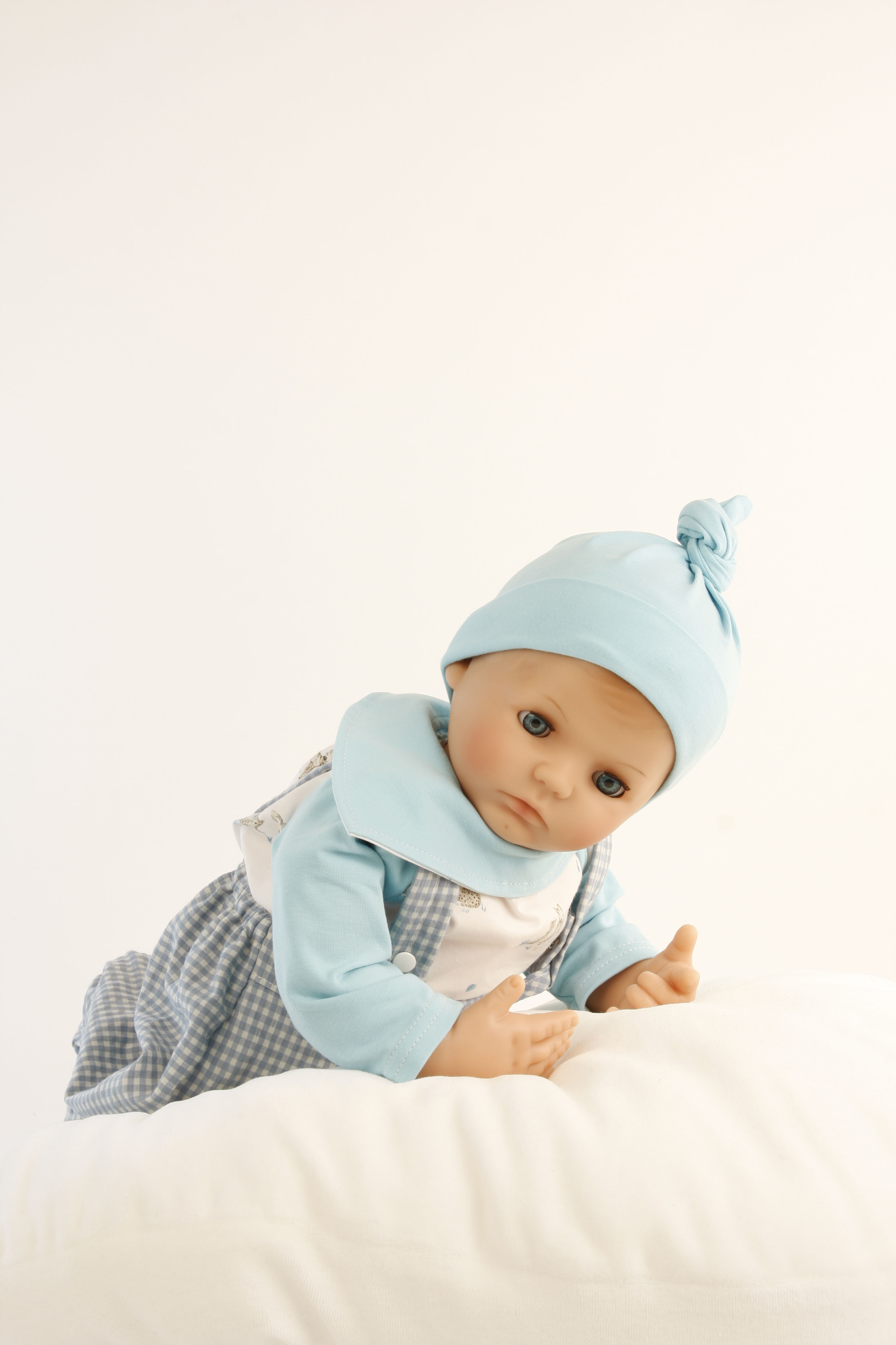 Puppe Peterle 52 cm mit Malhaar, blauen Schlafaugen, Kleidung grau/mint/weiss