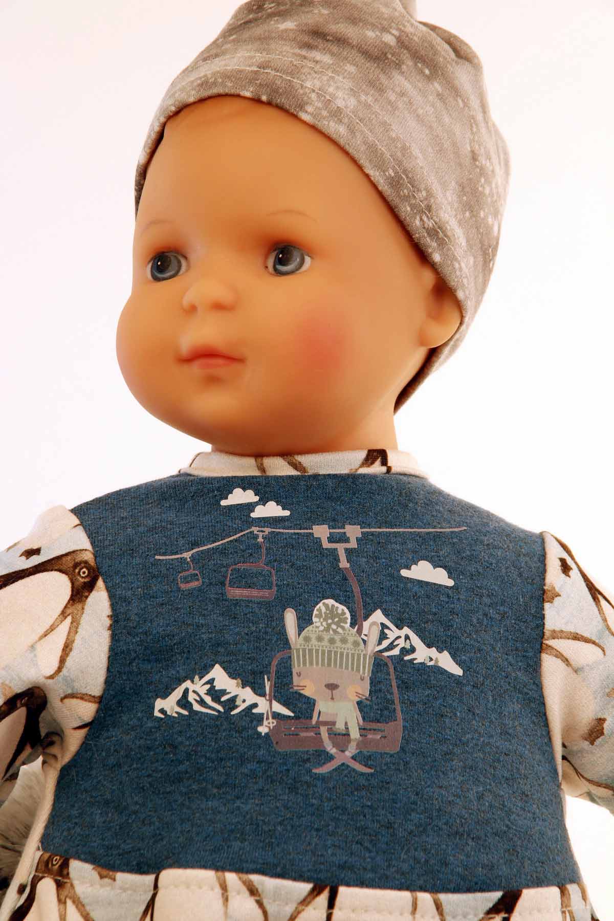 Kleidung bestehend aus einem weißen Overall mit Segelbooten bedruckt, einem blauen Shirt und passender Mütze.Die Strümpfe 0041175 können separat dazu bestellt werden. Die Kleidung wird komplett in Handarbeit in unserer Puppenmanufaktur in Rauenstein /Thüringen gefertigt. Diese Kleidung kann per Hand bei 30 Grad gewaschen werden. Achtung: nicht geeignet für Kinder unter 36 Monate, da Kleinteile sich lösen können und verschluckt werden können.