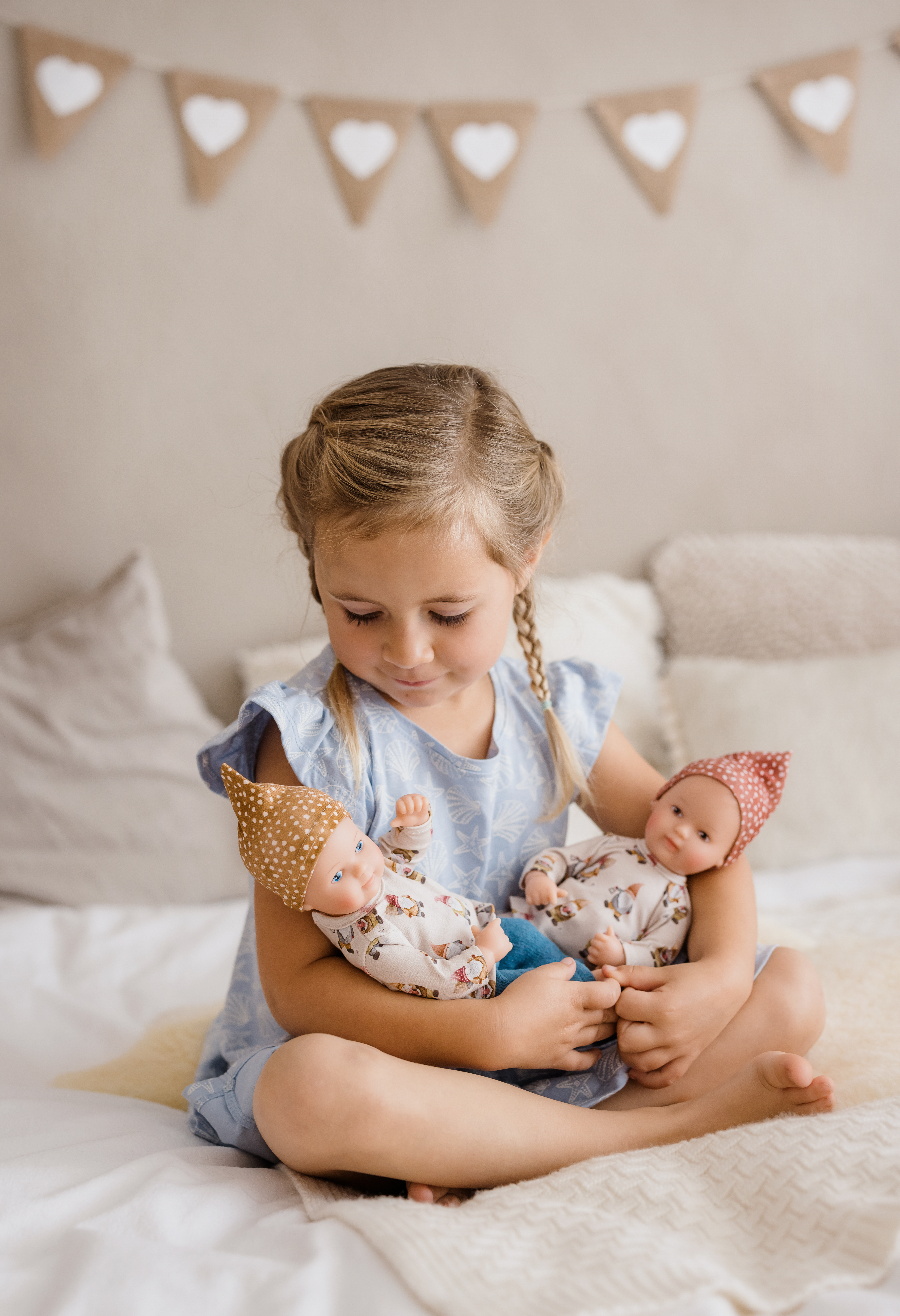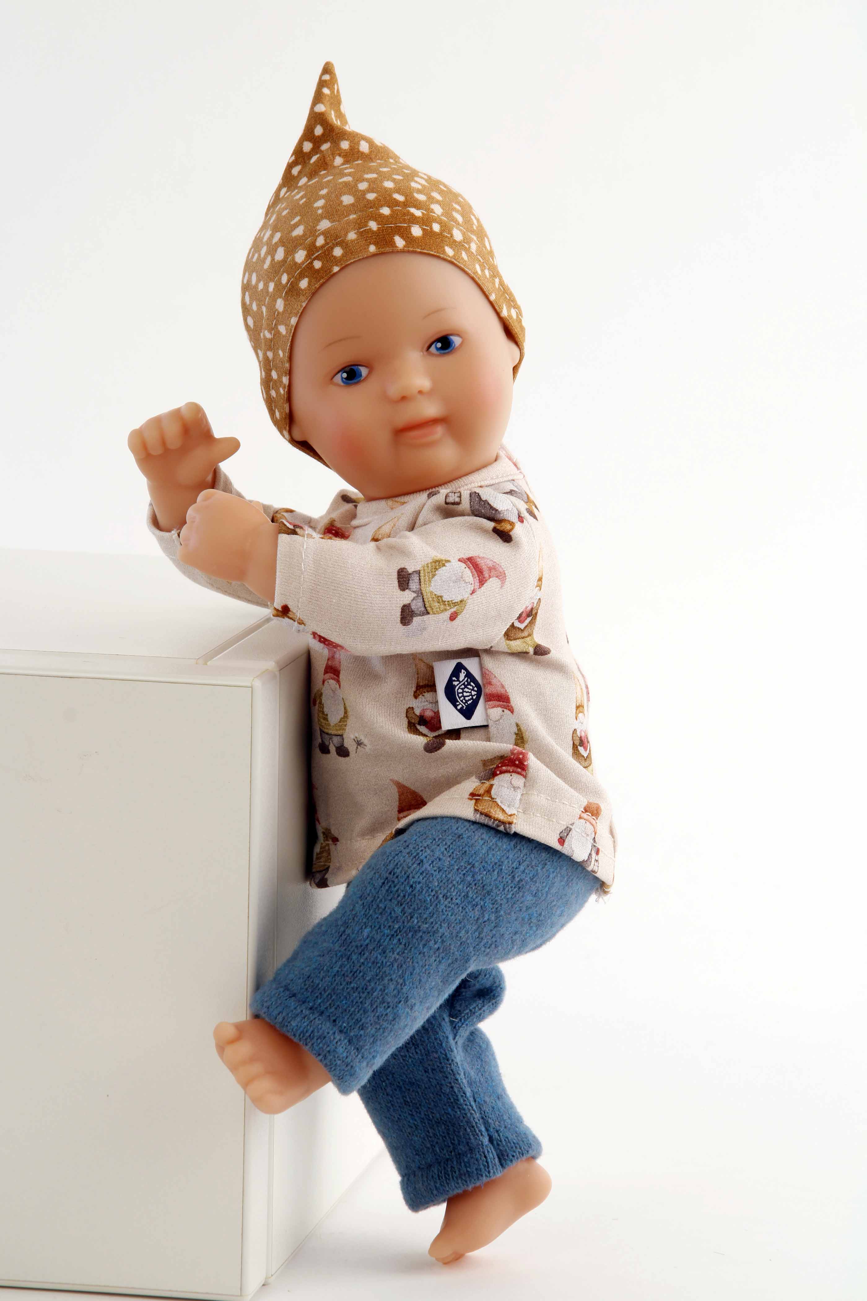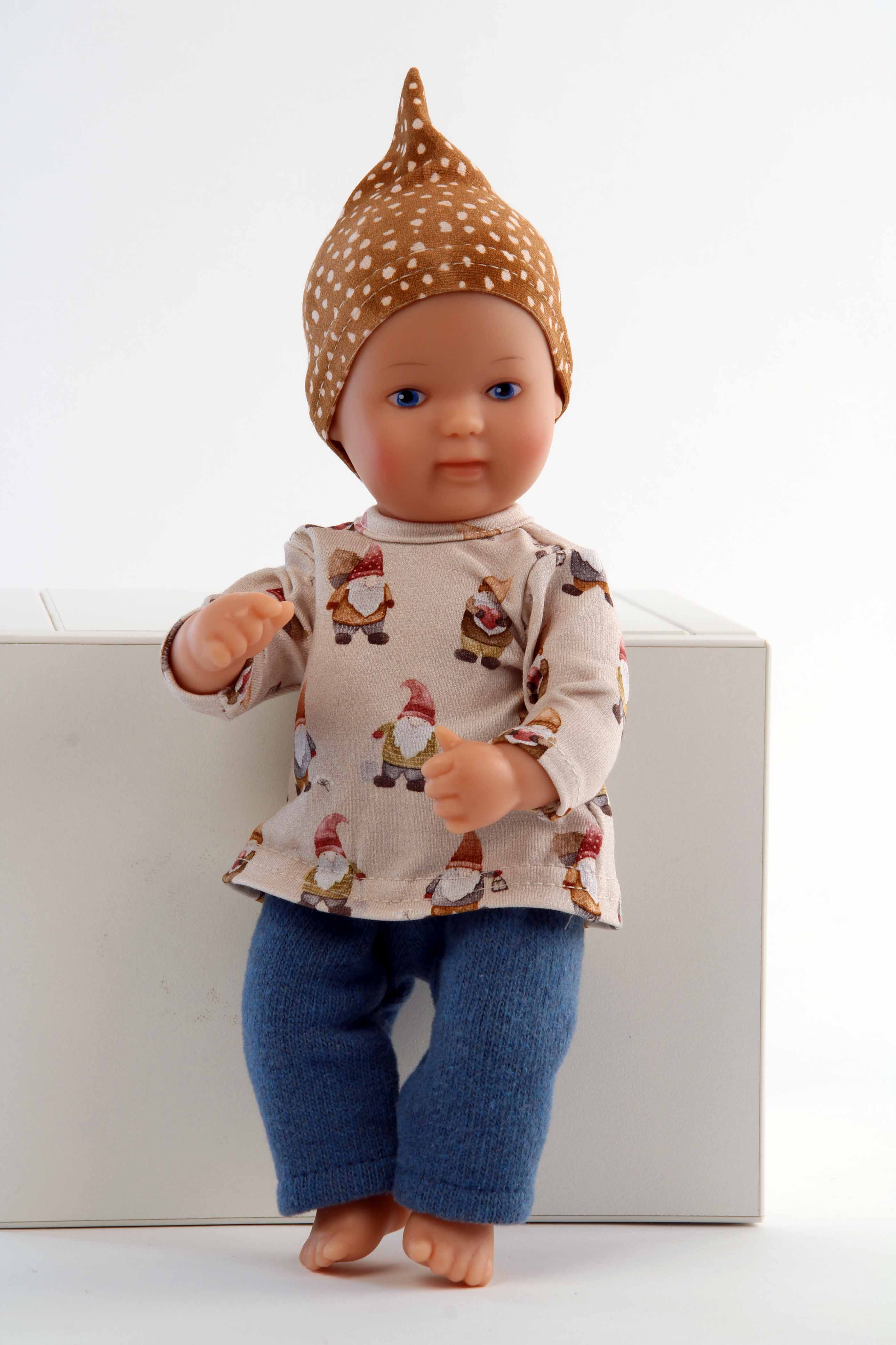 lustige Spielkleidung bestehend aus einer blauen Hose, einer Shirt mit Zwergen bedruckt und einer braun getupften Zipfelmütze. Die Kleidung ist bei 30 Grad per Hand waschbar. Die Kleidung wird komplett in Handarbeit in unserer Puppenmanufaktur in Rauenstein /Thüringen gefertigt. Diese Kleidung paßt auch unserem Schmuserle und Löckchen Gr. 30. Die Puppe gehört nicht zum Lieferumfang.