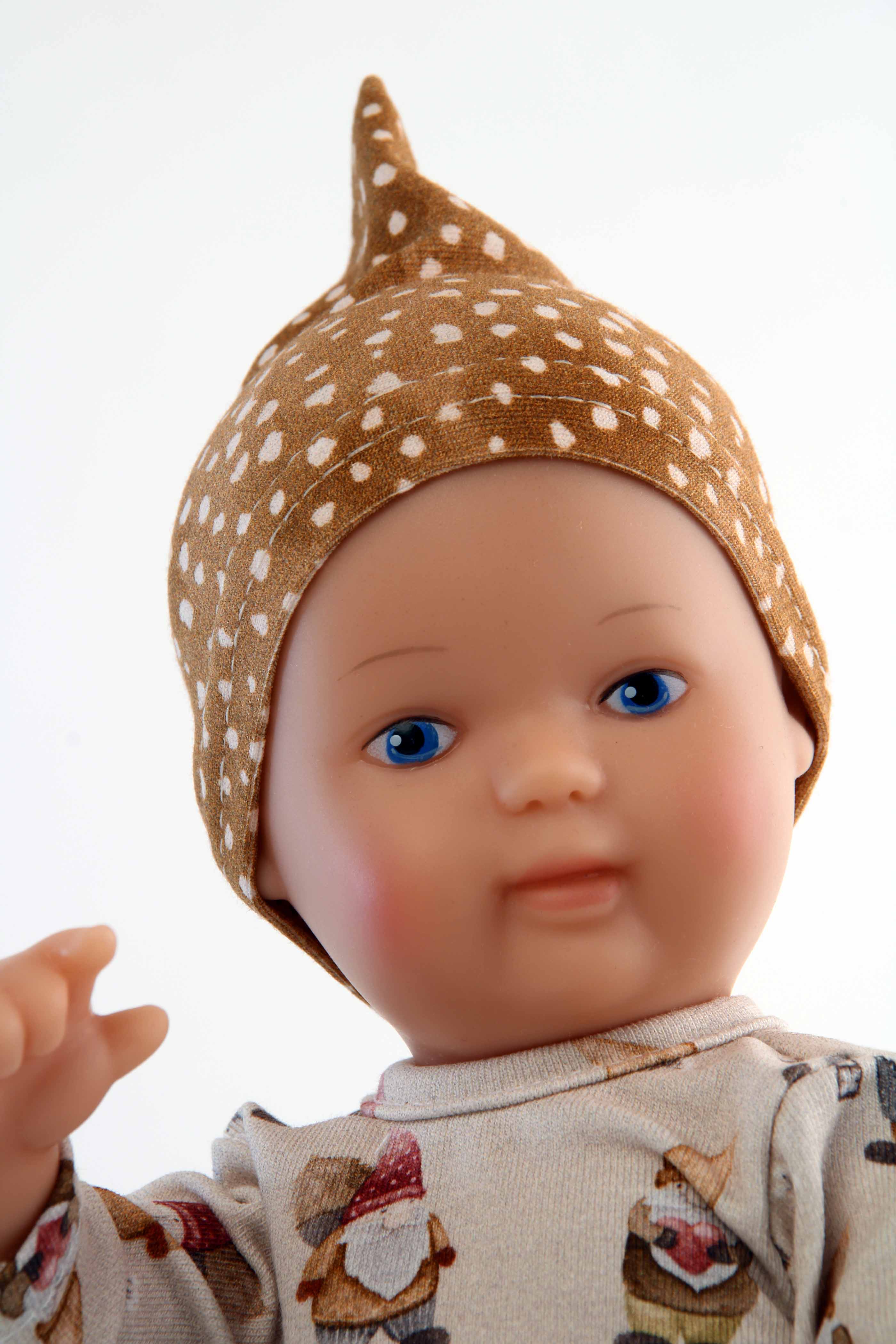 Puppe Mein 1. Baby 28 cm mit Malhaar und blauen Malaugen, Wichtelkleidung blau/braun