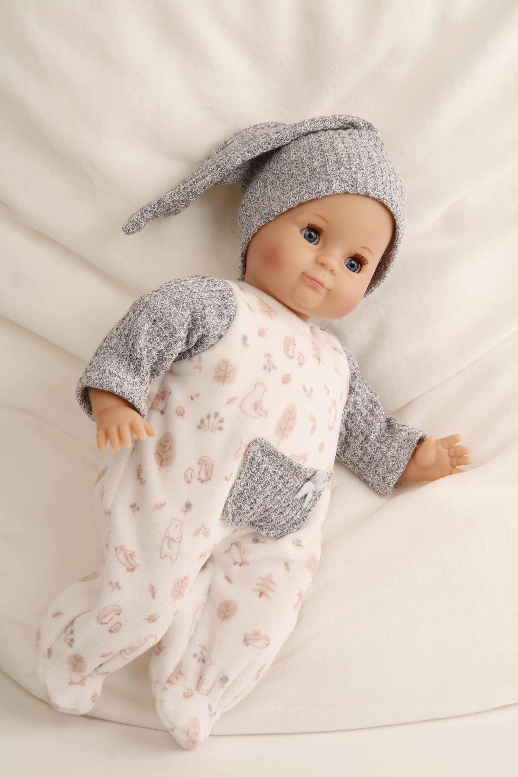 Produktinformationen "Puppe Schlummerle 32 cm mit Malhaar und blauen Schlafaugen, Overall weiß/blau/rose"