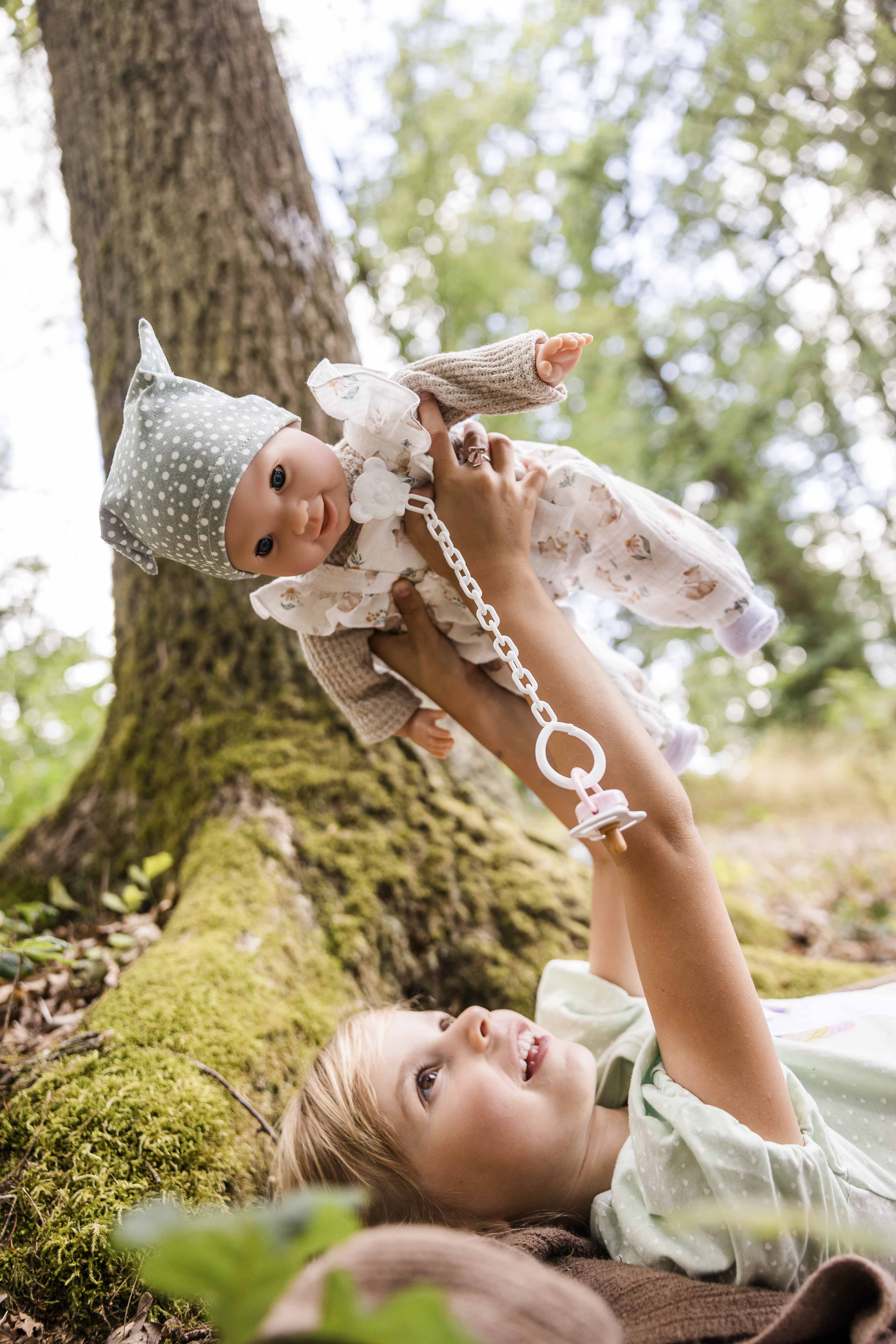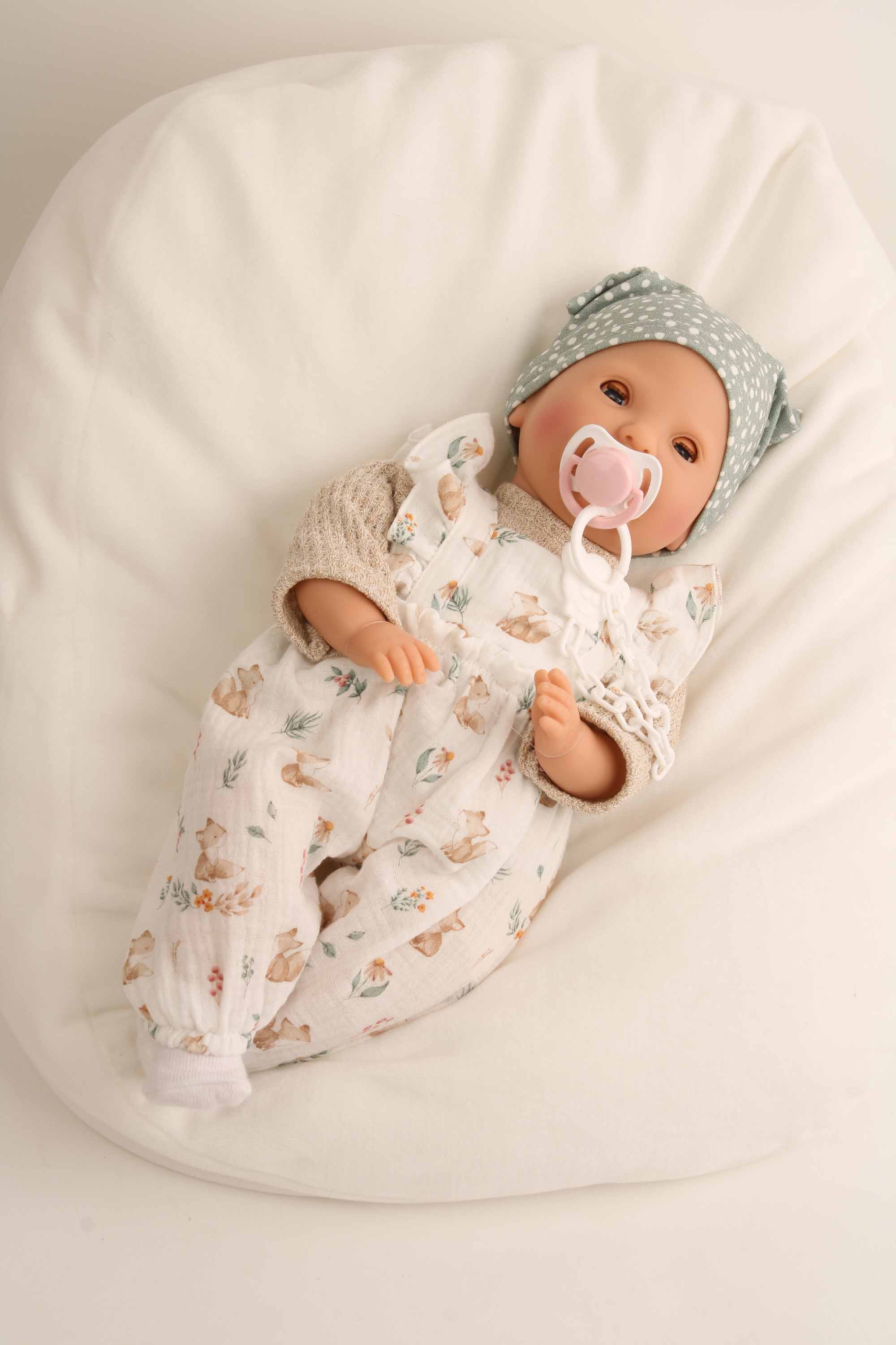 Kleidung betehend aus Latzhose mit Fuchsdruck, Pulli beige in Waffeloptik und grüne getupfte Mütze. Die Kleidung wird komplett in Handarbeit in unserer Puppenmanufaktur in Rauenstein /Thüringen gefertigt.Diese Kleidung kann per Hand bei 30 Grad gewaschen werden. Die Puppe und der Schnuller gehören nicht zum Lieferumfang. Das Schnullerset kann unter 0001018 extra dazu bestellt werden.Die Strümpfe 0041175 müssen extra dazu bestellt werden. Achtung: nicht geeignet für Kinder unter 36 Monate, da Kleinteile sich lösen können und verschluckt werden können.