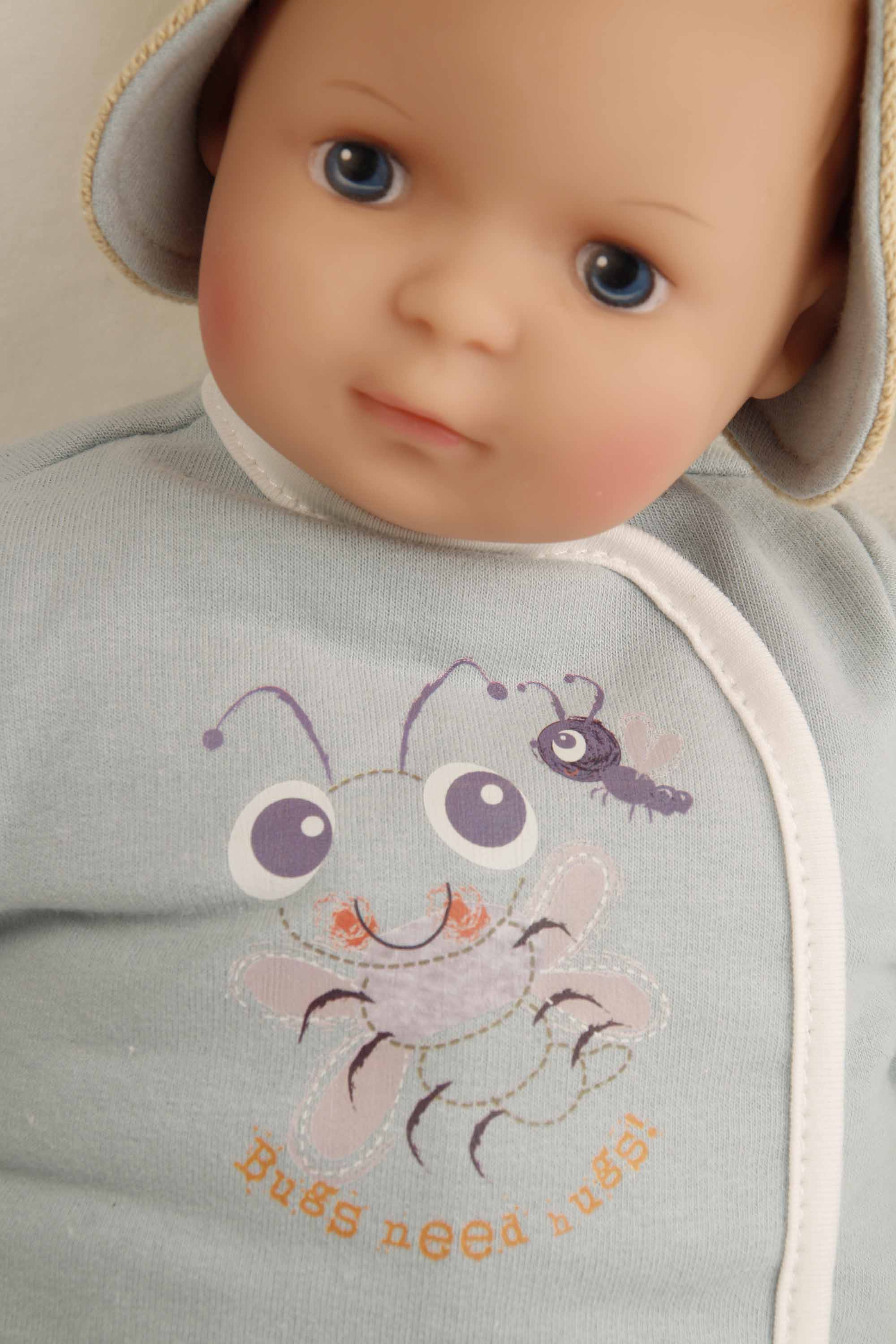 Puppe Schlenkerle 37 cm mit Malhaar und blauen Malaugen, Kleidung Raupe