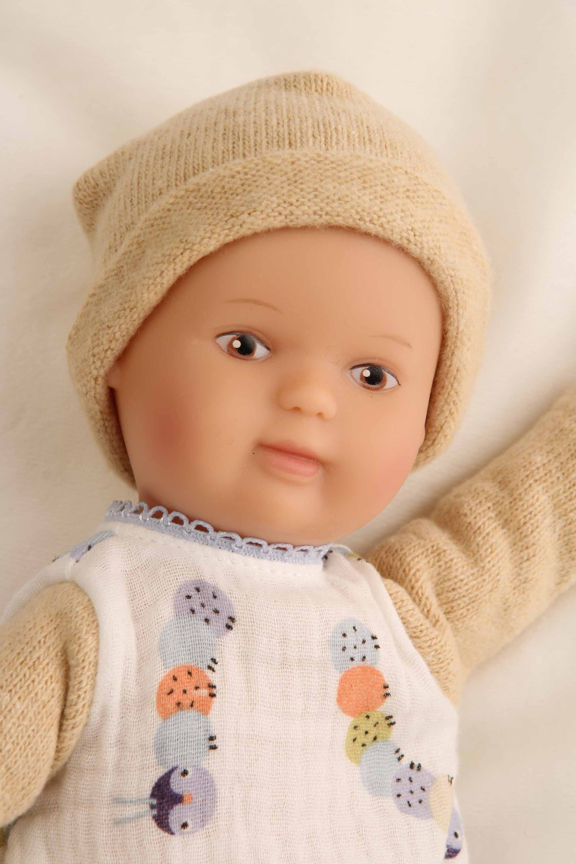 Puppe Schmuserle 30 cm Malhaar, braune Malaugen, Kleidung Raupe