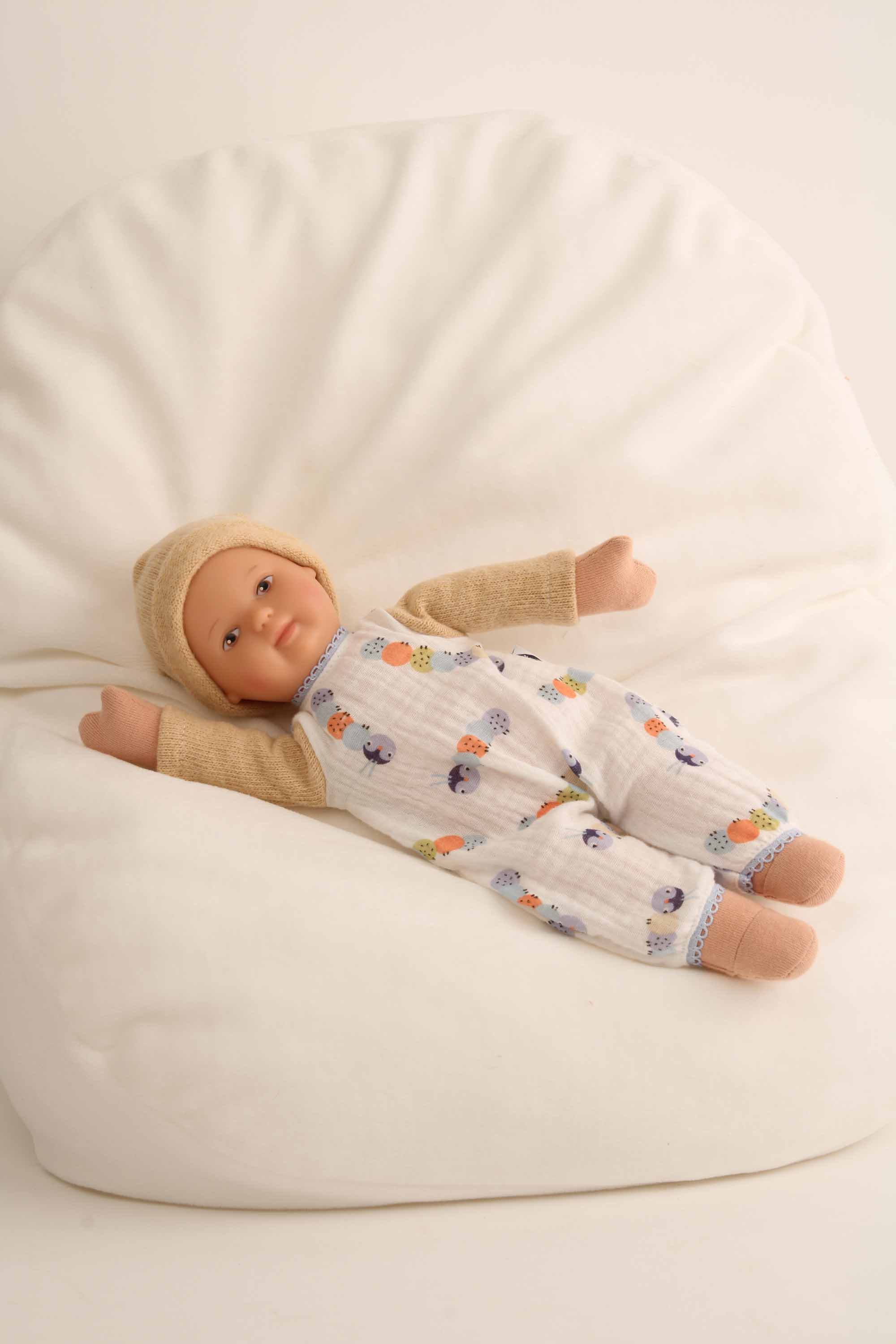 Kleidung bestehend aus einem Baumwolloverall mit Raupendruck und eingesetzten Strickärmeln in beige und einer passenden Strickmütze. Die Kleidung ist bei 30 Grad per Hand waschbar. Diese Kleidung paßt auch unserer Puppe Mein 1. Baby Gr. 28. Die Puppe gehört nicht zum Lieferumfang. Diese Kleidung wurde komplett in Handarbeit in unserer Puppenmanufaktur in Rauenstein/Thüringen gefertigt.