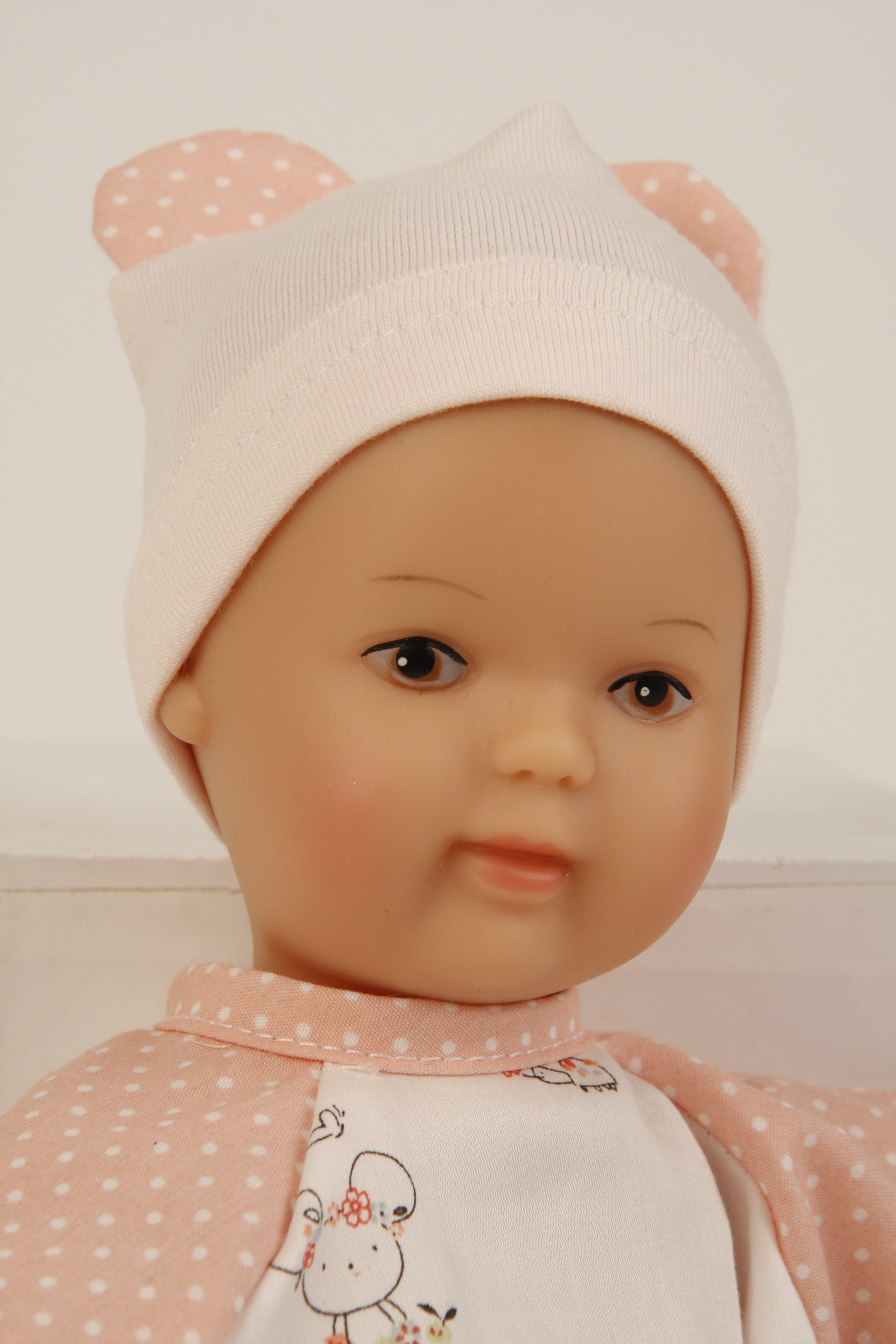 Puppe Schmuserle 30 cm Malhaar, braune Malaugen, Kleidung rose/weiss