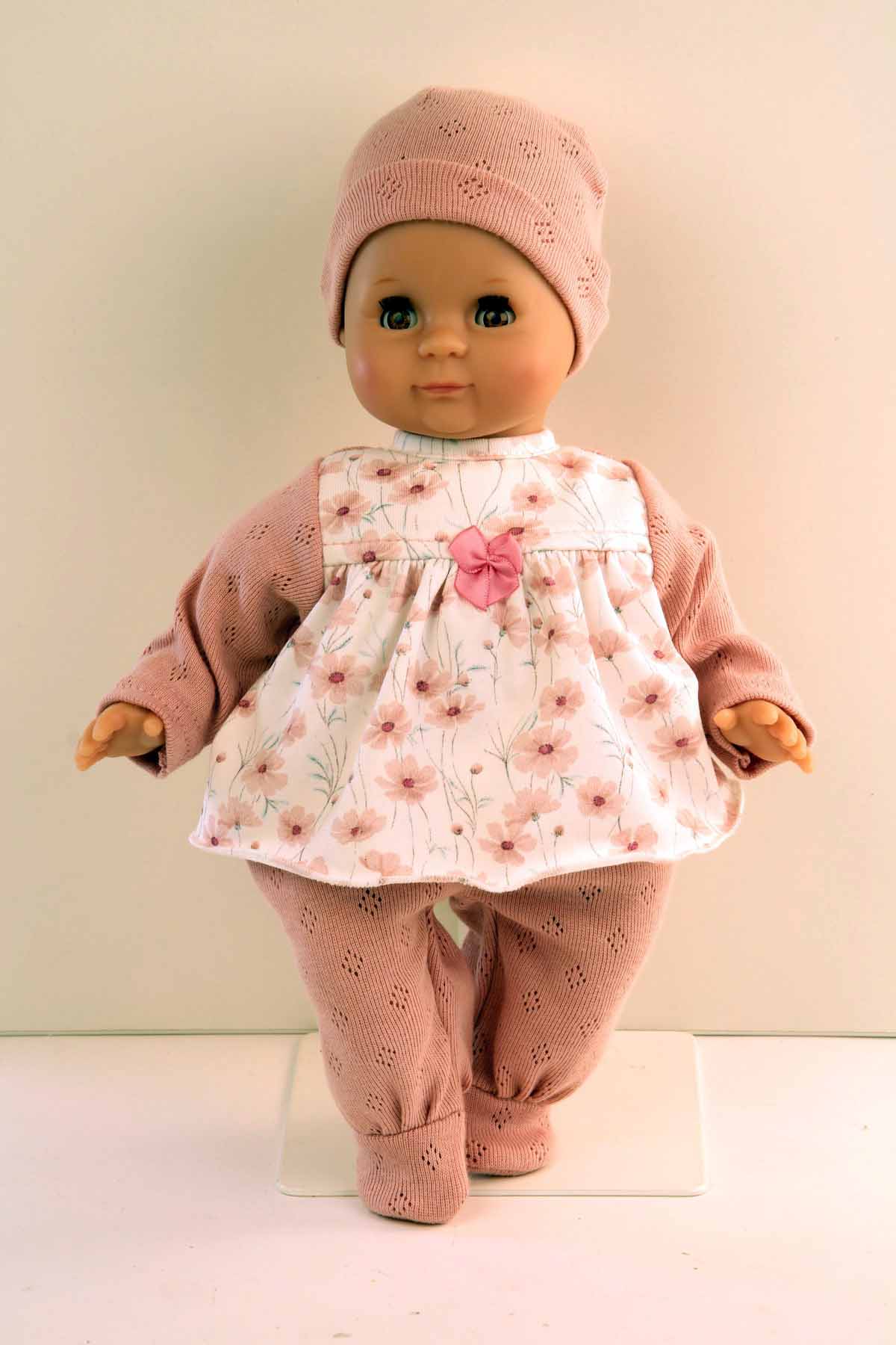 Kleidung Gr. 32 für Schlummerle bestehend aus einem rose Overall bedruckt mit Blättern, einer weißen Jacke und brauner Tupfenmütze. Die Kleidung wird komplett in Handarbeit in unserer Puppenmanufaktur in Rauenstein /Thüringen gefertigt. Diese Kleidung kann per Hand bei 30 Grad gewaschen weren. Die Puppe gehört nicht zum Lieferumfang. Achtung: nicht geeignet für Kinder unter 36 Monate, da Kleinteile sich lösen können und verschluckt werden können.