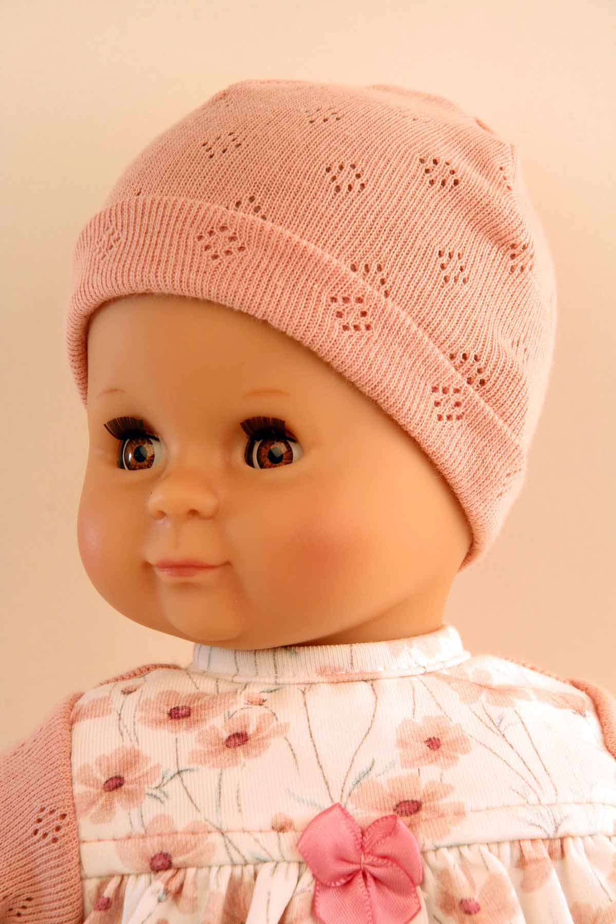 Mein erstes Schlummerle, die beliebteste und bekannteste Puppe, ohne Haare für die Kleinsten. Ein unverwechselbares Gesicht vereint Qualität und Spielwert und begeistert schon seit Generationen unsere Puppenmuttis.Die Puppe wird in unserer eigenen Puppenmanufaktur in Rauenstein/Thüringen hergestellt. Arme, Beine und Kopf sind aus Vinyl, sie hat lustige braune Schlafaugen und gemalte Haare. Es trägt einen rose Strickoverall mit angenähtem Blumenkleid und eine Strickmütze. Die Kleidung ist leicht an- und ausziehbar und bei 30 Grad per Hand waschbar.