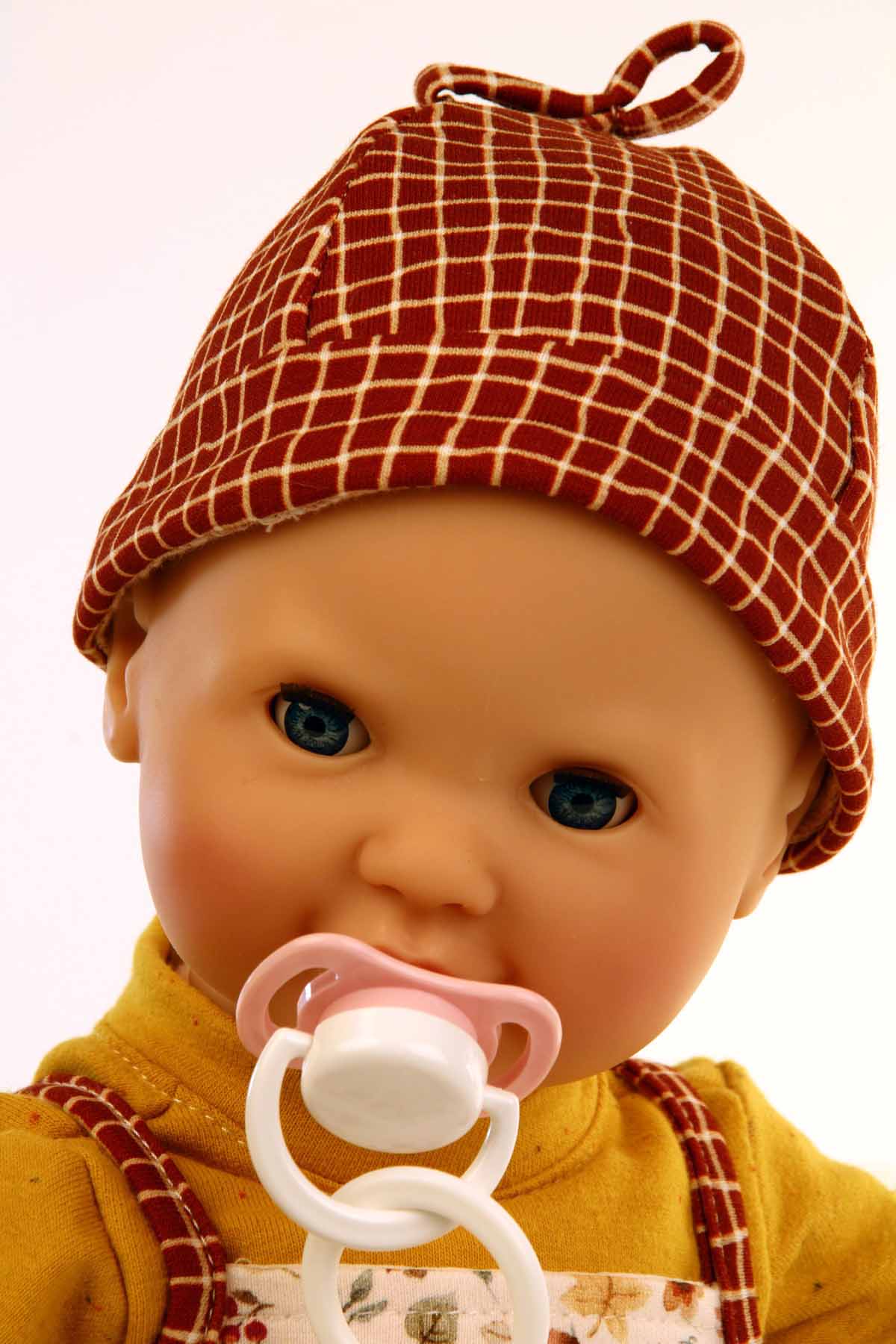 Kleidung betehend aus blumenbedruckter Latzhose, gelbem Shirt, Söckchen und Mütze rostrot kariert. Die Kleidung wird komplett in Handarbeit in unserer Puppenmanufaktur in Rauenstein /Thüringen gefertigt. Diese Kleidung kann per Hand bei 30 Grad gewaschen werden. Die Puppe und der Schnuller gehören nicht zum Lieferumfang. Das Schnullerset kann unter 0001018 extra dazu bestellt werden. Achtung: nicht geeignet für Kinder unter 36 Monate, da Kleinteile sich lösen können und verschluckt werden können.